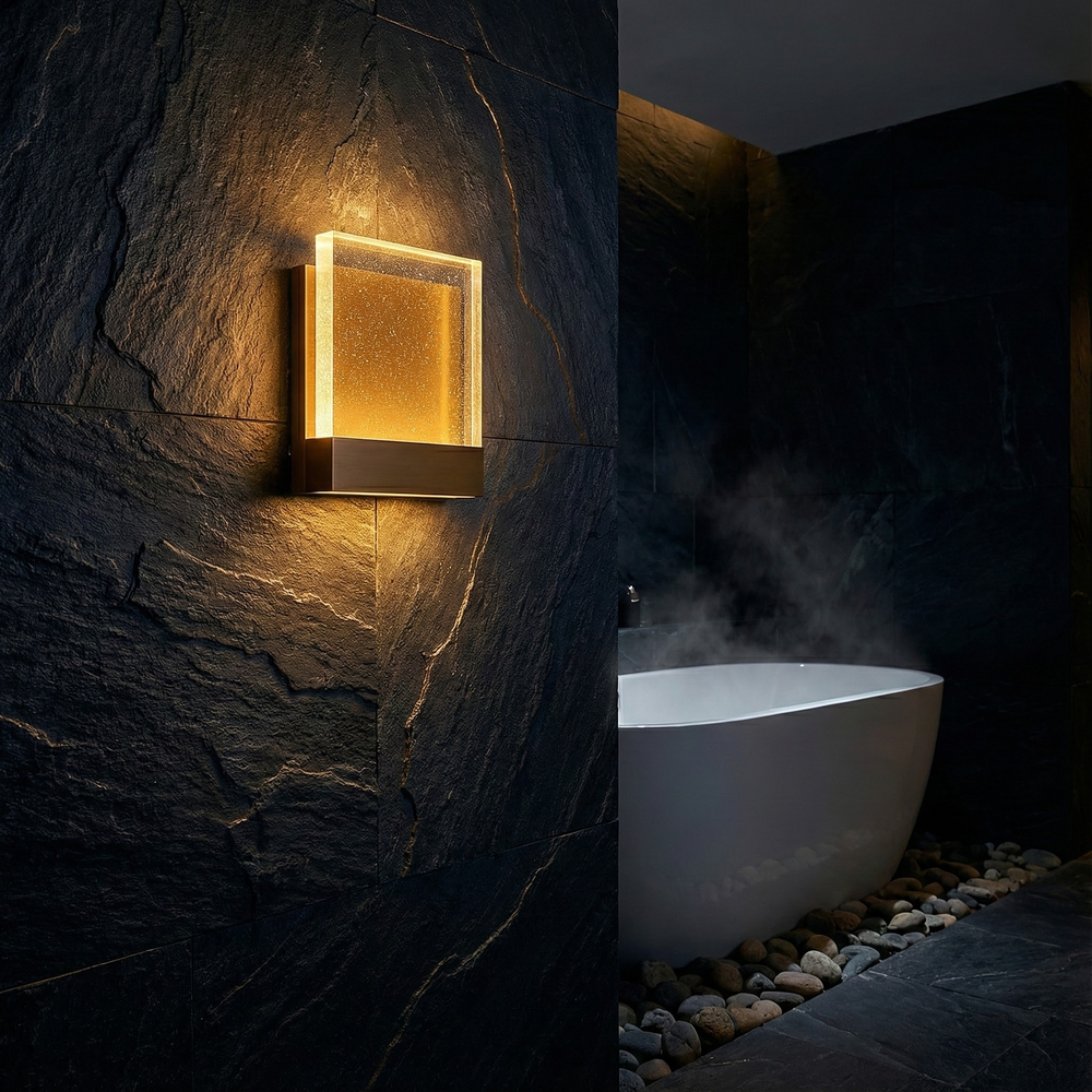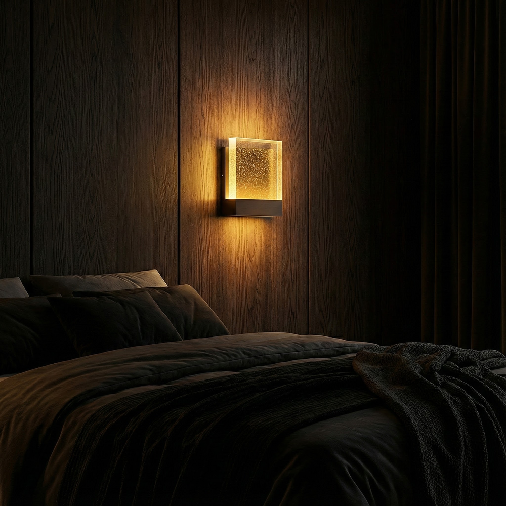 A contemporary wall light defined by crisp geometry and softly textured bubble glass illumination.