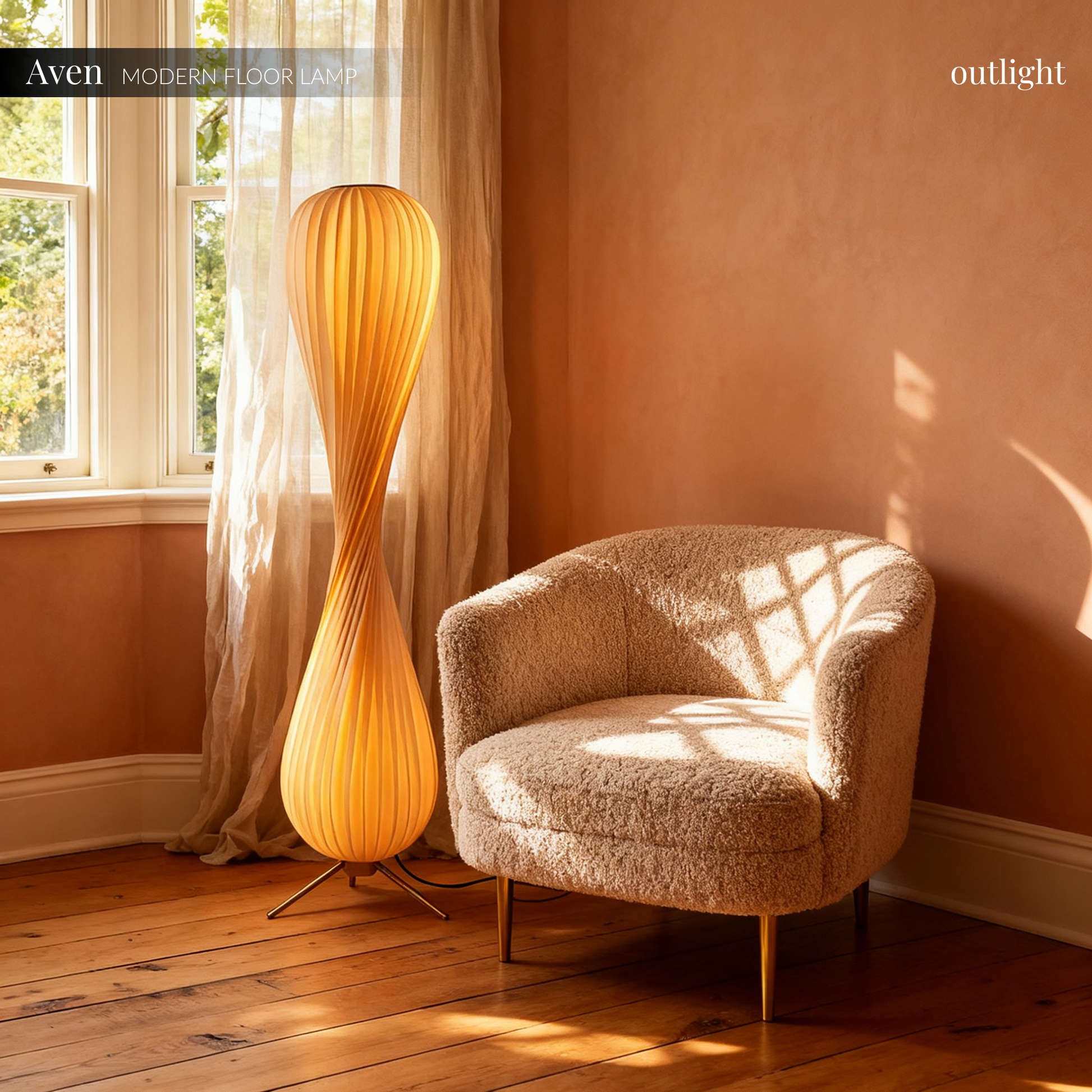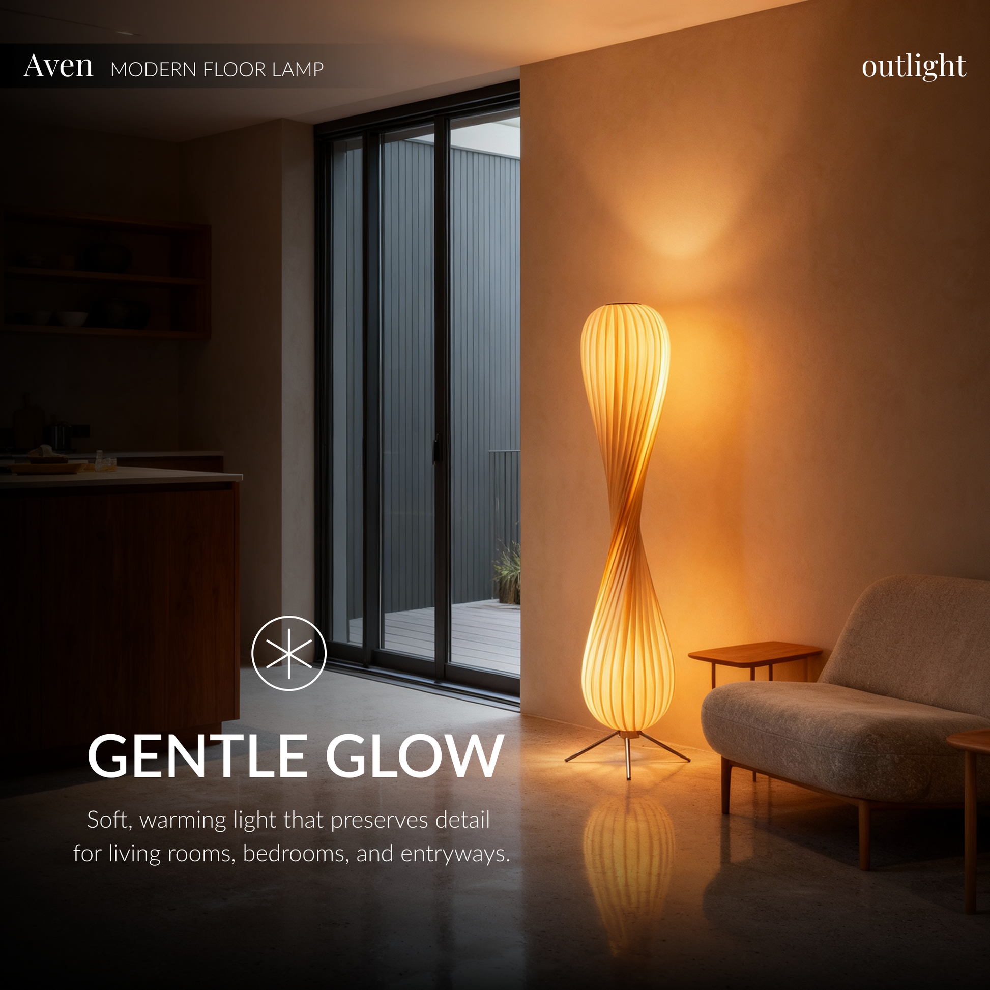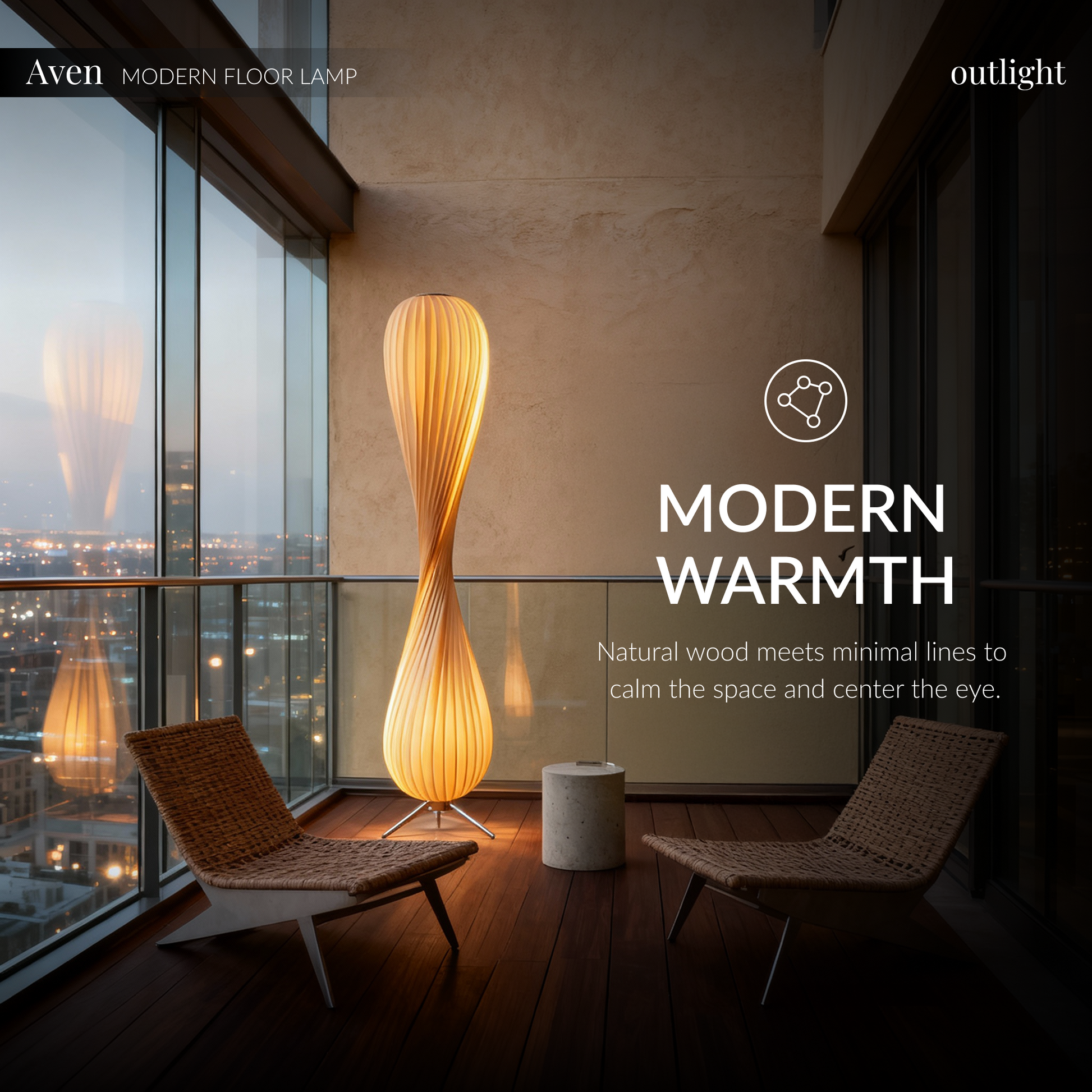 Embracing the wabi-sabi principle of imperfect beauty, the Aven lamp features a dynamic, twisted silhouette crafted from natural wood. This sculptural piece diffuses a soft, dimmable glow, creating an understated and serene centerpiece for any modern interior.