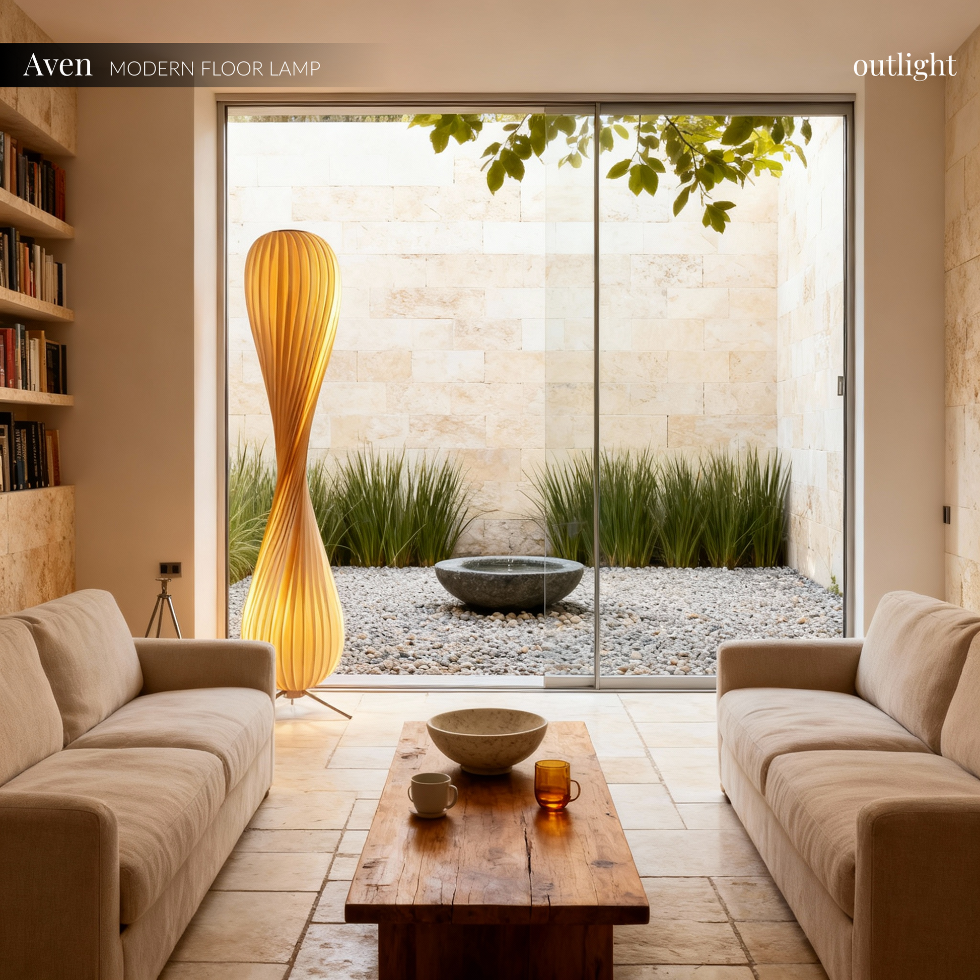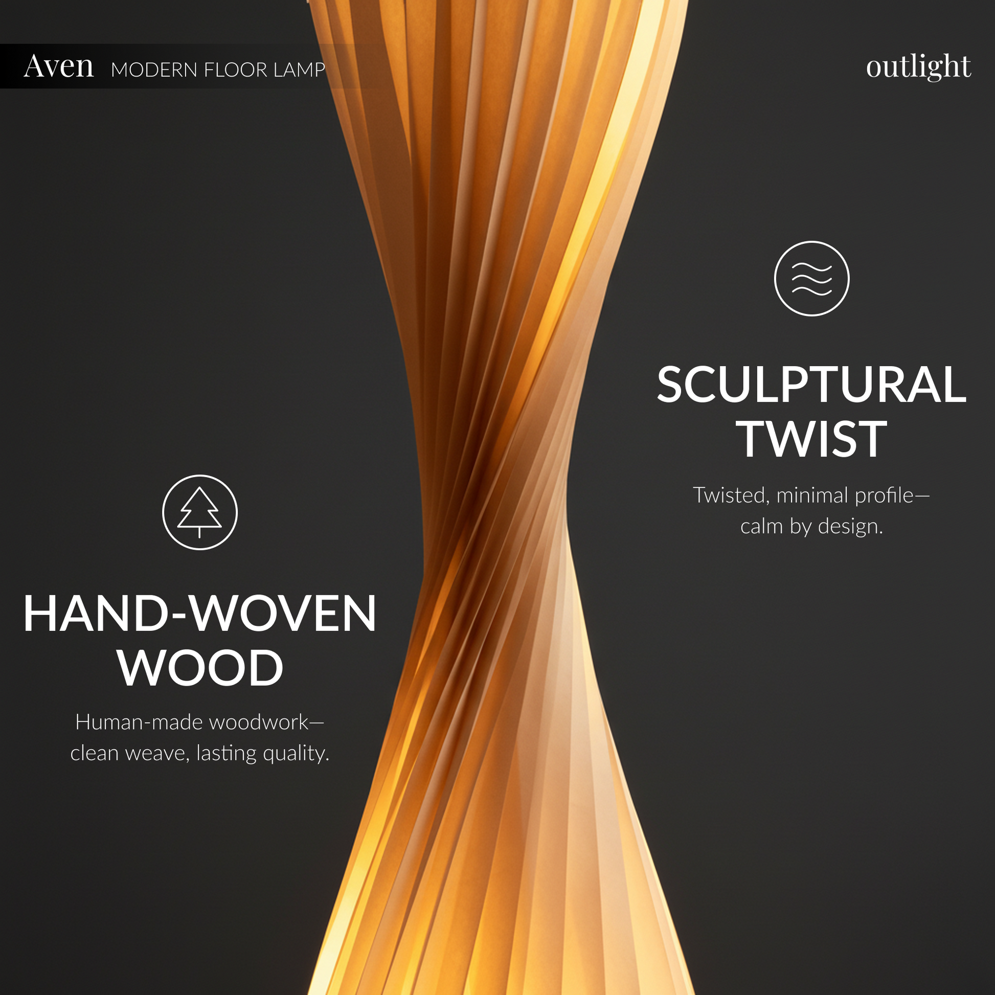 Embracing the wabi-sabi principle of imperfect beauty, the Aven lamp features a dynamic, twisted silhouette crafted from natural wood.