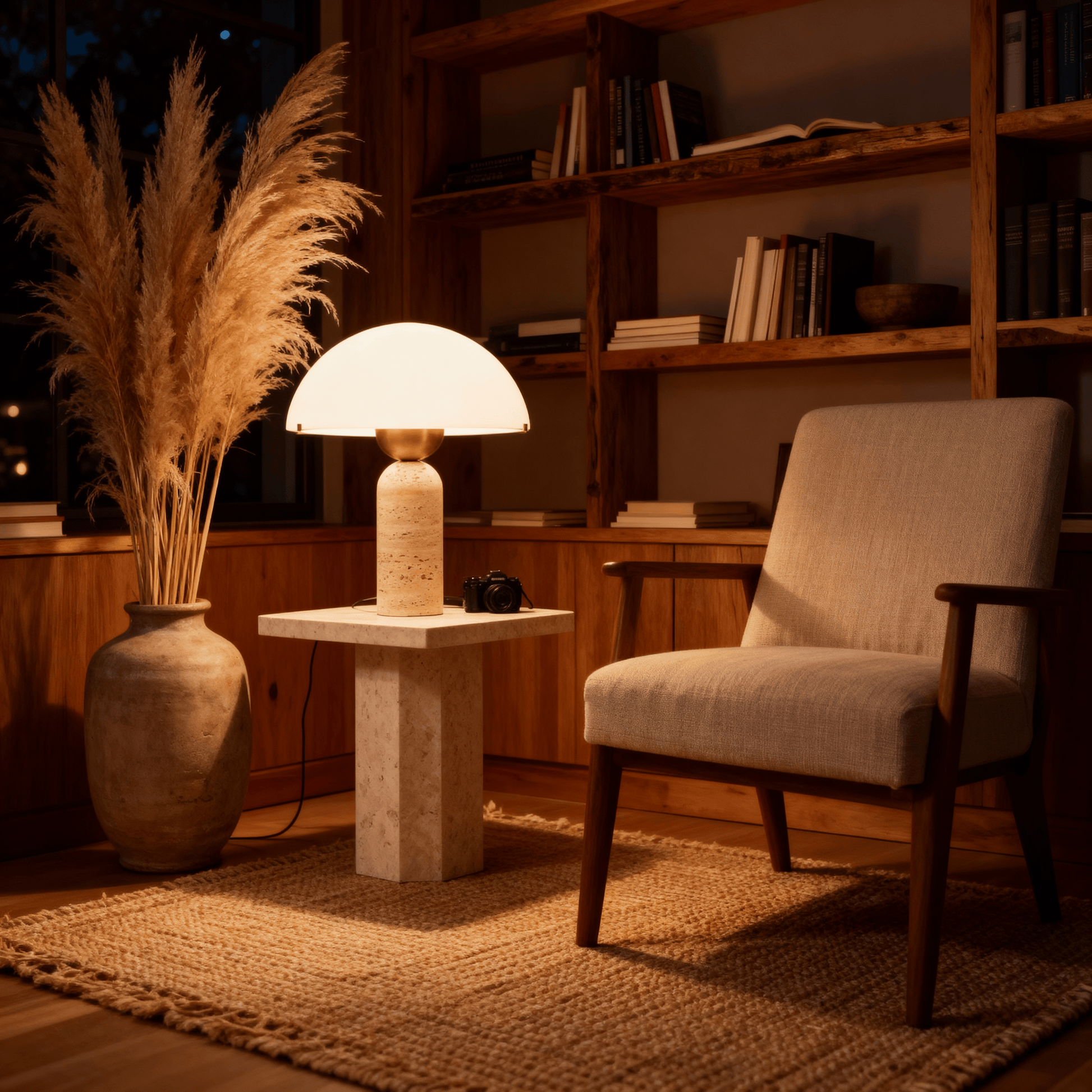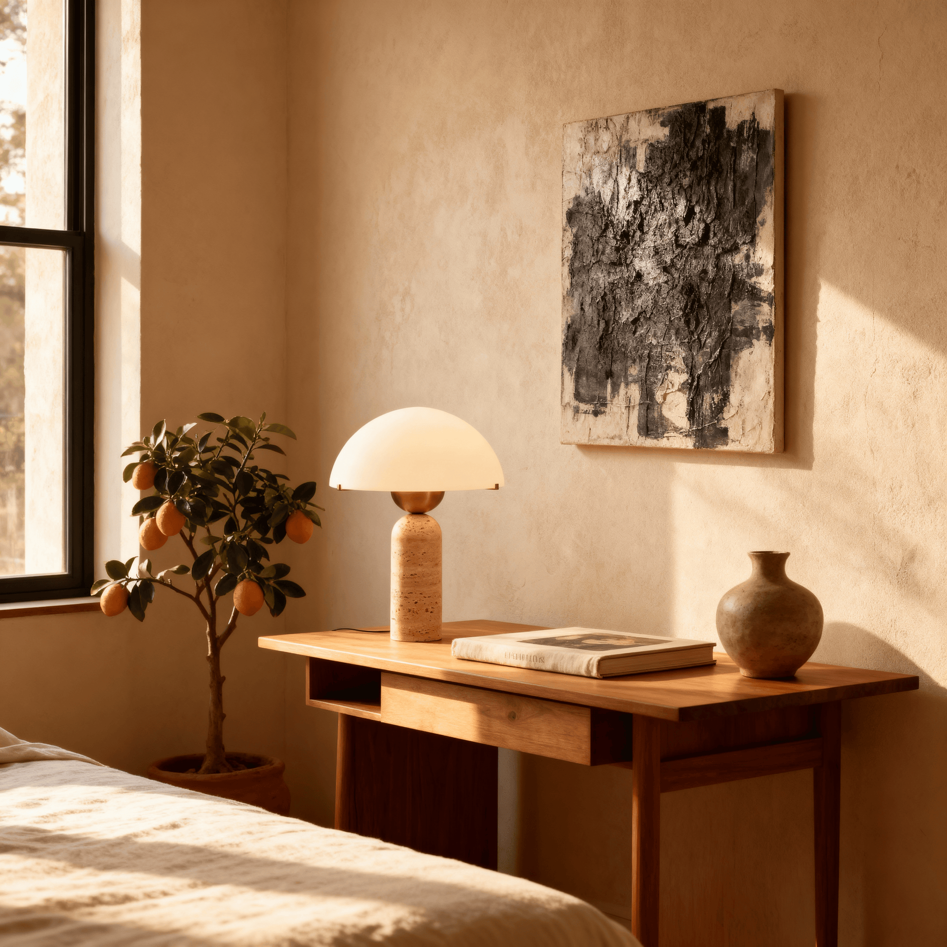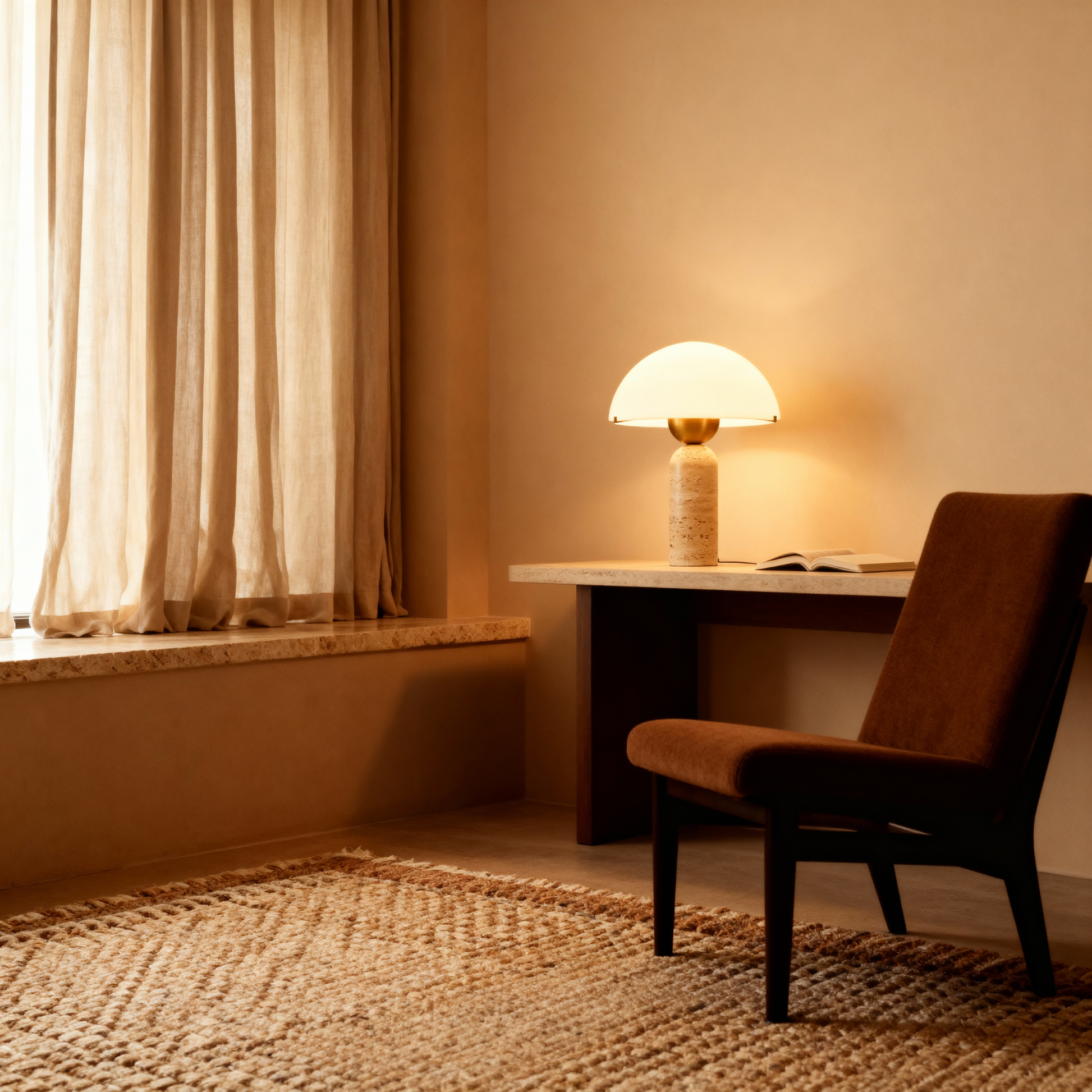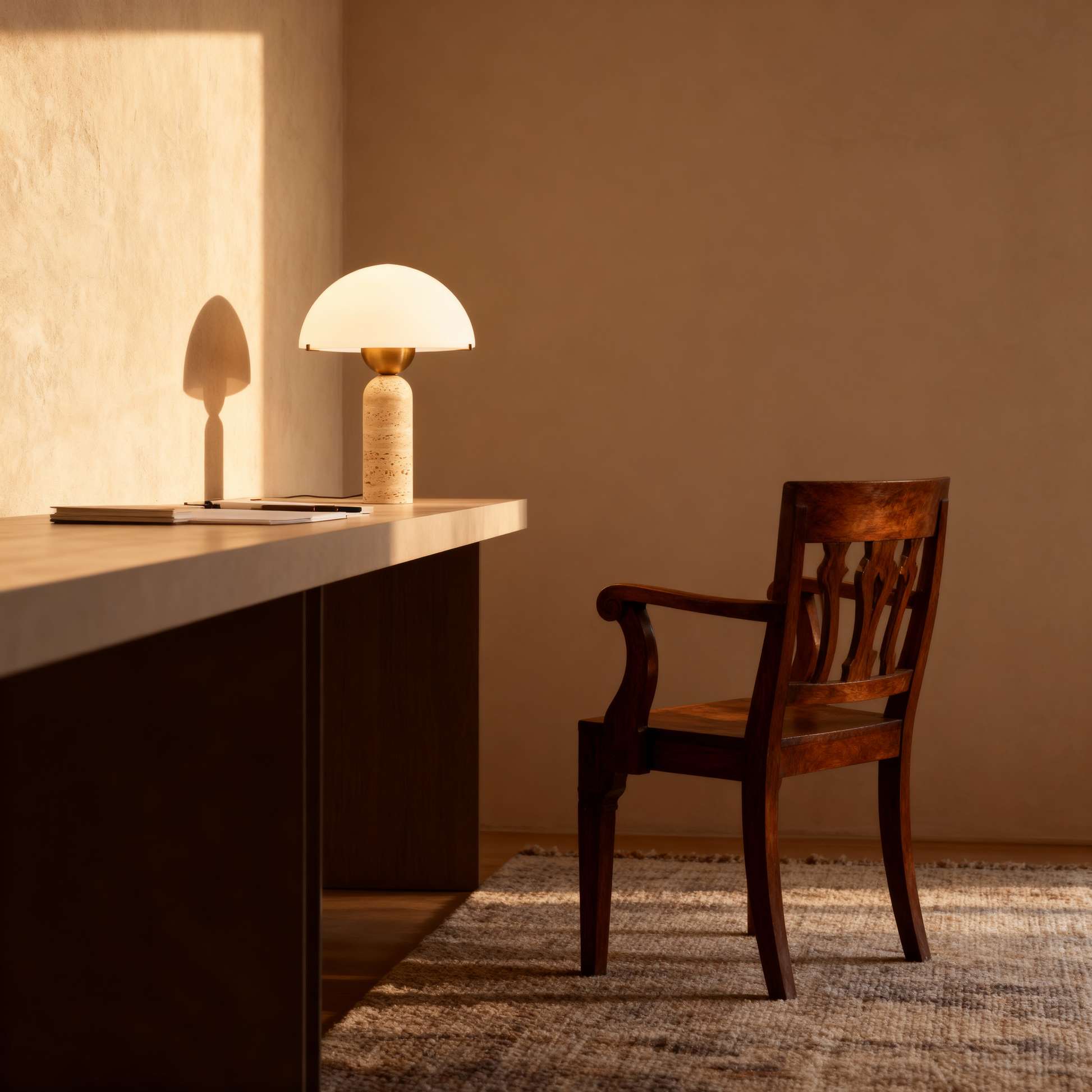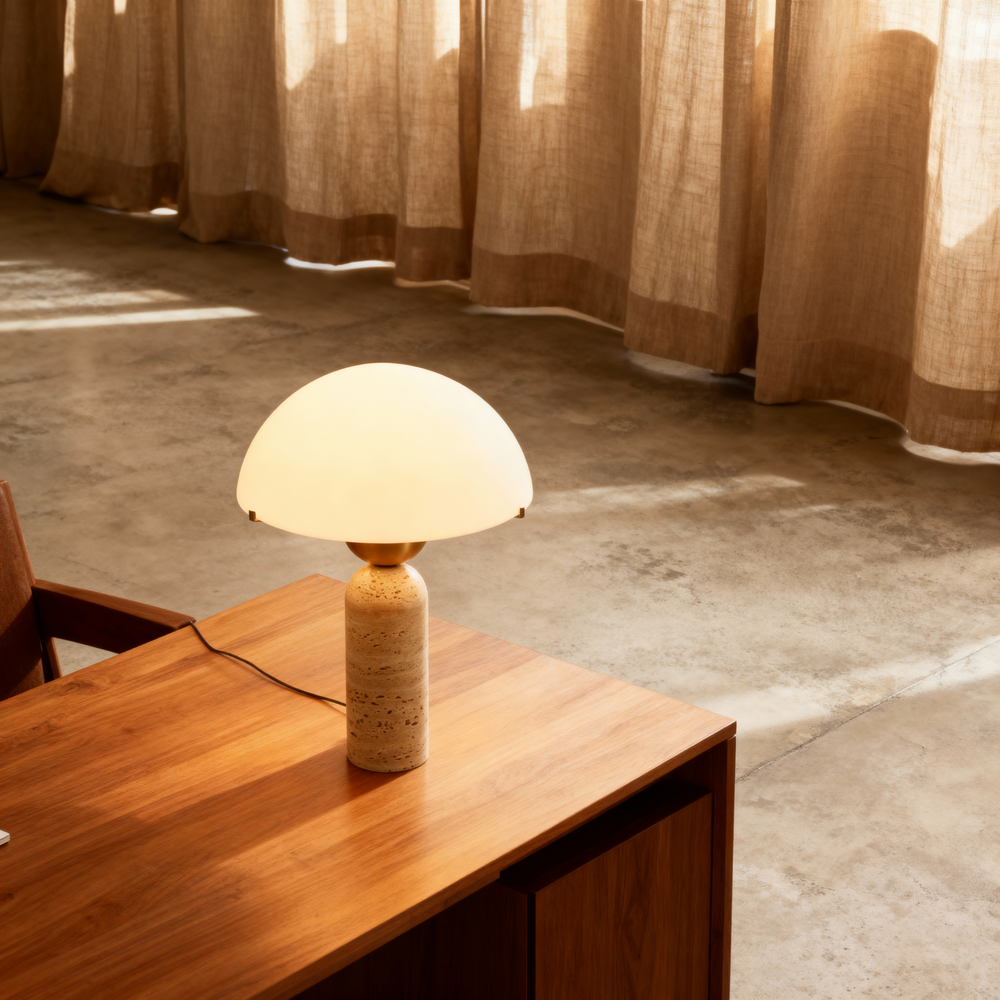 A desk lamp that celebrates travertine’s natural calm through balanced form and softly diffused illumination.