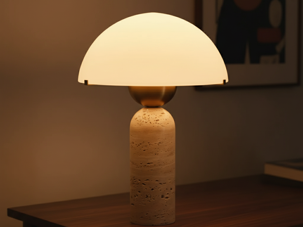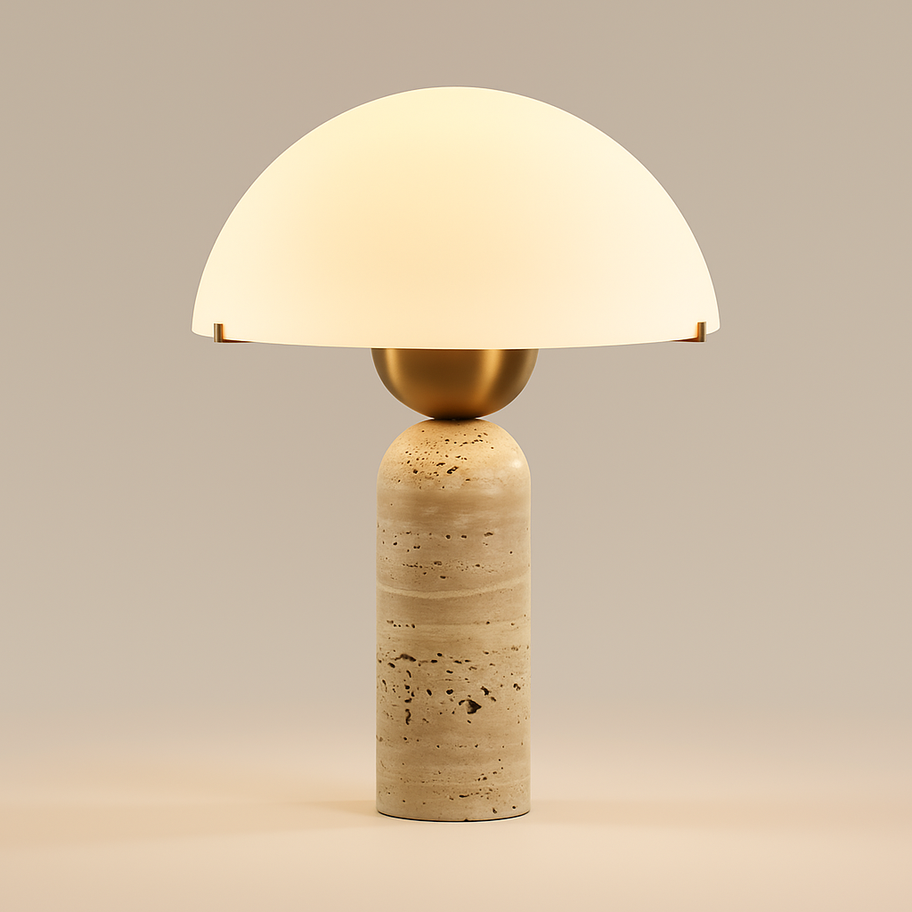 Blair’s curved glass dome and solid travertine base create a warm, balanced composition that diffuses light evenly. The piece combines elemental materiality with a quiet architectural rhythm, making it a versatile accent for living or working spaces.