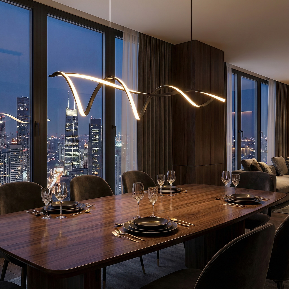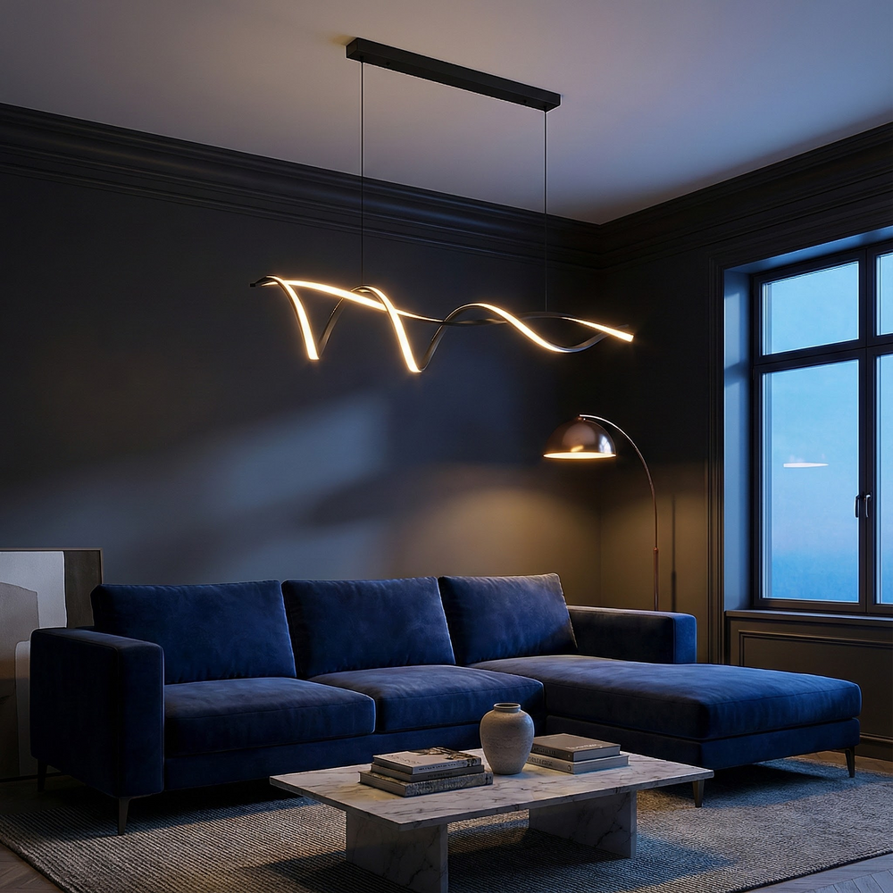 Bliss introduces a sense of motion through light, with a flowing silhouette that feels both artistic and architectural. Suspended above a table or open space, its seamless curves create a balanced glow that elevates modern interiors with quiet confidence and visual rhythm.