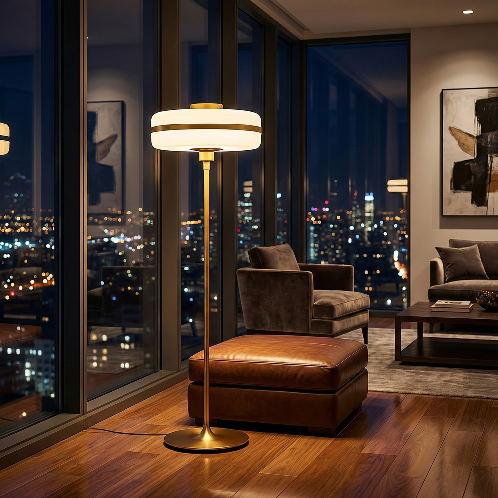 A slim architectural floor lamp that blends warm ambient light with polished modern elegance.