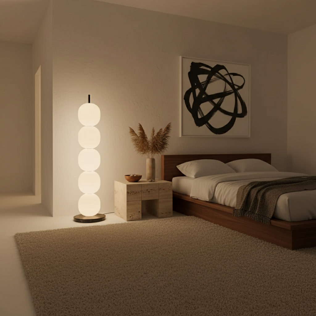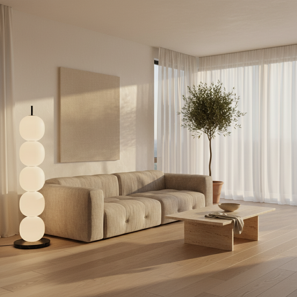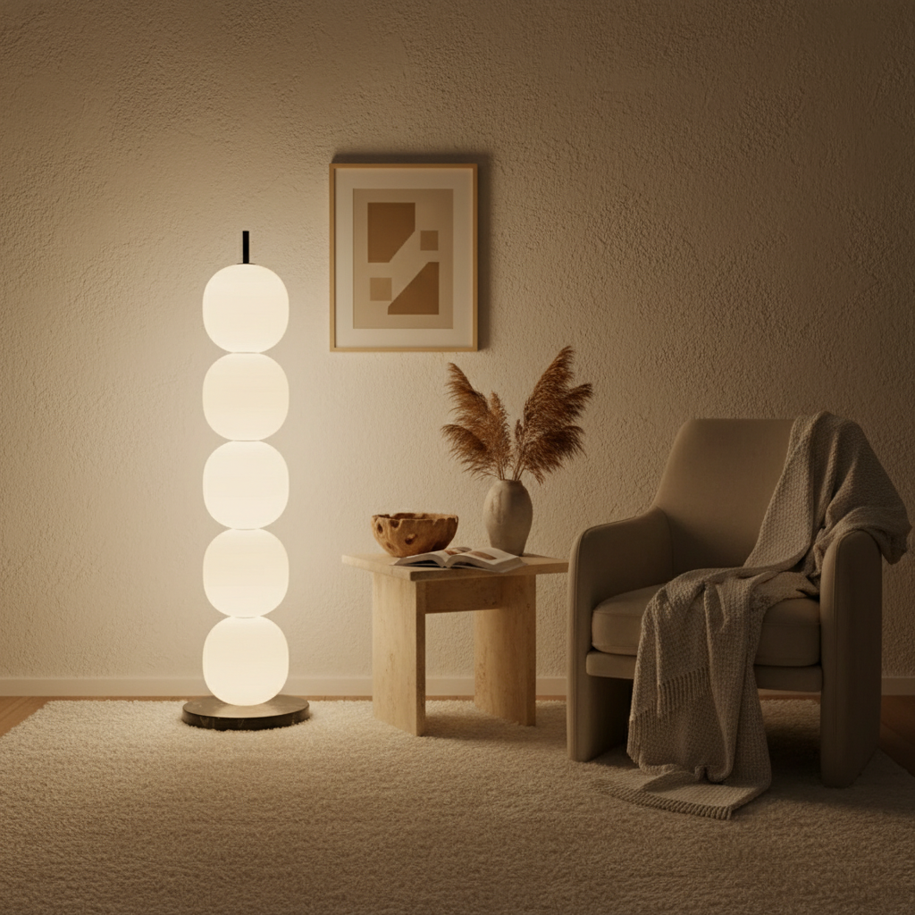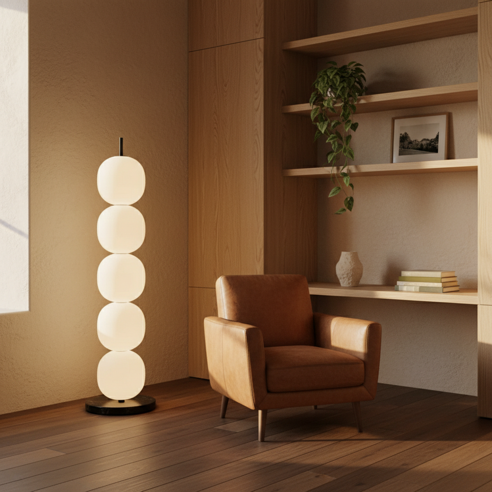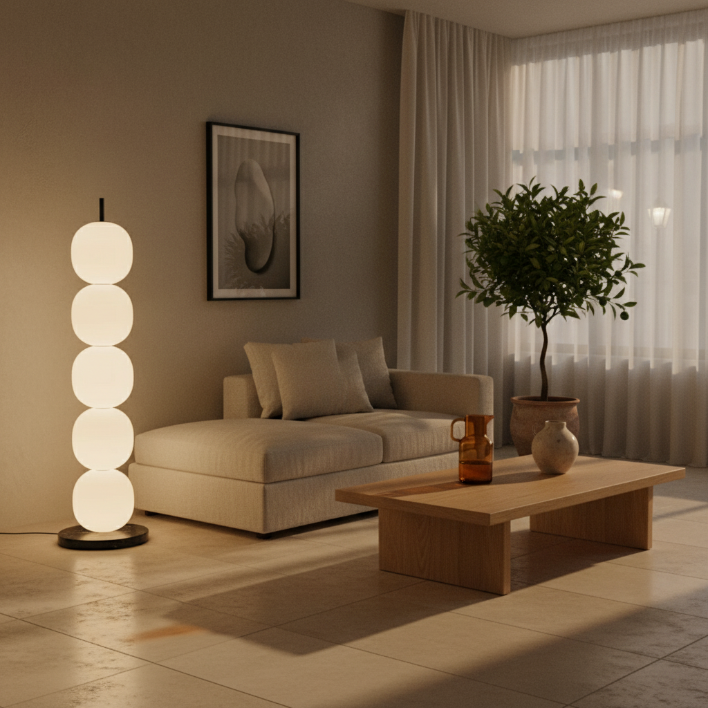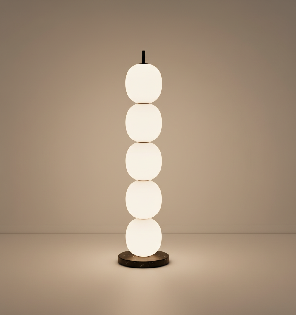 Softly radiating through layered glass orbs, Caelus evokes an elevated stillness. Its vertical rhythm and warm luminosity transform any corner into a gentle sculptural focal point.