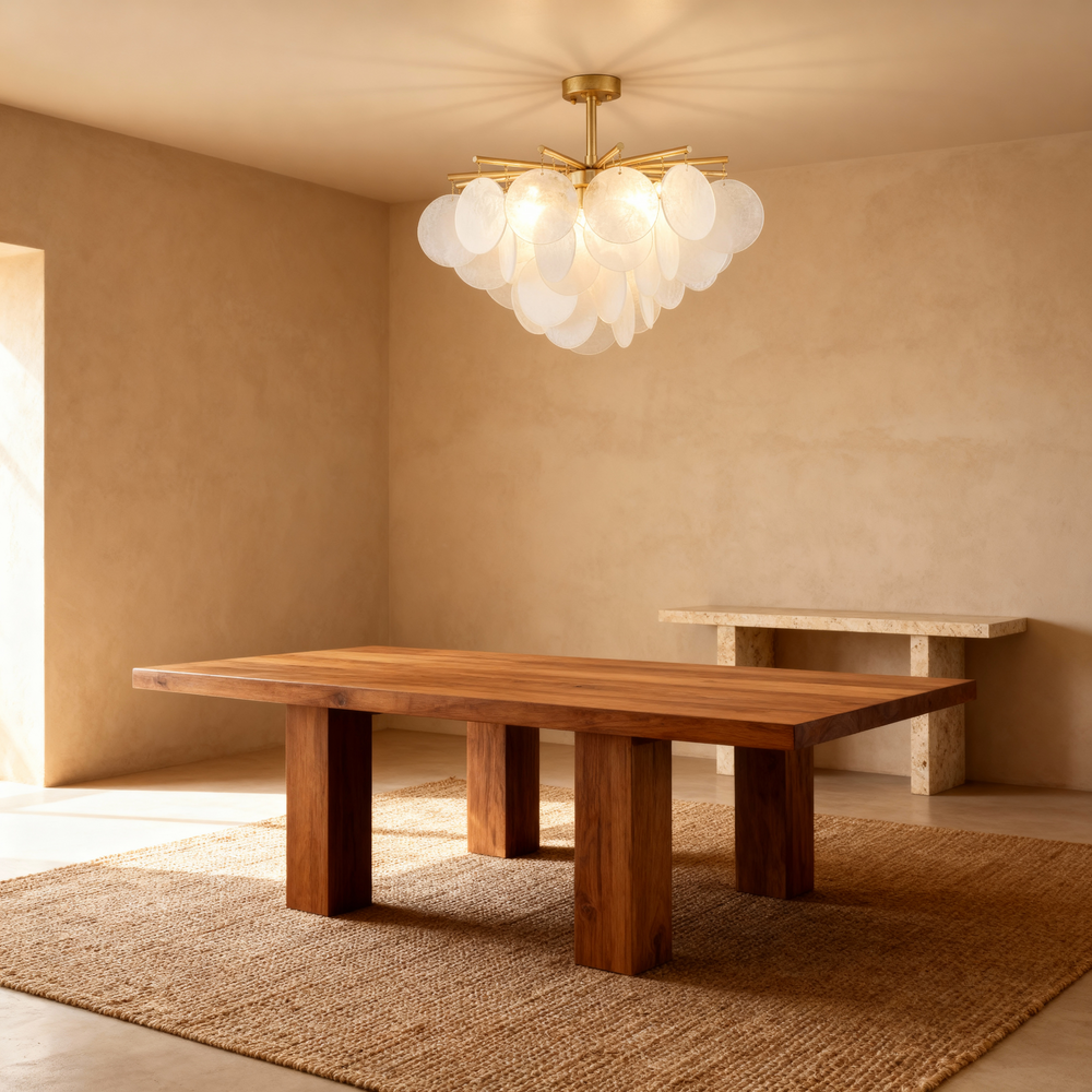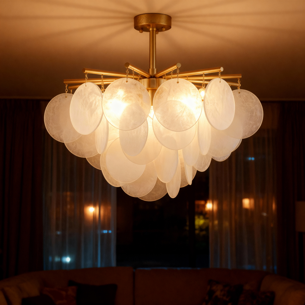 A layered glass chandelier that brings warmth, balance, and modern refinement to living or dining spaces.