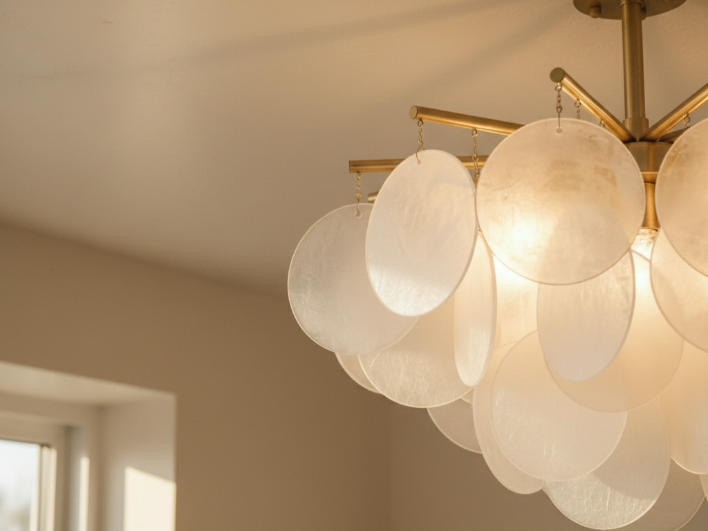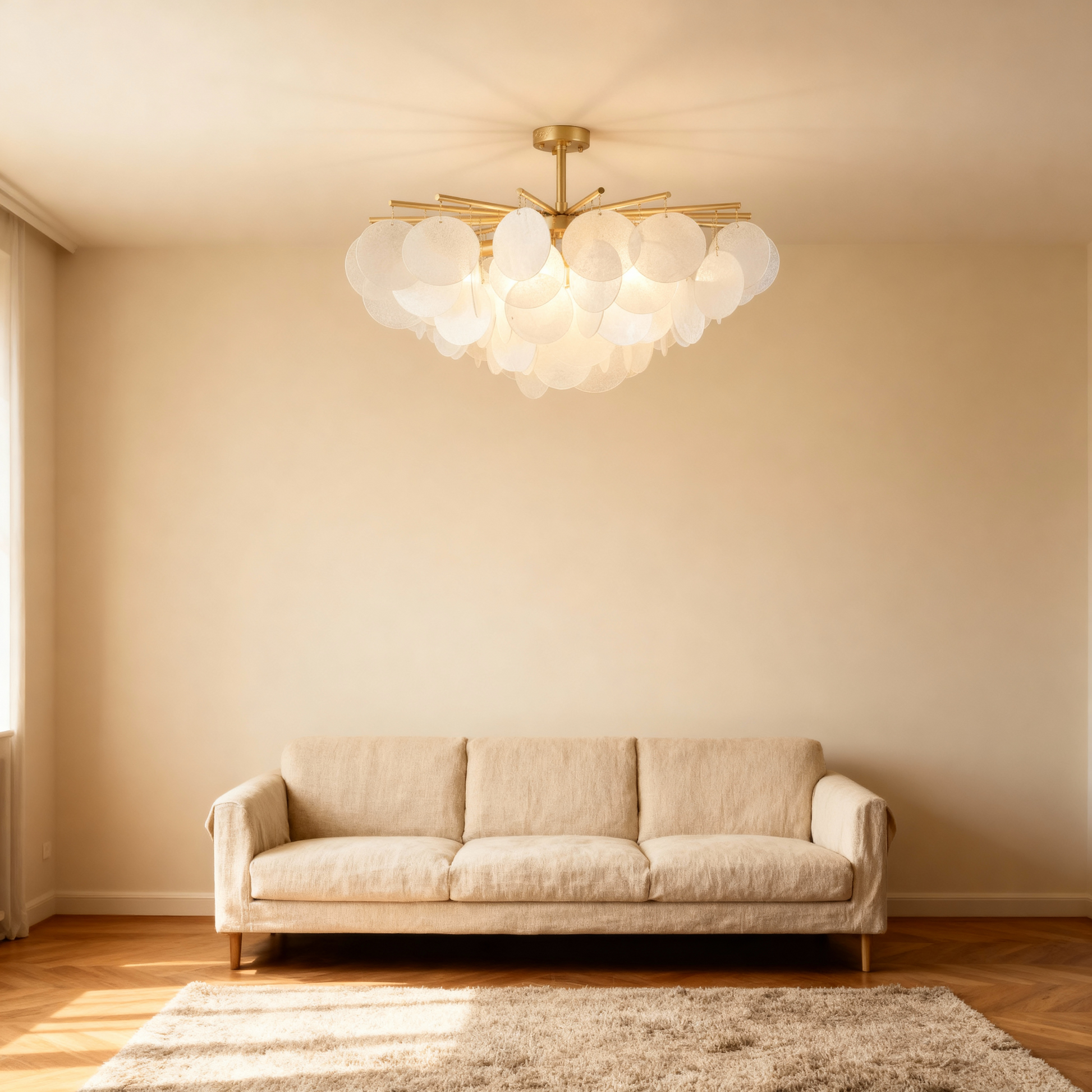 Cala’s design pairs a polished gold frame with softly frosted glass discs that scatter light into a warm, even radiance. Its modern silhouette complements minimalist interiors, offering a statement piece that feels both architectural and inviting.
