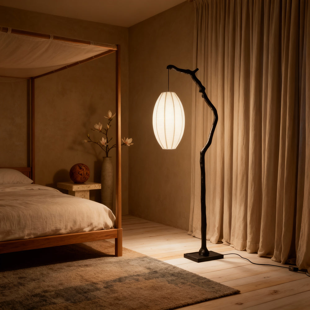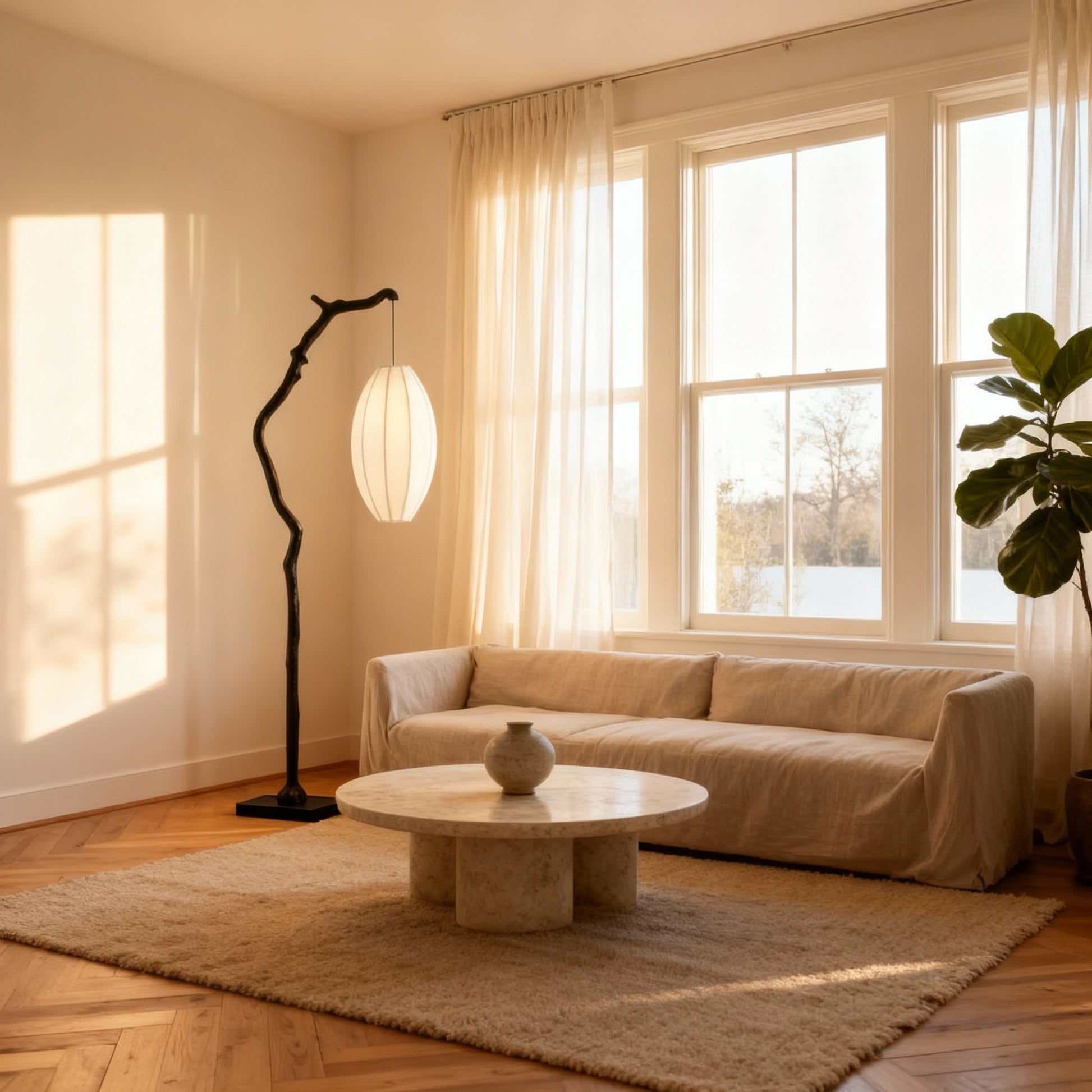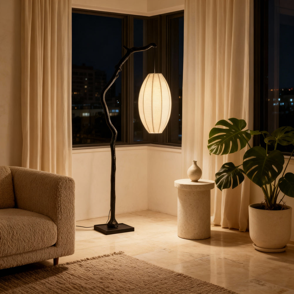 Cavon features an organic stem and a softly illuminated shade that work together to create a restorative atmosphere. Its calm glow settles gracefully into the background, supporting the peaceful balance of Japandi-influenced spaces.