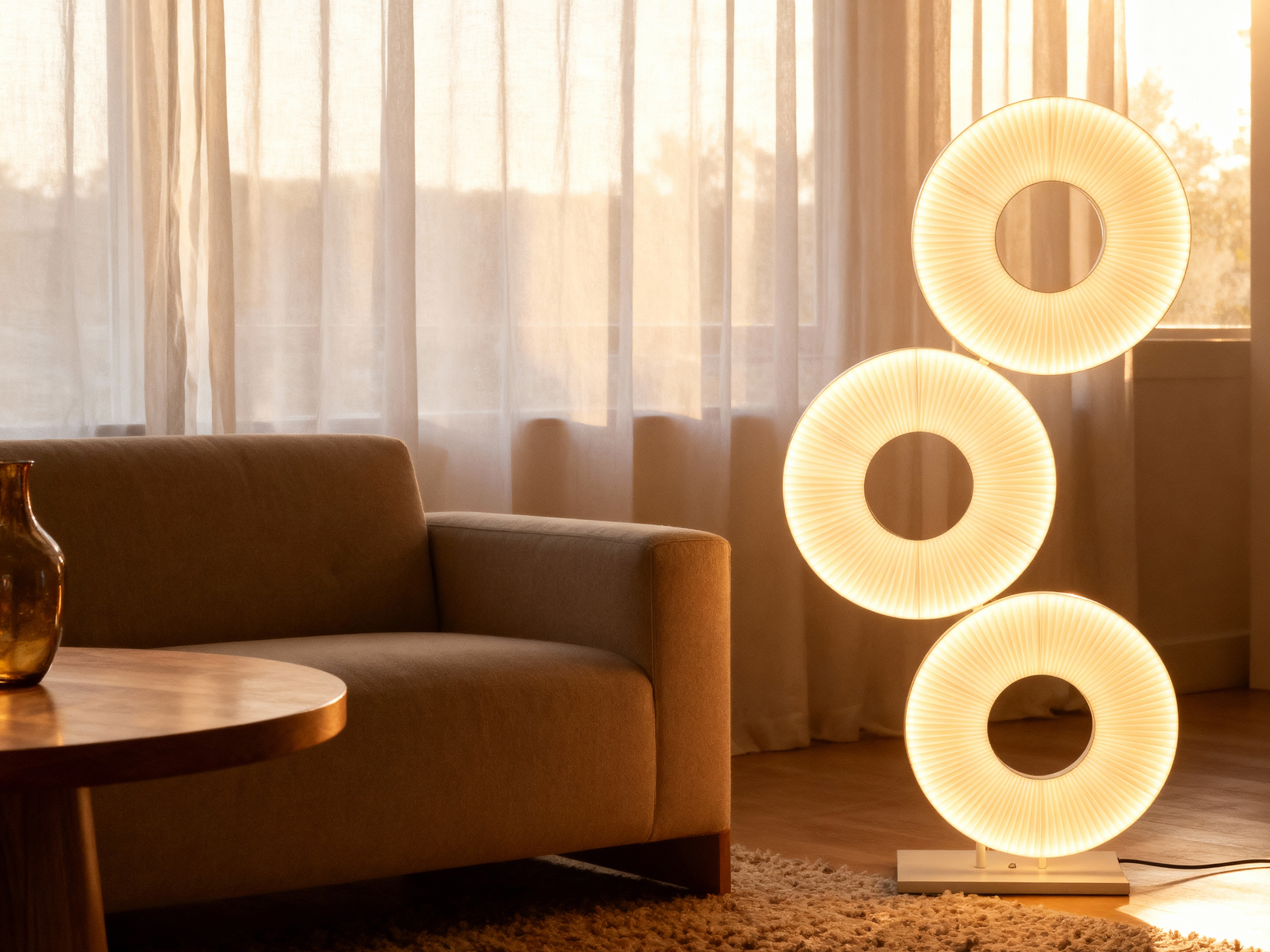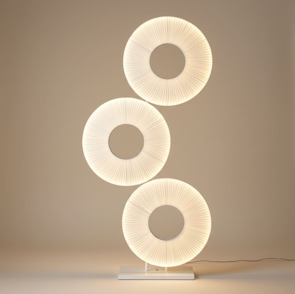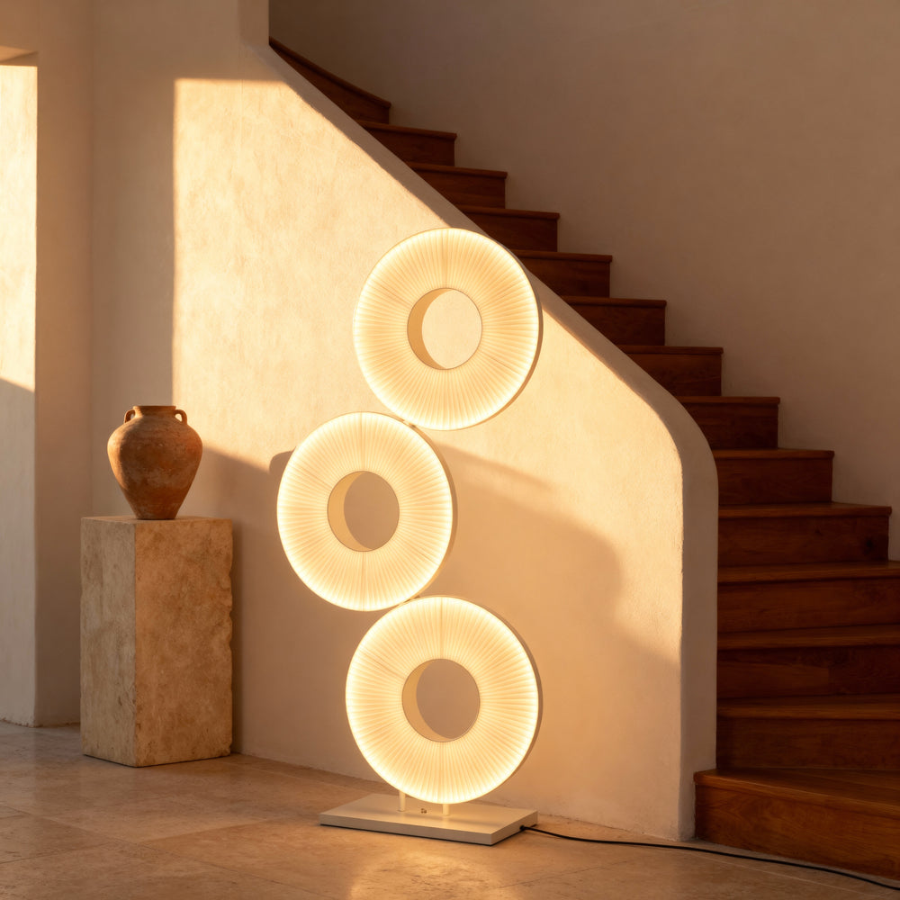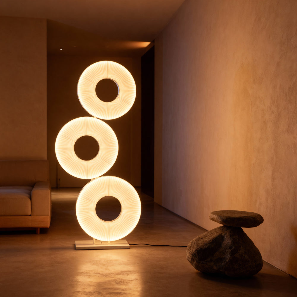 Three luminous rings stack in a poised offset, casting gentle ambient light from a sculptural form.