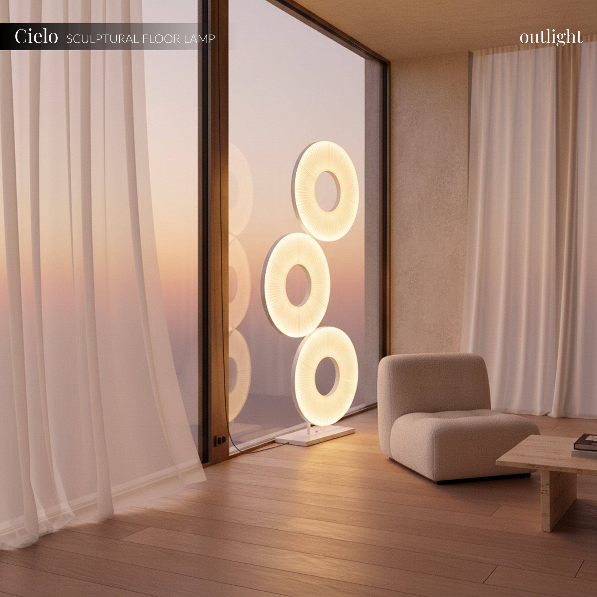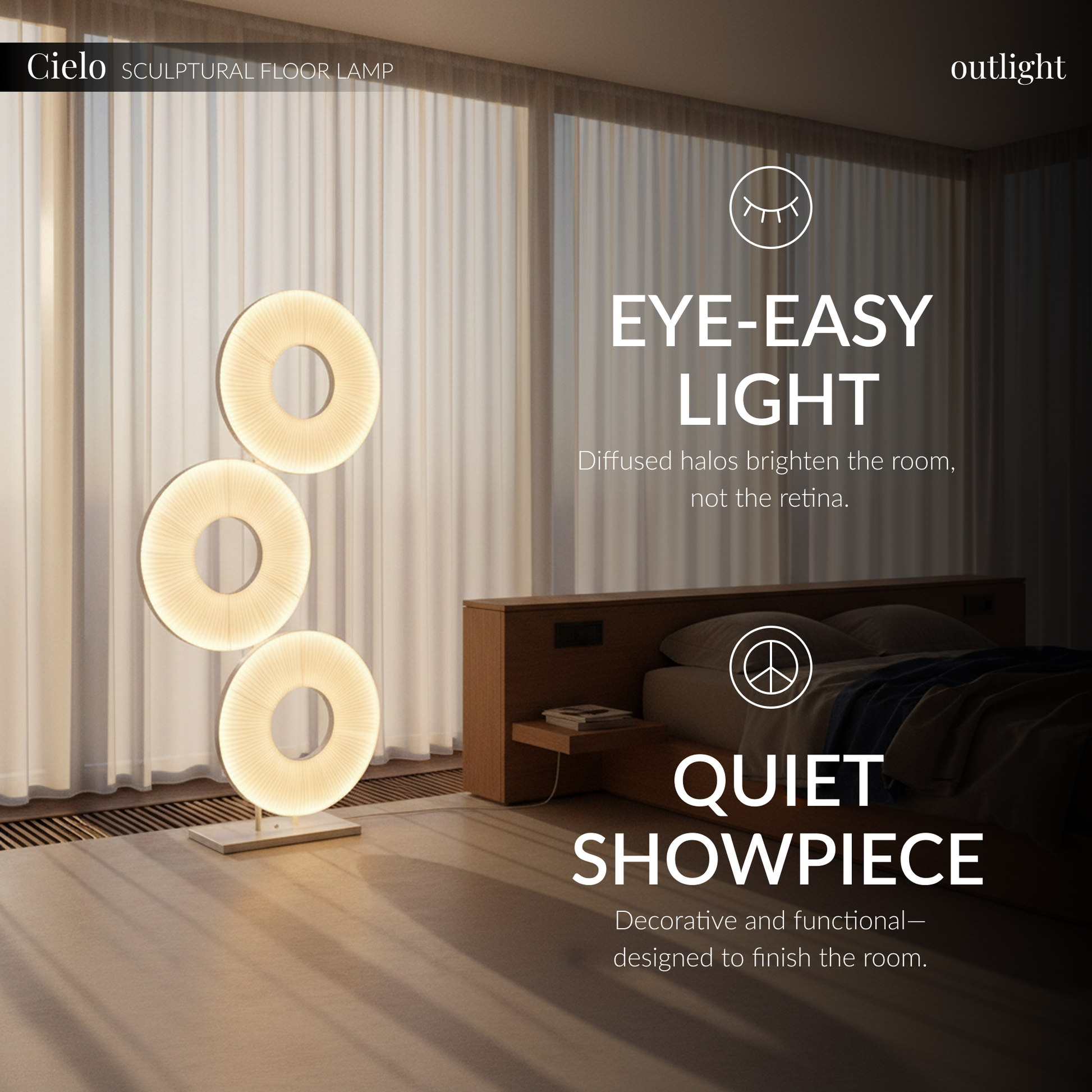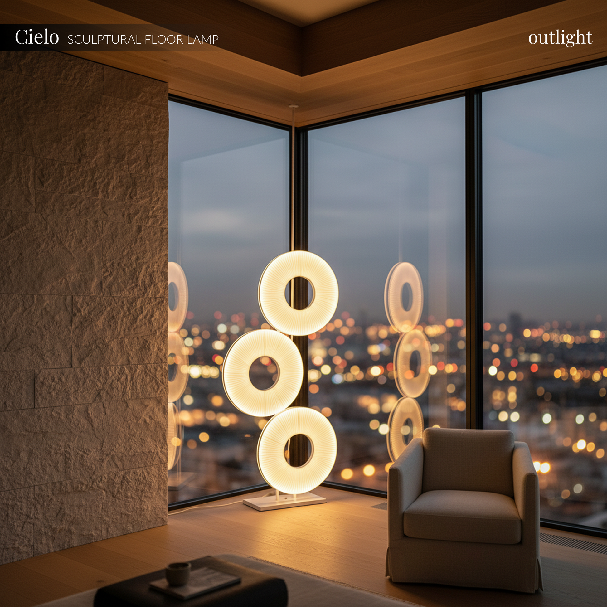 Three luminous rings stack in a poised offset, casting gentle ambient light from a sculptural form.
