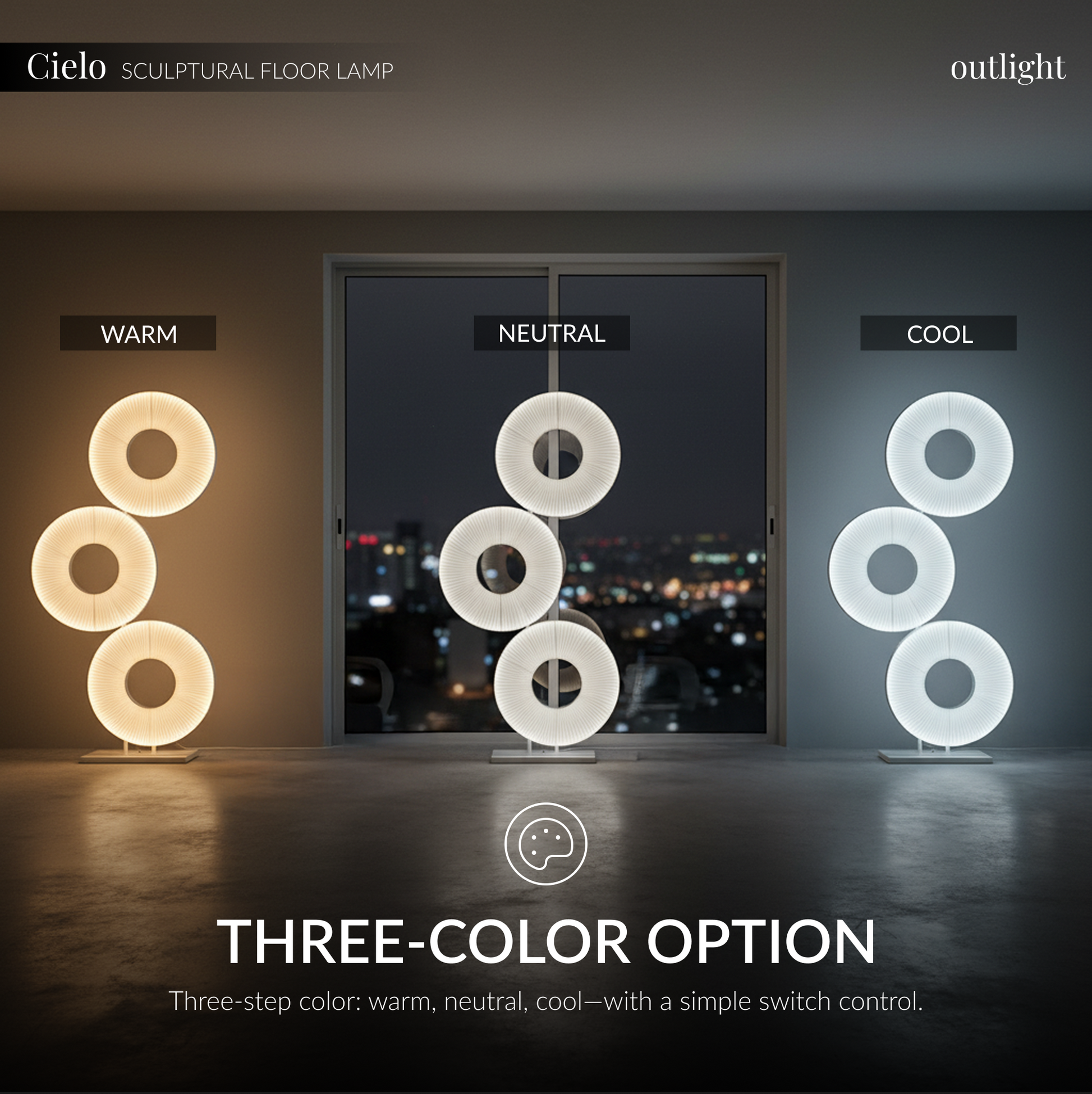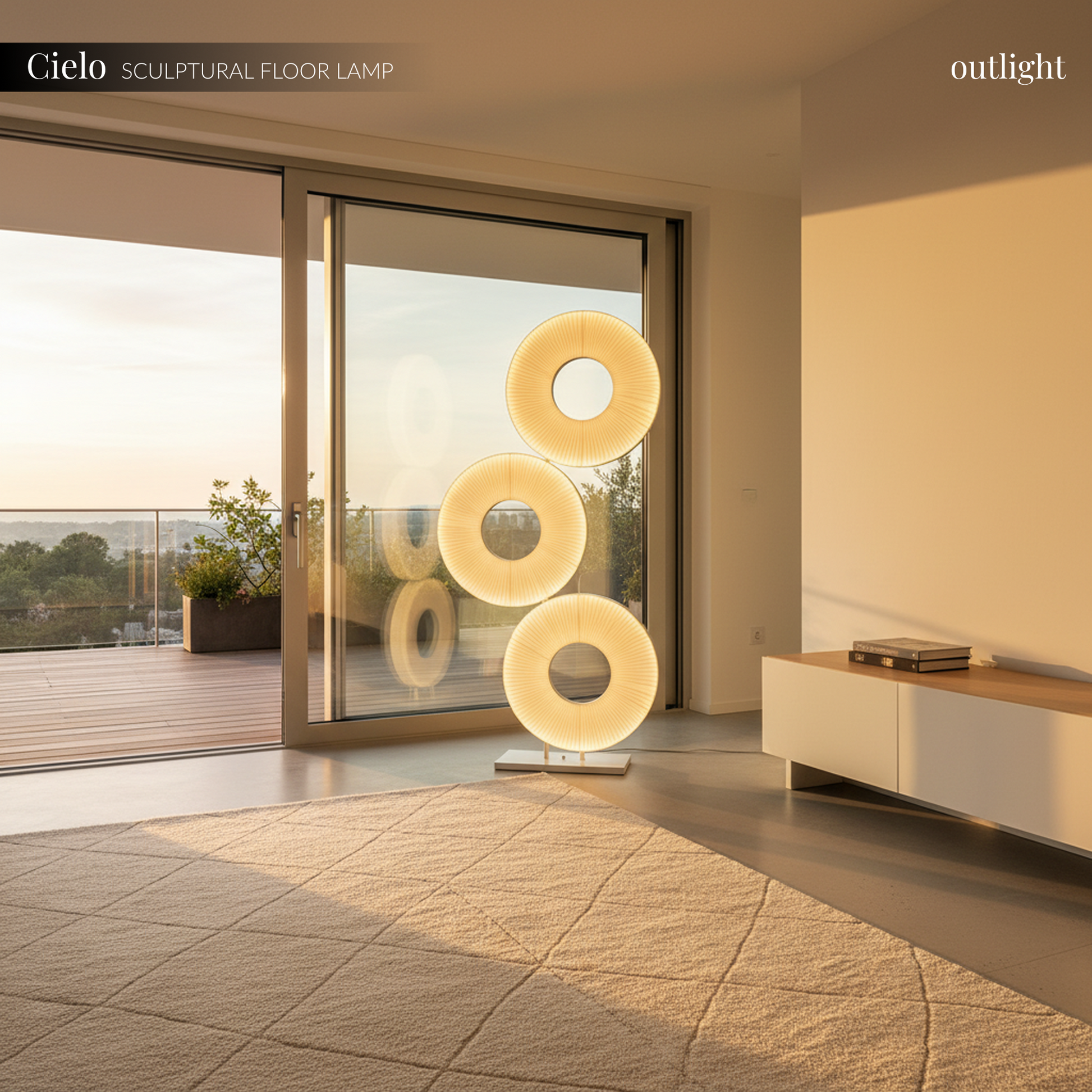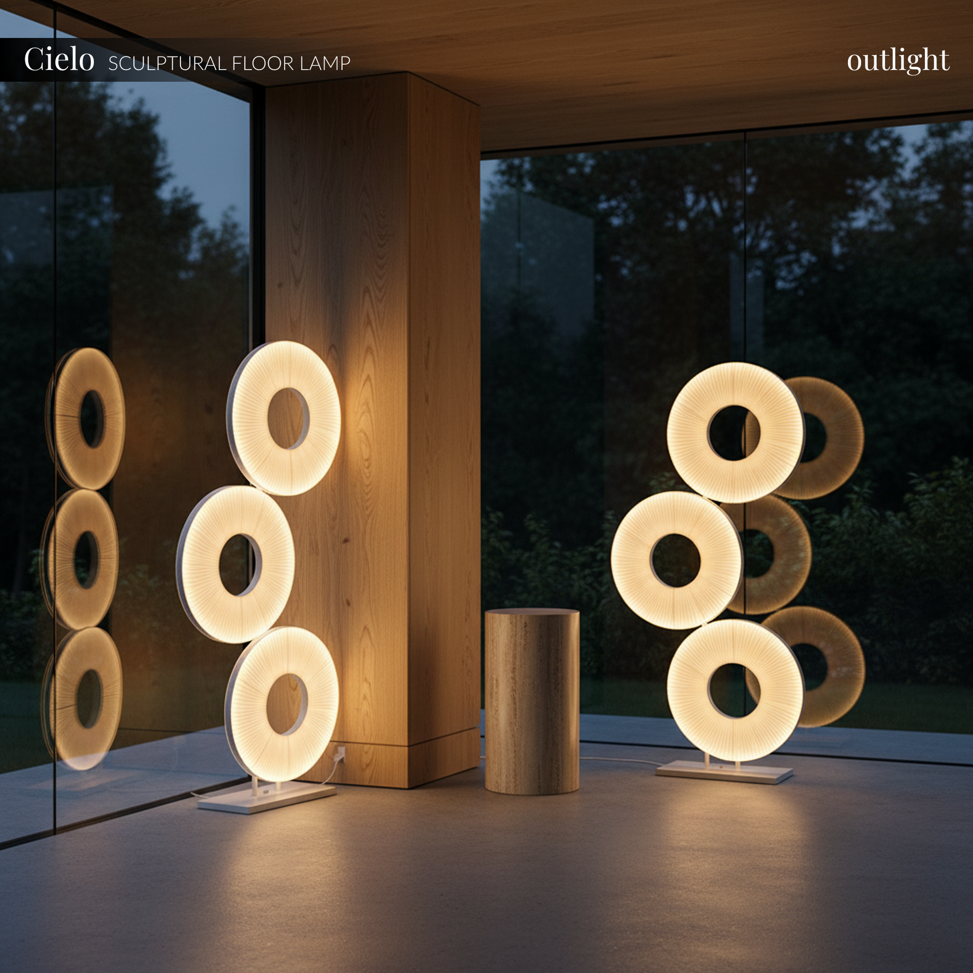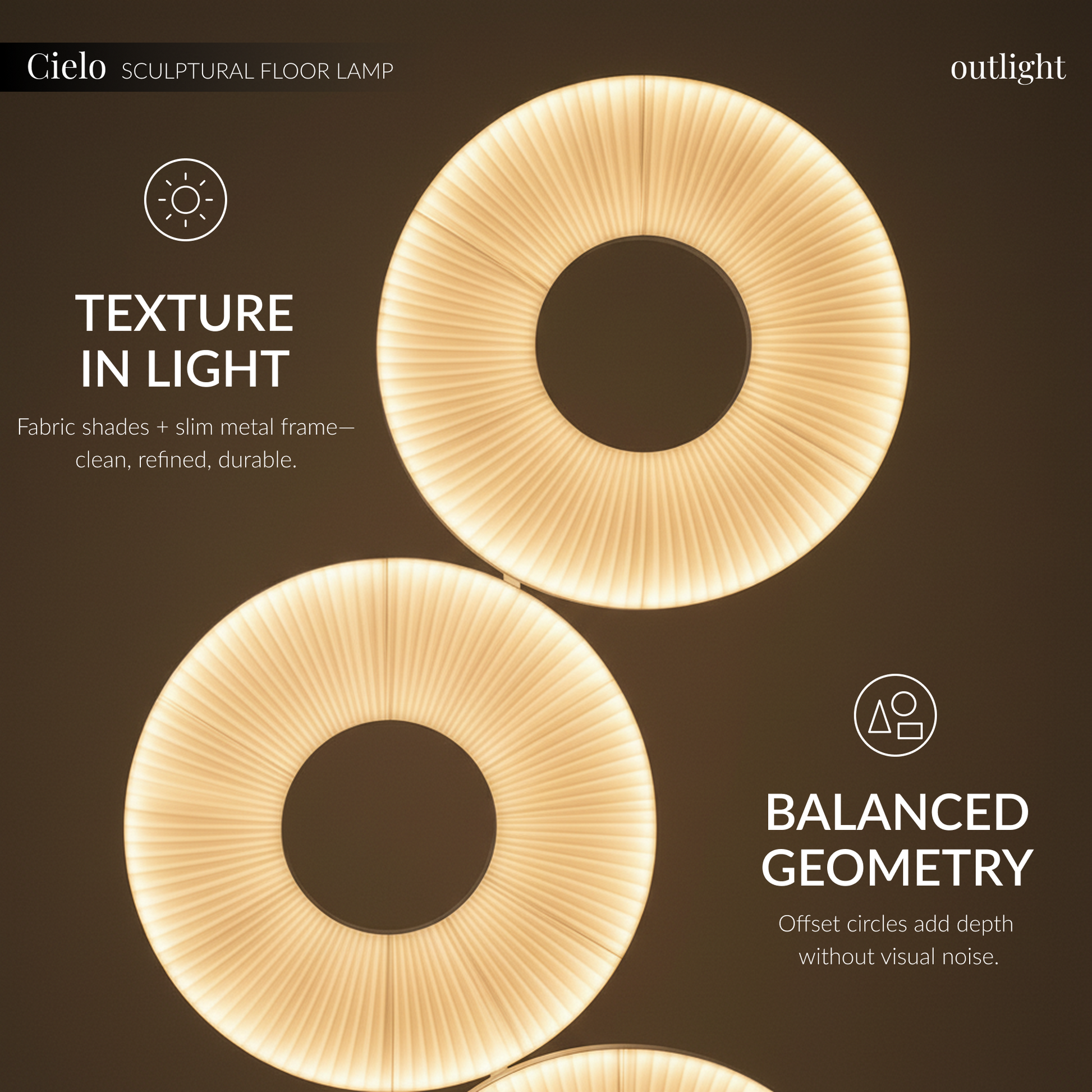 Three luminous rings stack in a poised offset, casting gentle ambient light from a sculptural form.