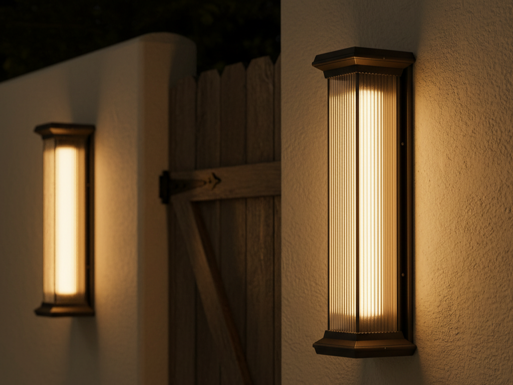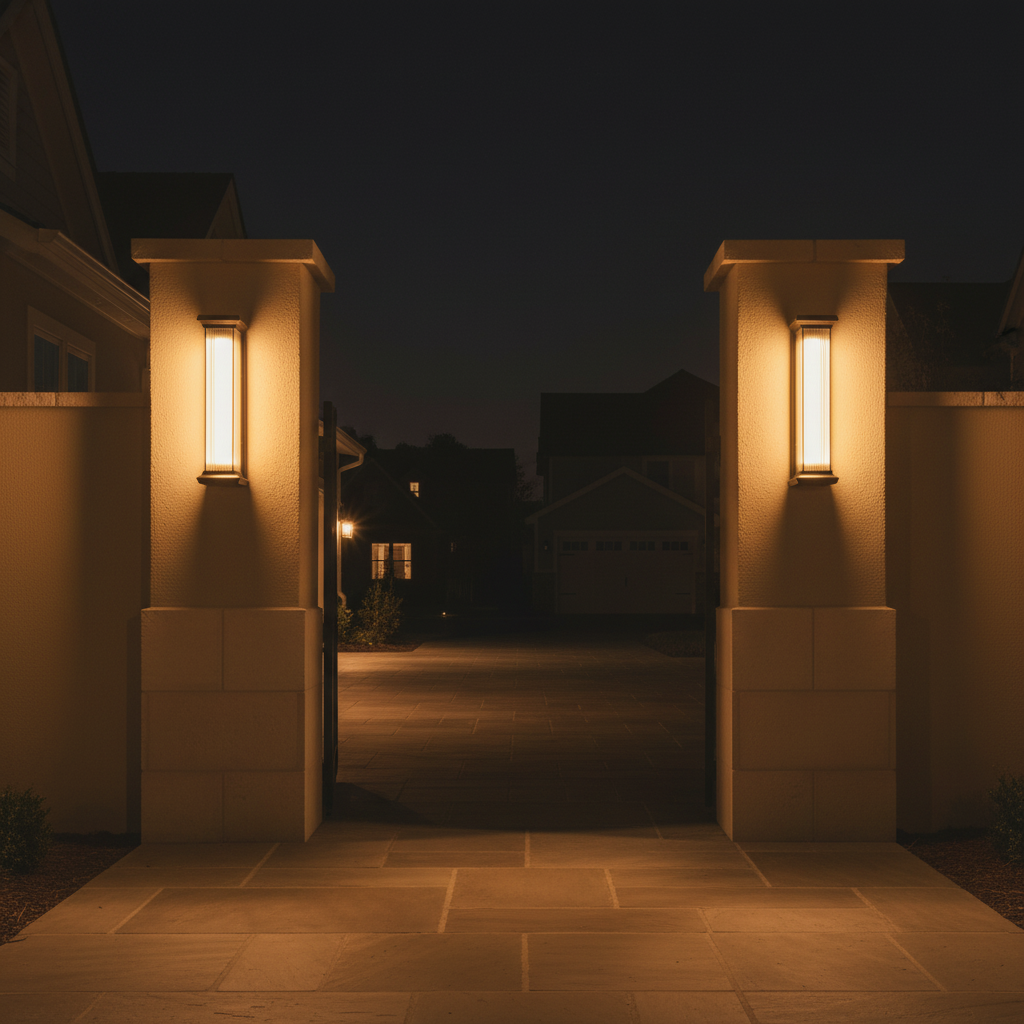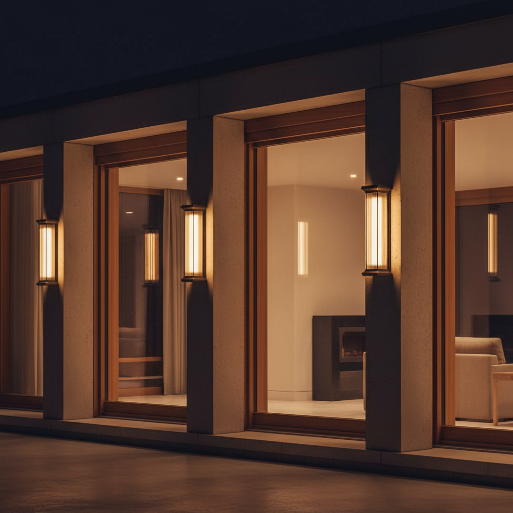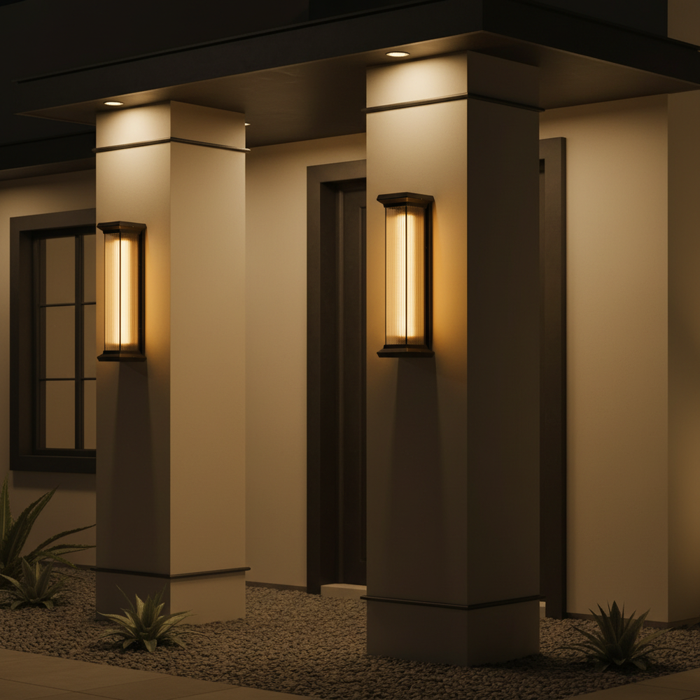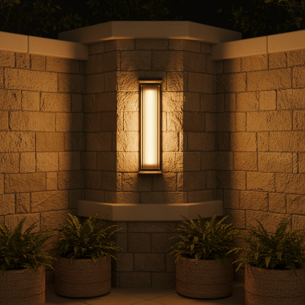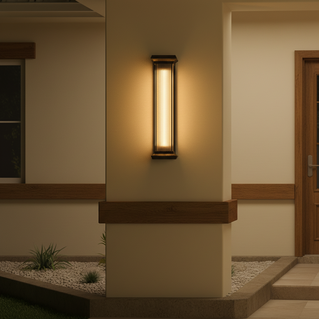 A refined outdoor wall light that merges geometric precision with a softly diffused vertical glow.