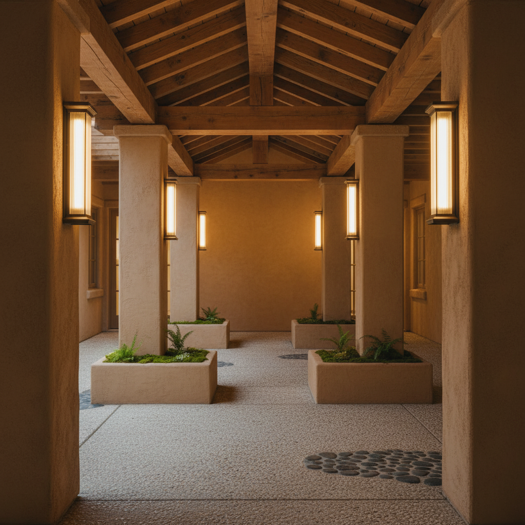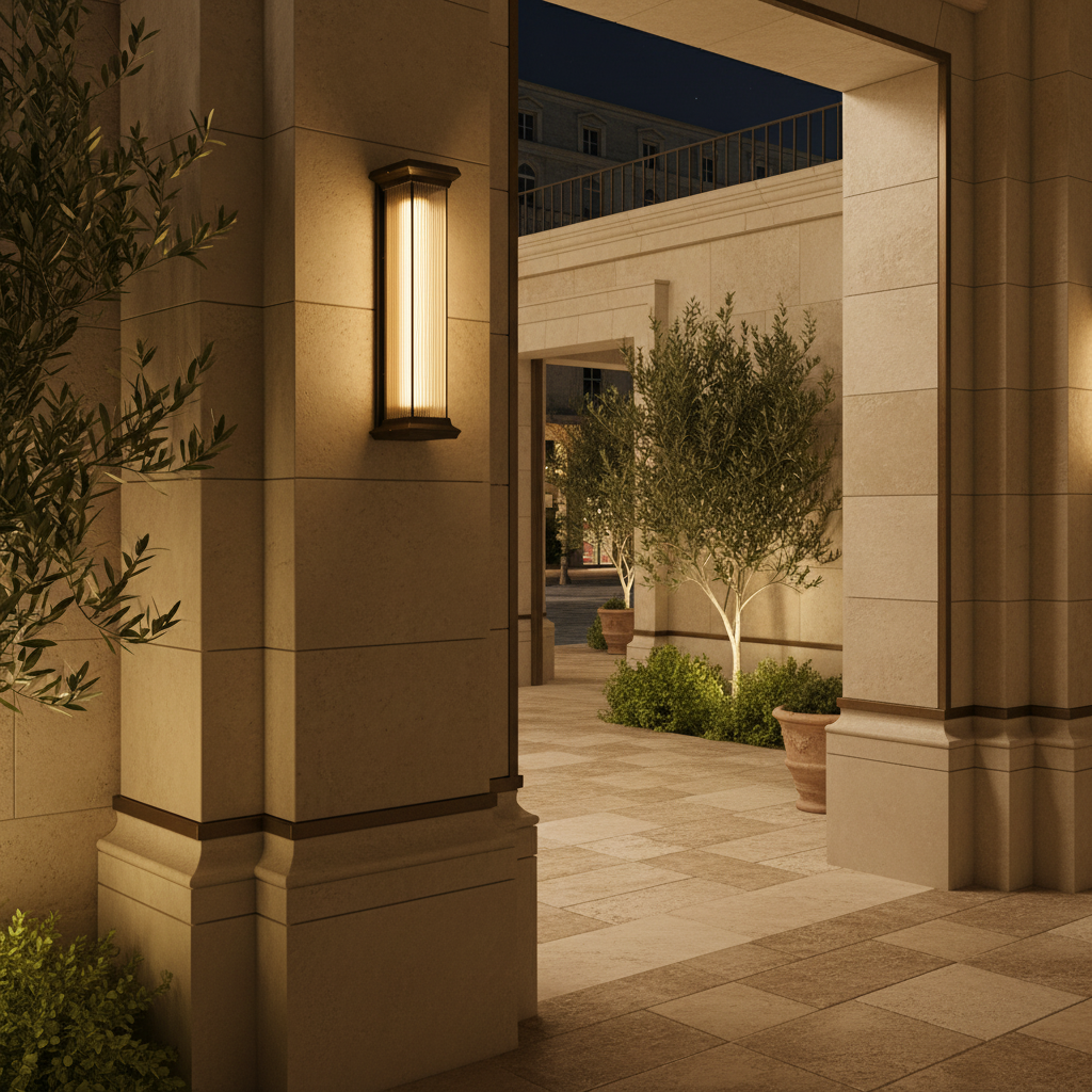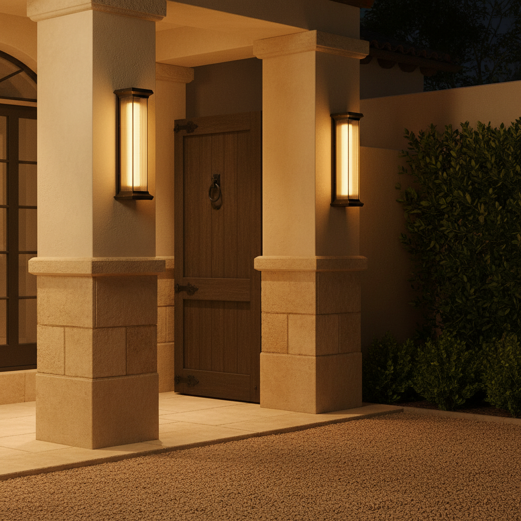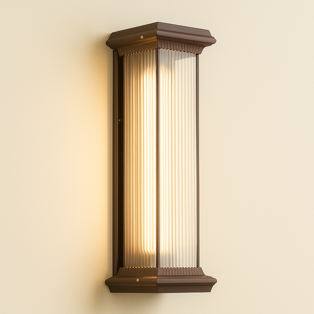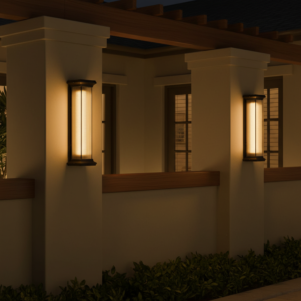 Croft’s ribbed glass and sculpted aluminum form create an elegant architectural rhythm. Designed for outdoor environments, it offers balanced illumination and timeless appeal across garden pathways and entry façades.