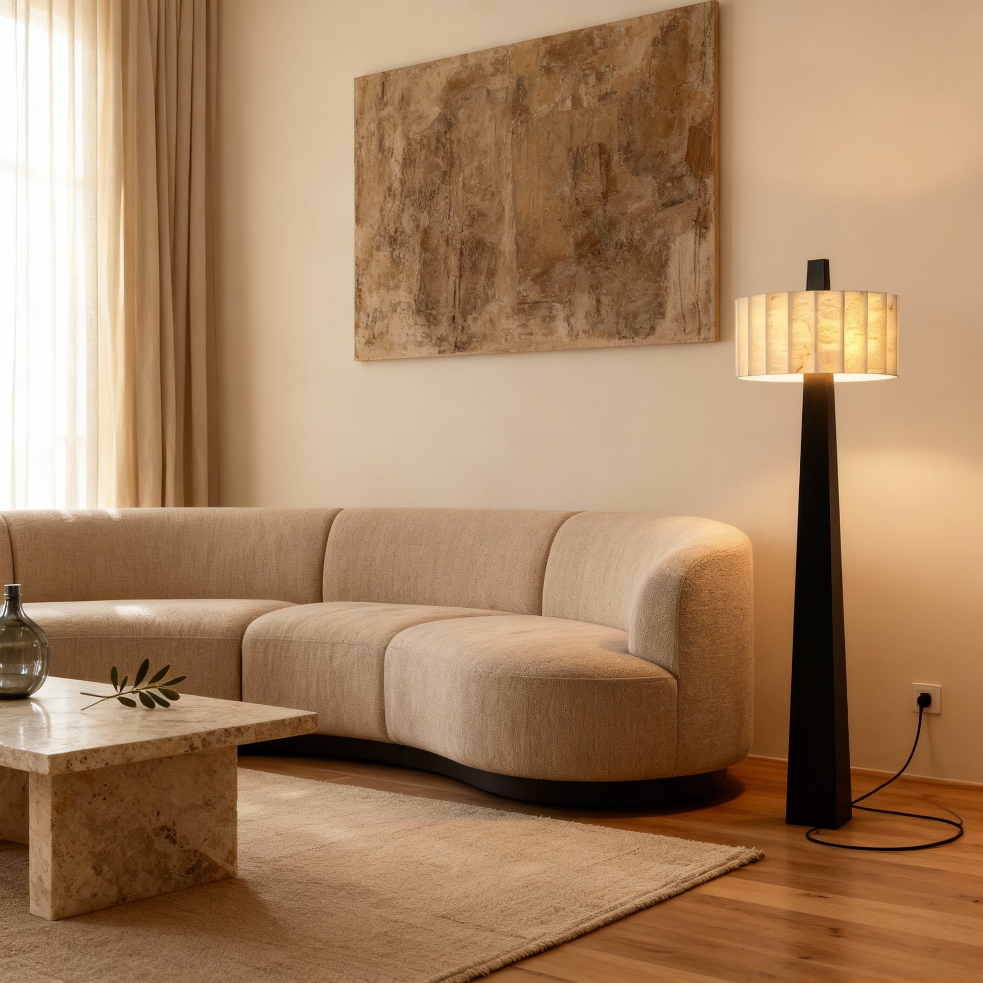 With its sculpted upright silhouette, Delos adds calm modern structure to interior settings. The natural translucency of alabaster provides a gentle glow that enriches spaces with subtle texture and serene illumination.