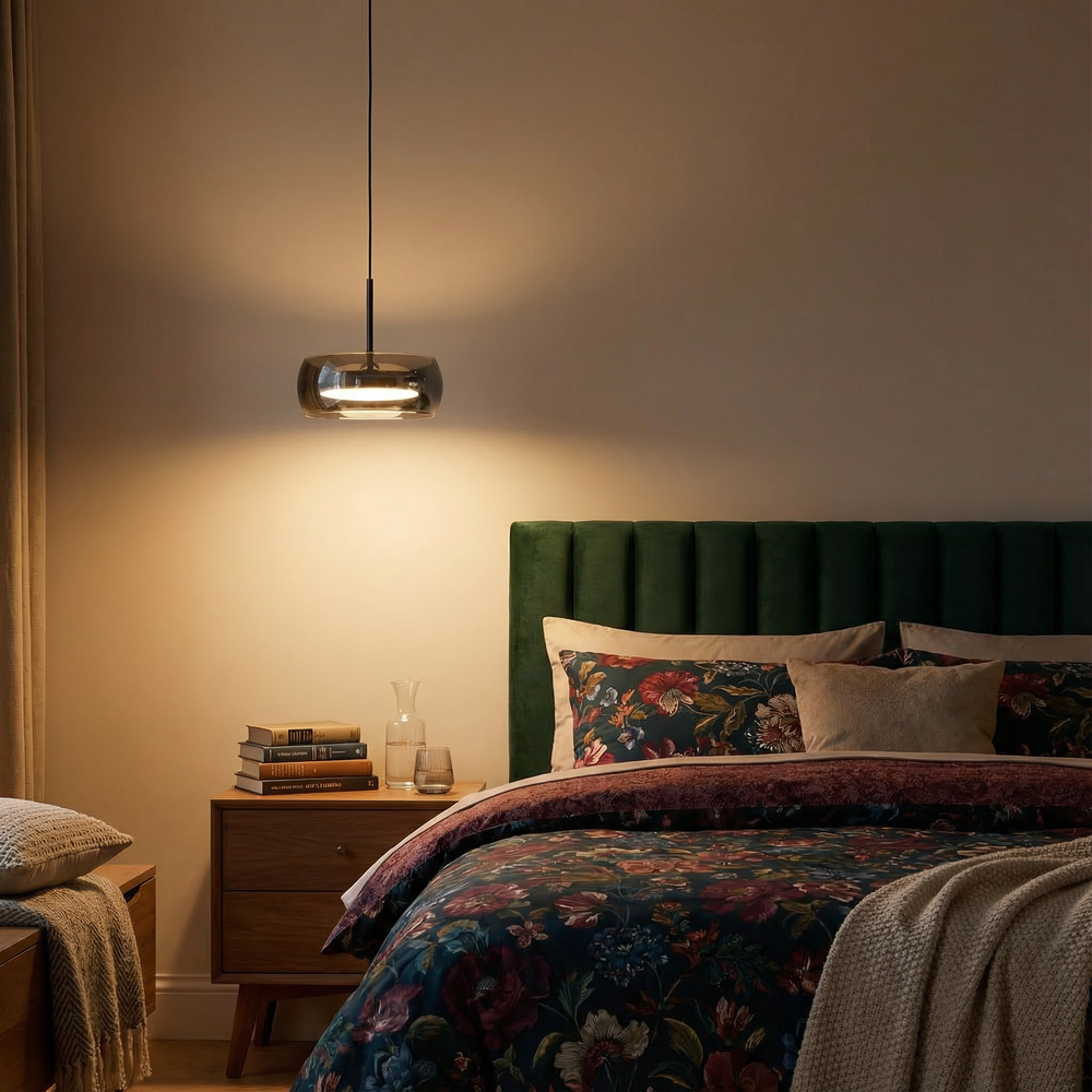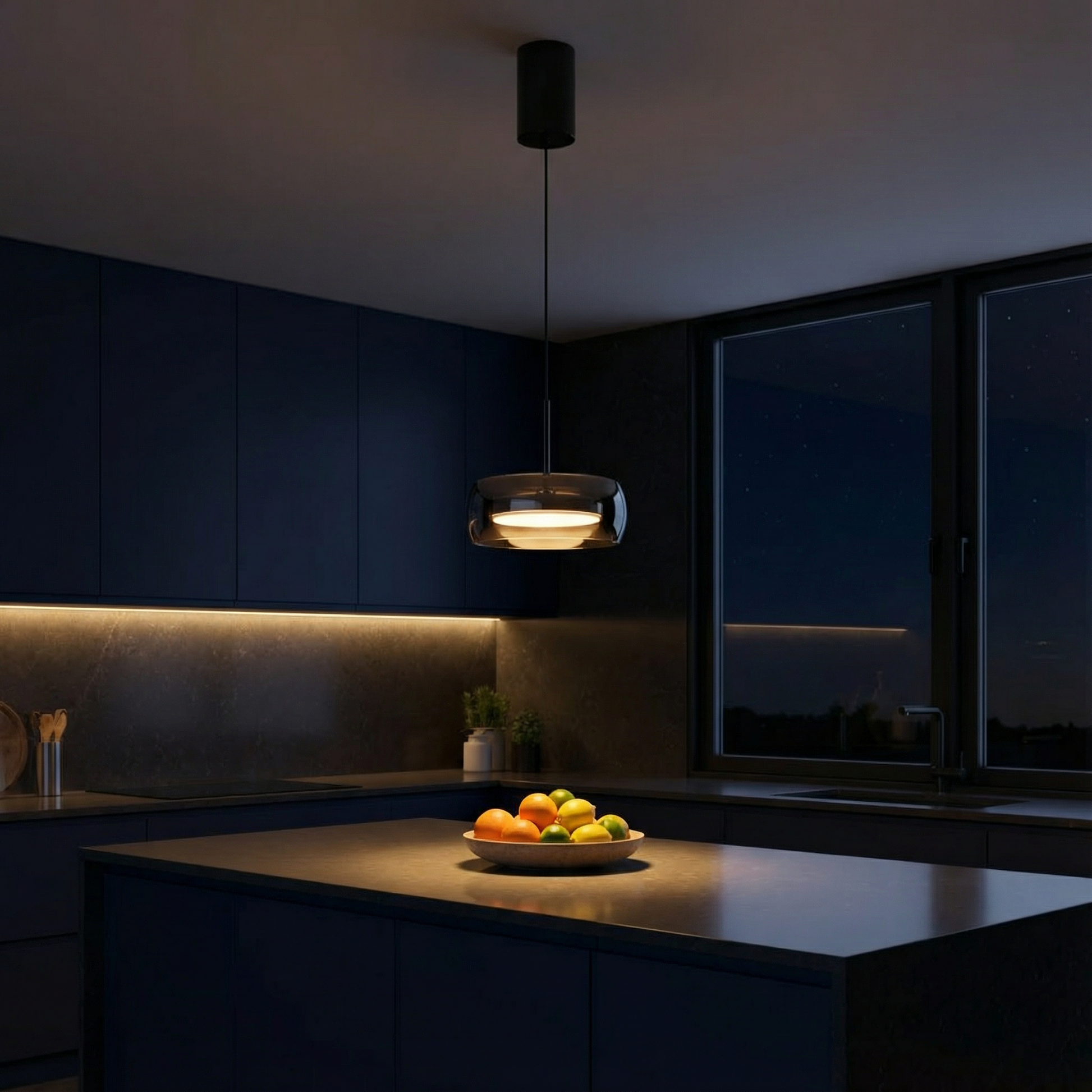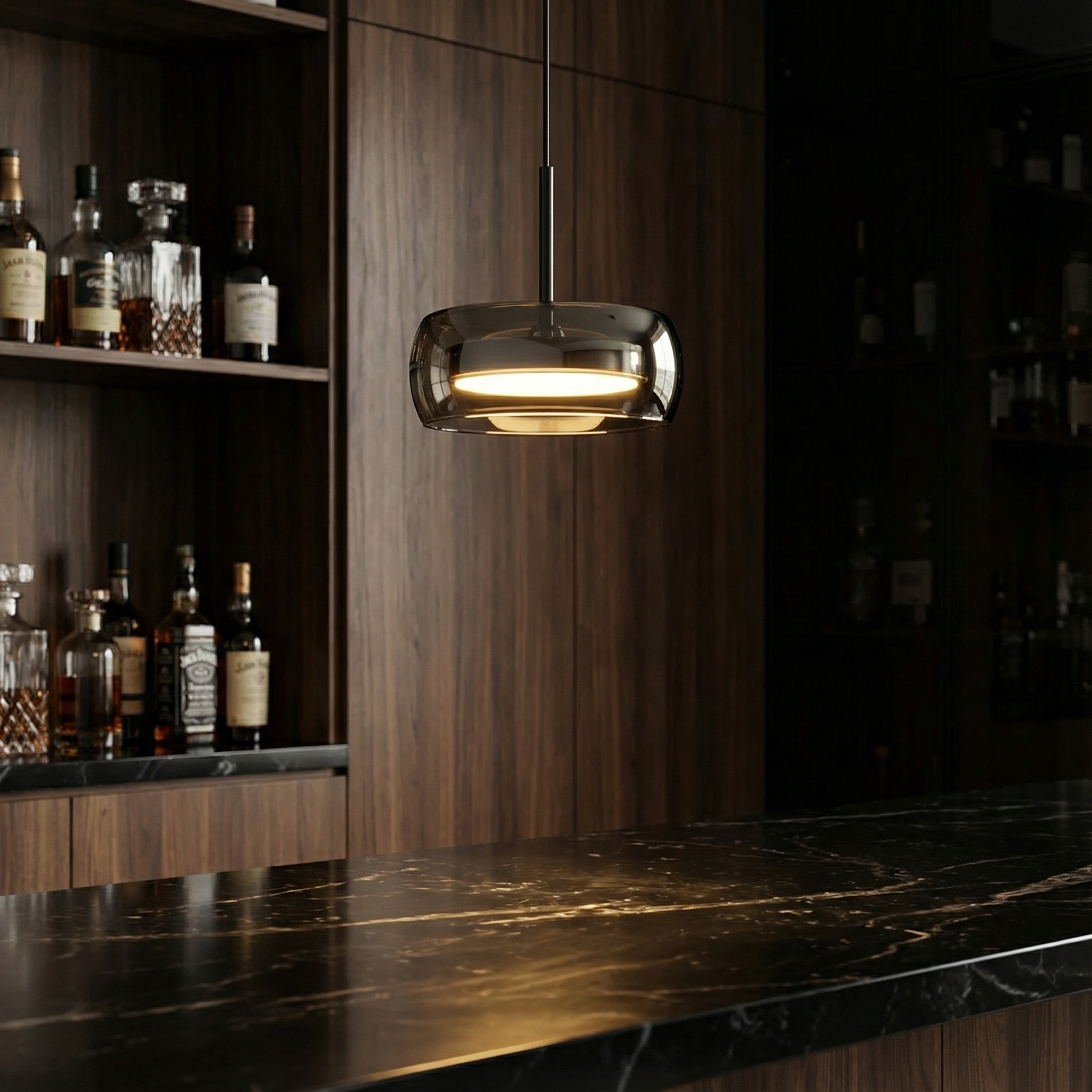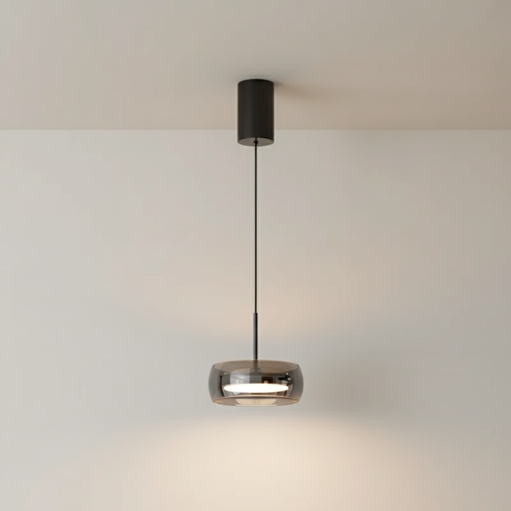 A compact pendant that brings quiet balance to contemporary interiors through its soft, diffused presence.