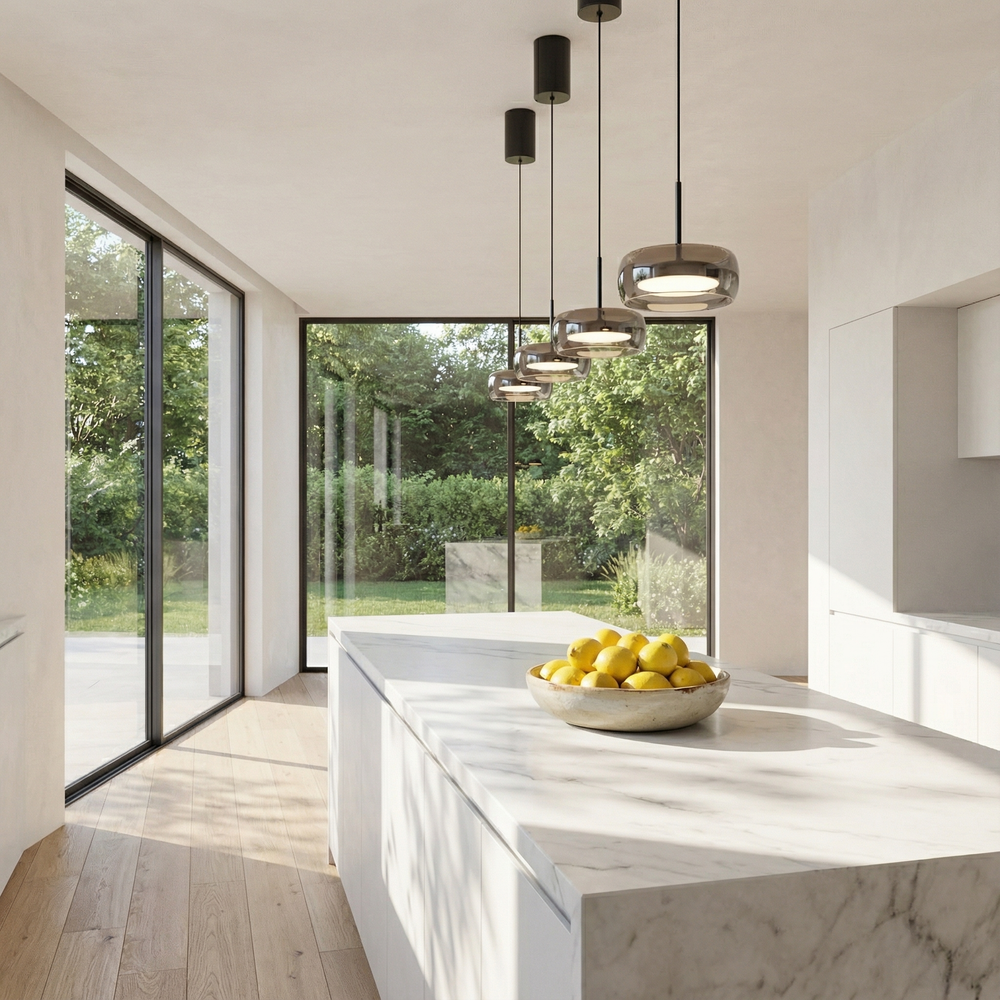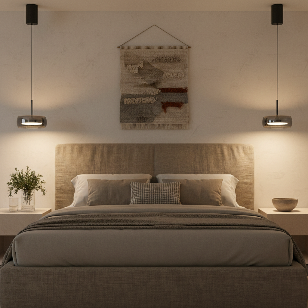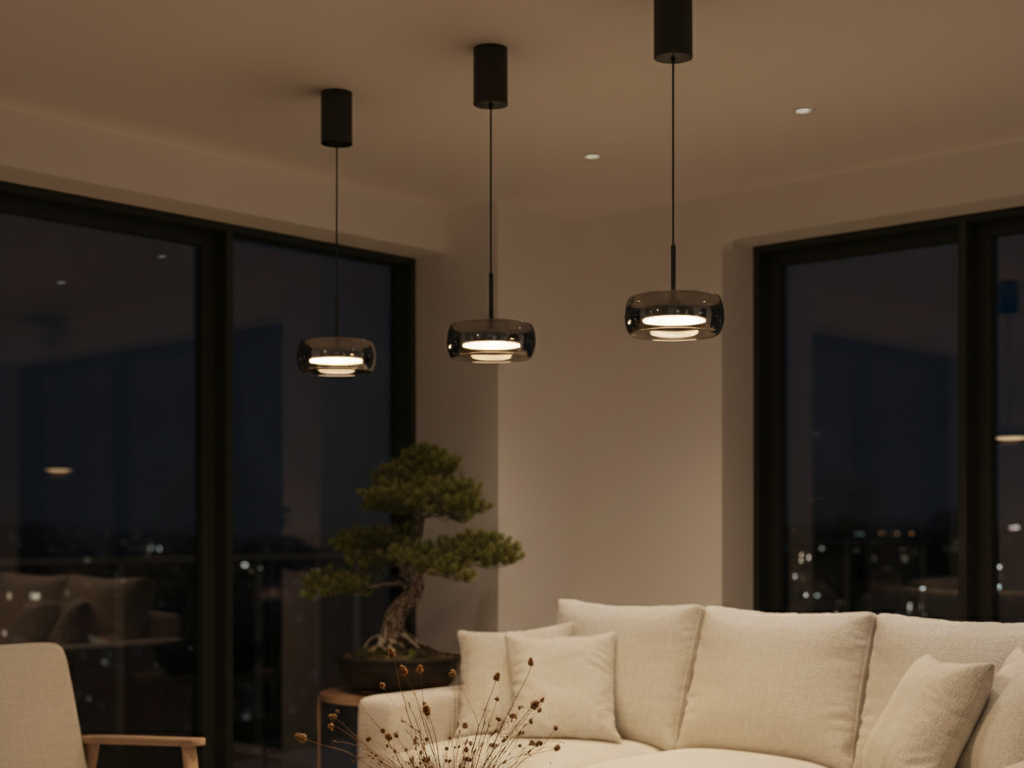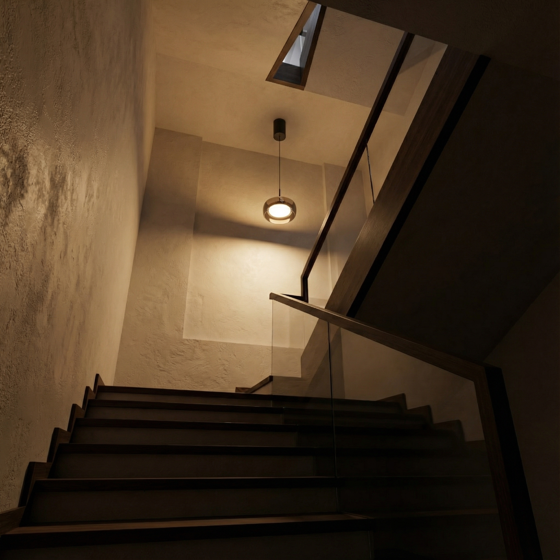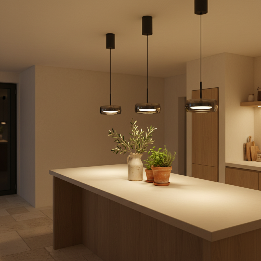 A compact pendant that brings quiet balance to contemporary interiors through its soft, diffused presence.