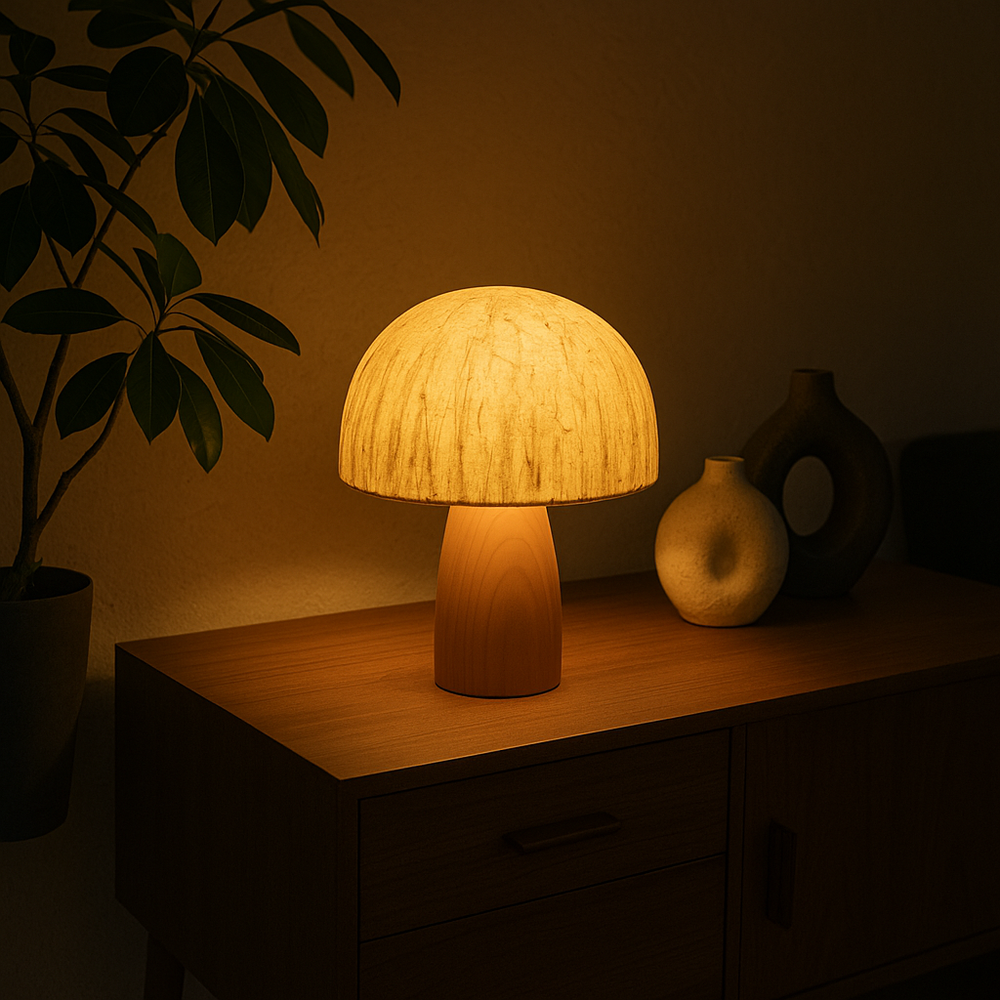 Elm features a smooth, rounded shade paired with a solid, column-like base, creating a silhouette that feels both playful and refined. The gentle contrast between paper and wood gives the lamp a comforting presence, making it a natural focal point in Japandi and minimalist living spaces.