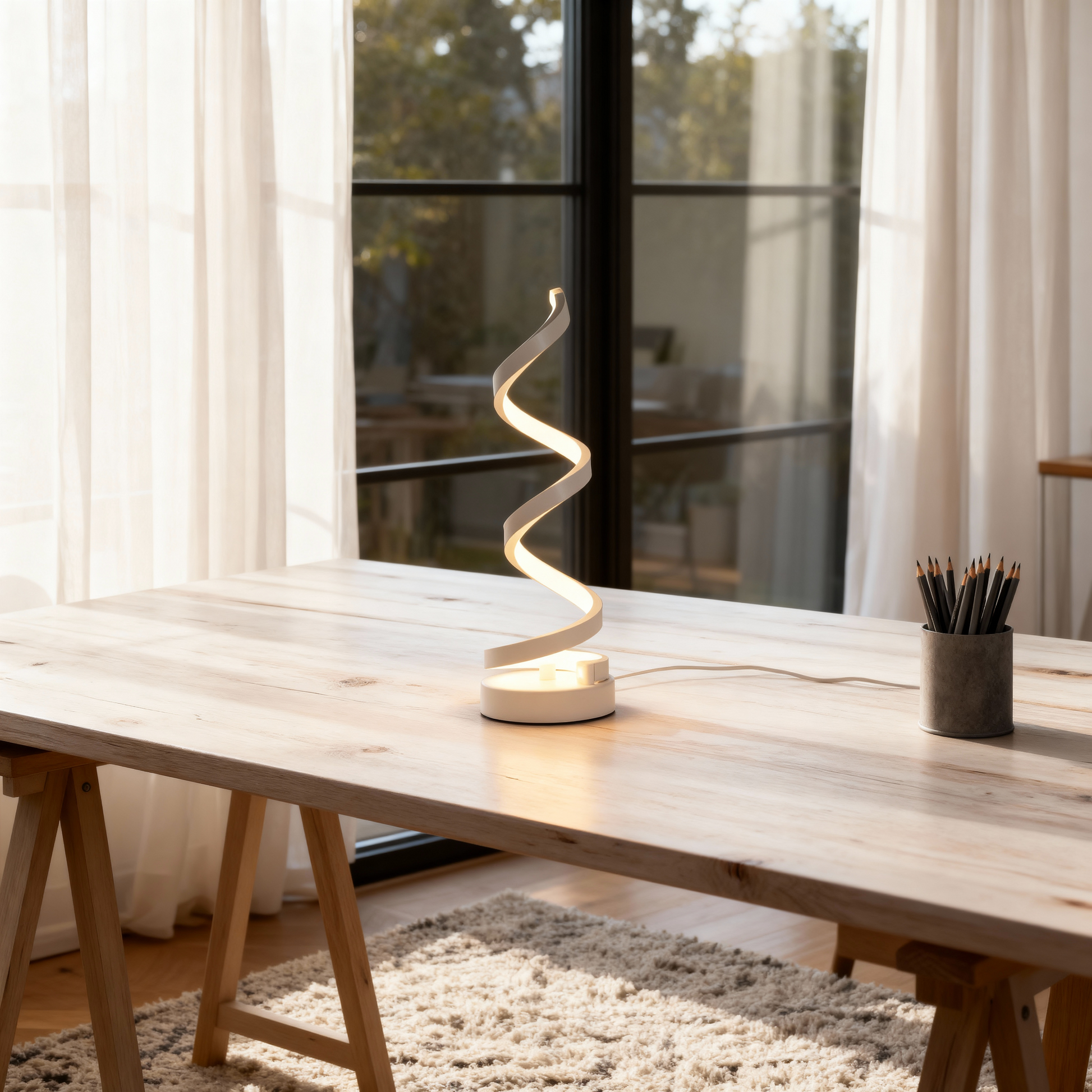 Elya’s wave-shaped frame creates a striking yet balanced silhouette, diffusing soft light for a calm working atmosphere. Crafted from iron and aluminum, its modern profile offers both visual rhythm and everyday practicality.