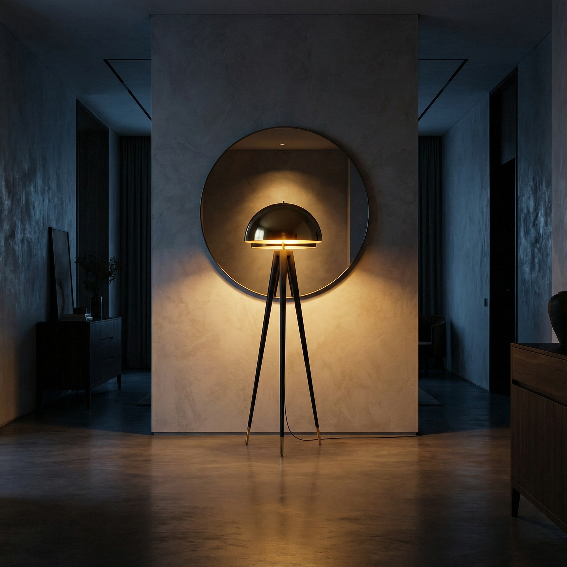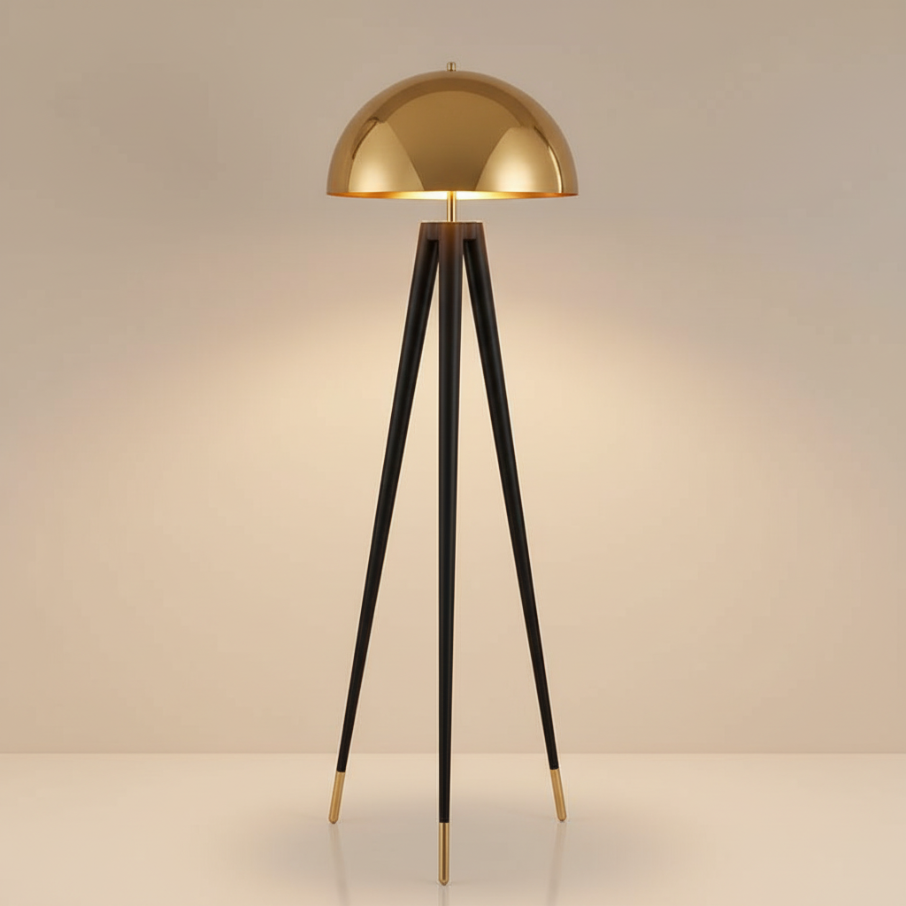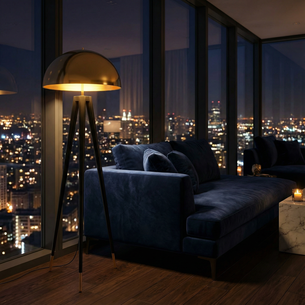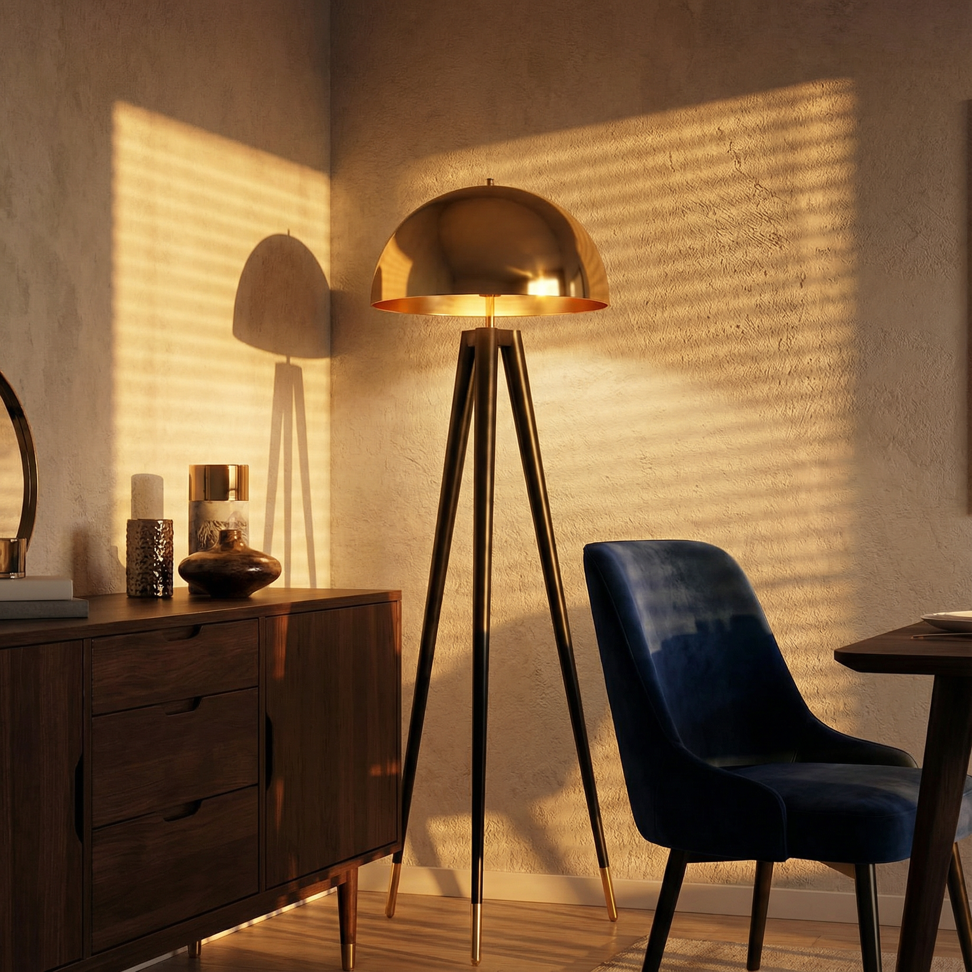 The Enzo floor lamp highlights clean geometry with its domed metallic shade and slender, tapered legs, creating a quiet yet confident focal point. Its warm ambient spread gently enhances seating areas and living zones, adding understated depth and evening comfort without overwhelming the room.