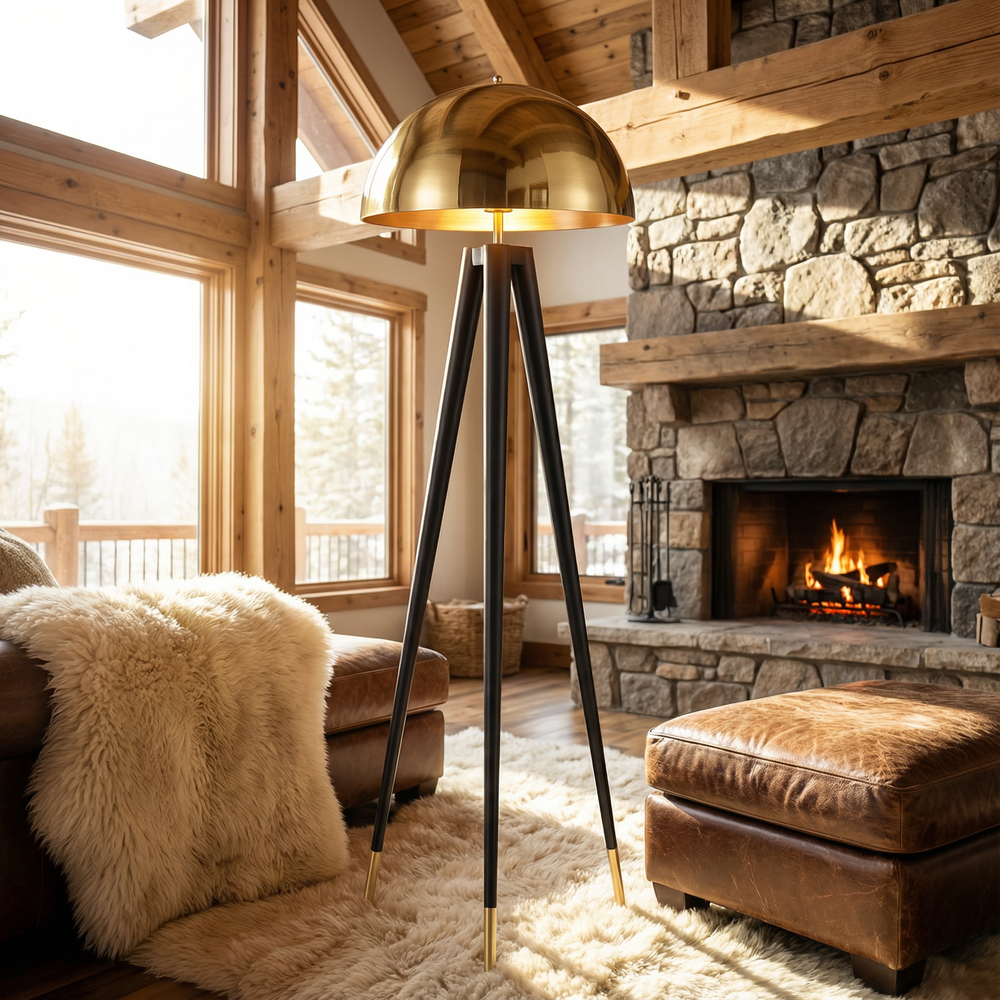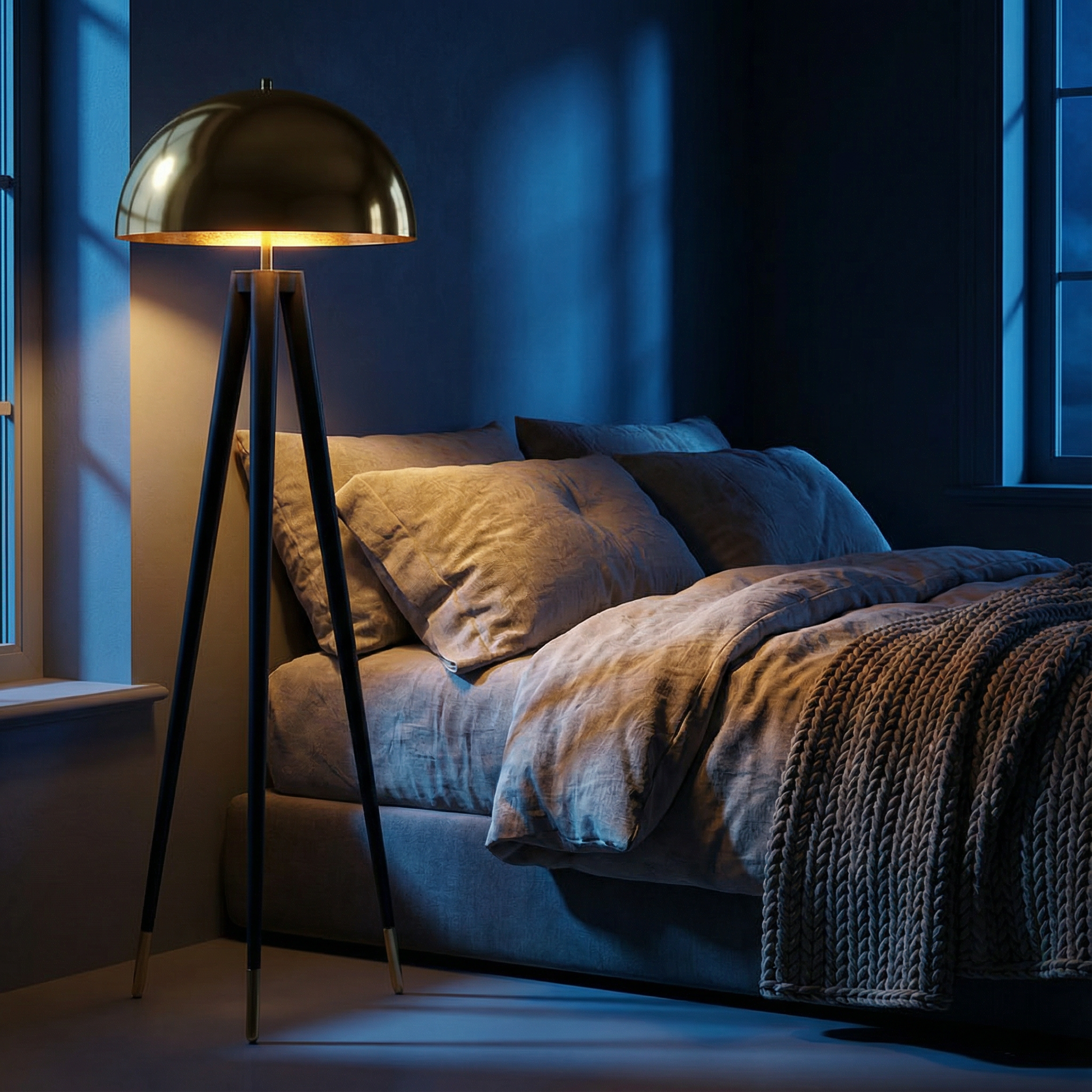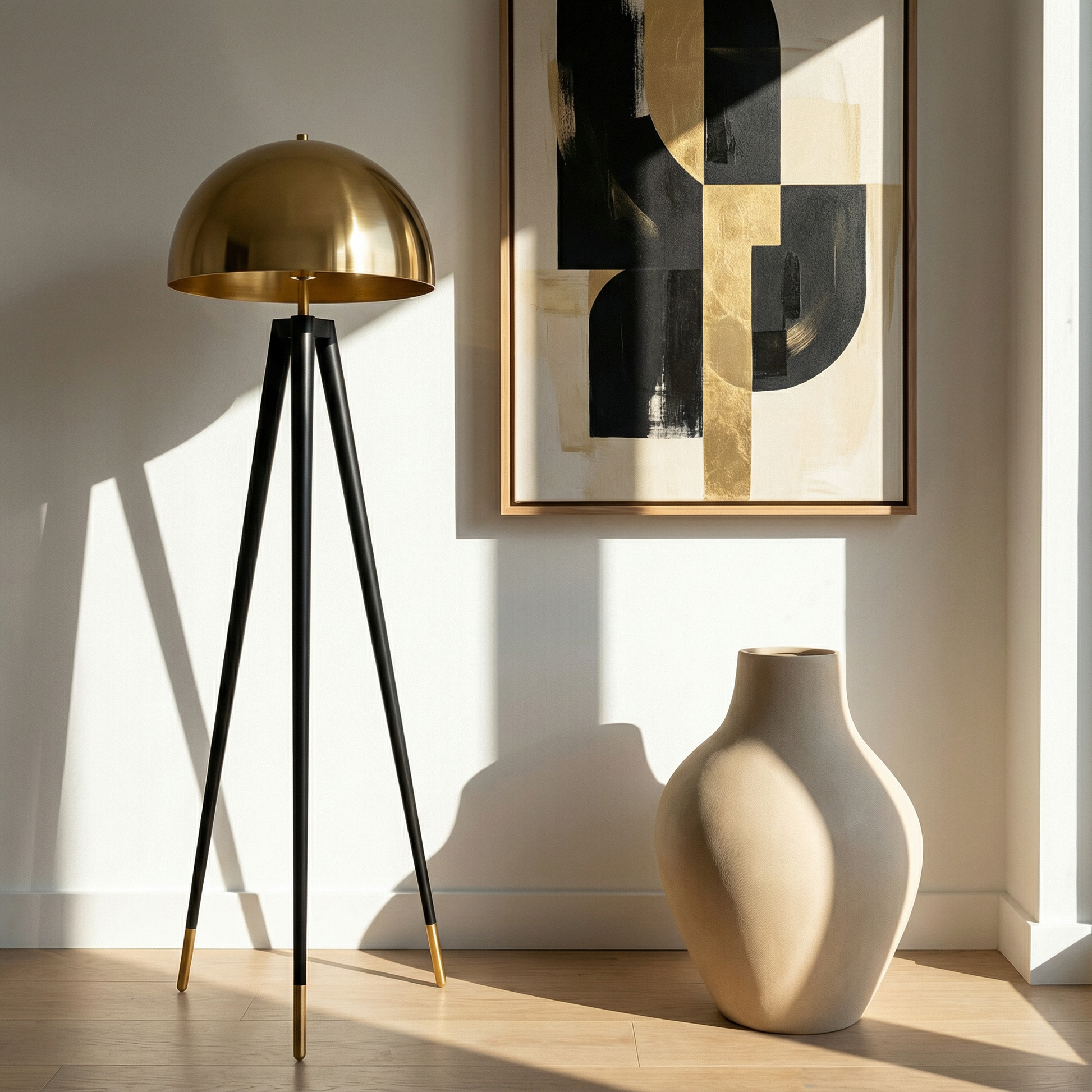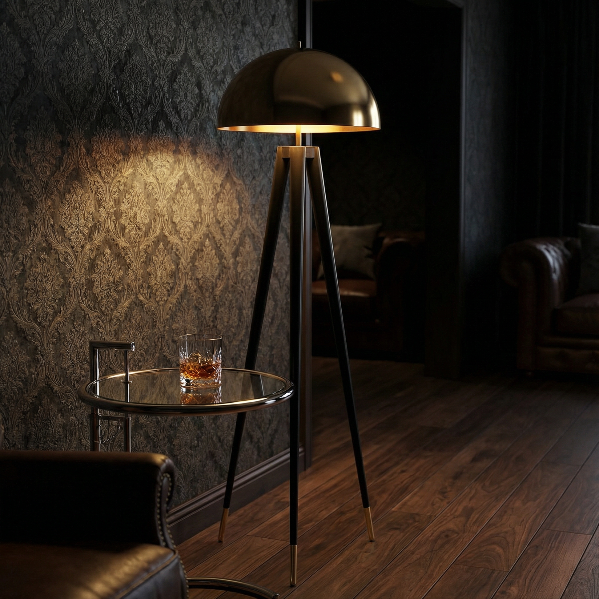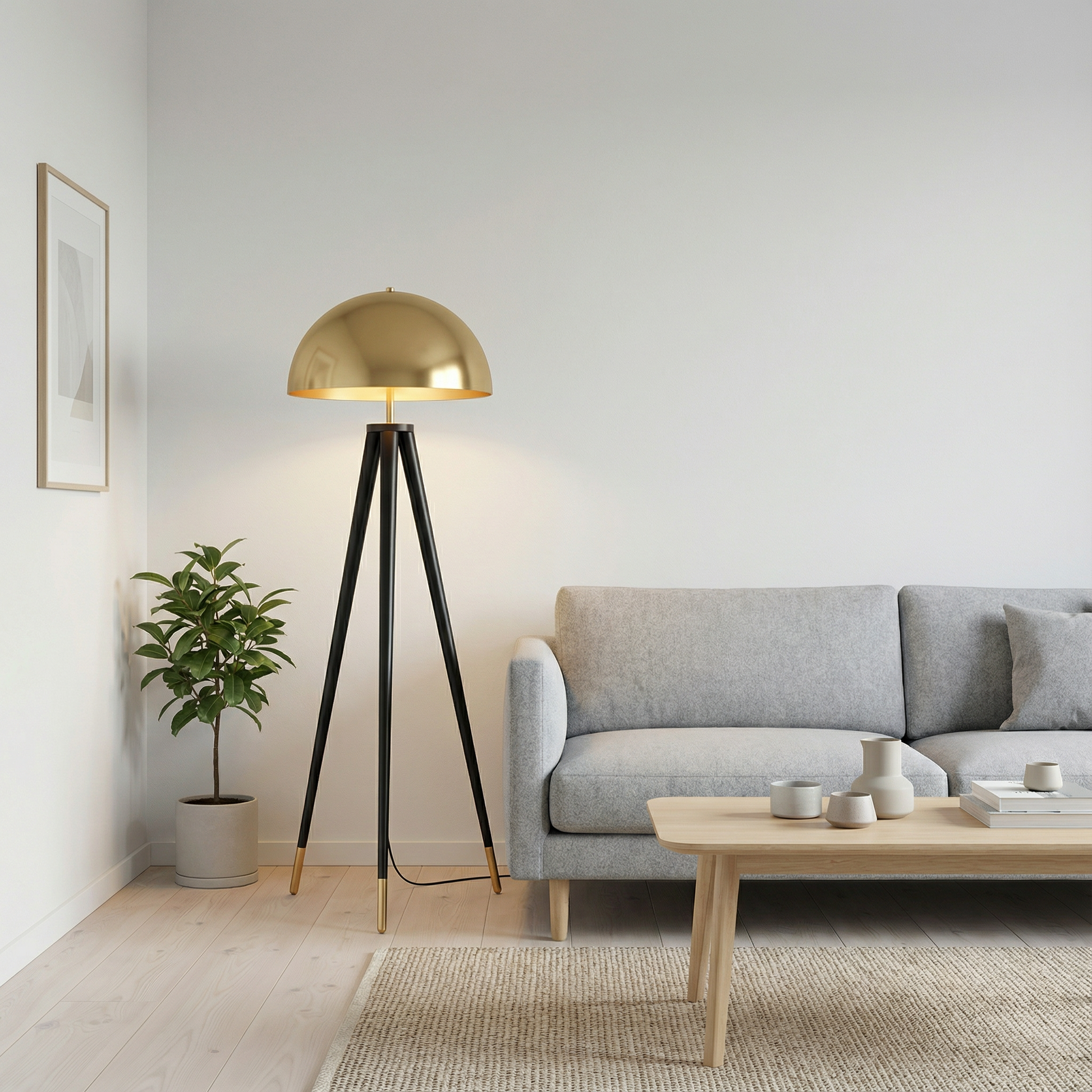 The Enzo floor lamp highlights clean geometry with its domed metallic shade and slender, tapered legs, creating a quiet yet confident focal point. Its warm ambient spread gently enhances seating areas and living zones, adding understated depth and evening comfort without overwhelming the room.