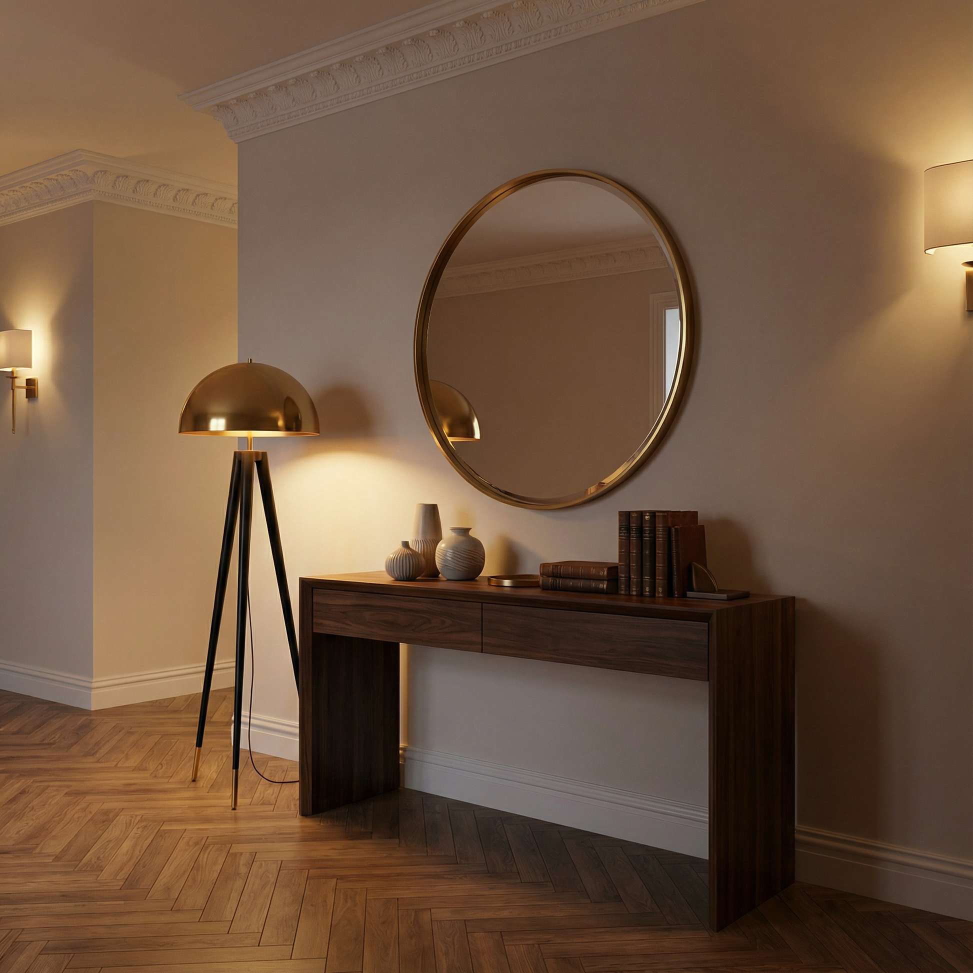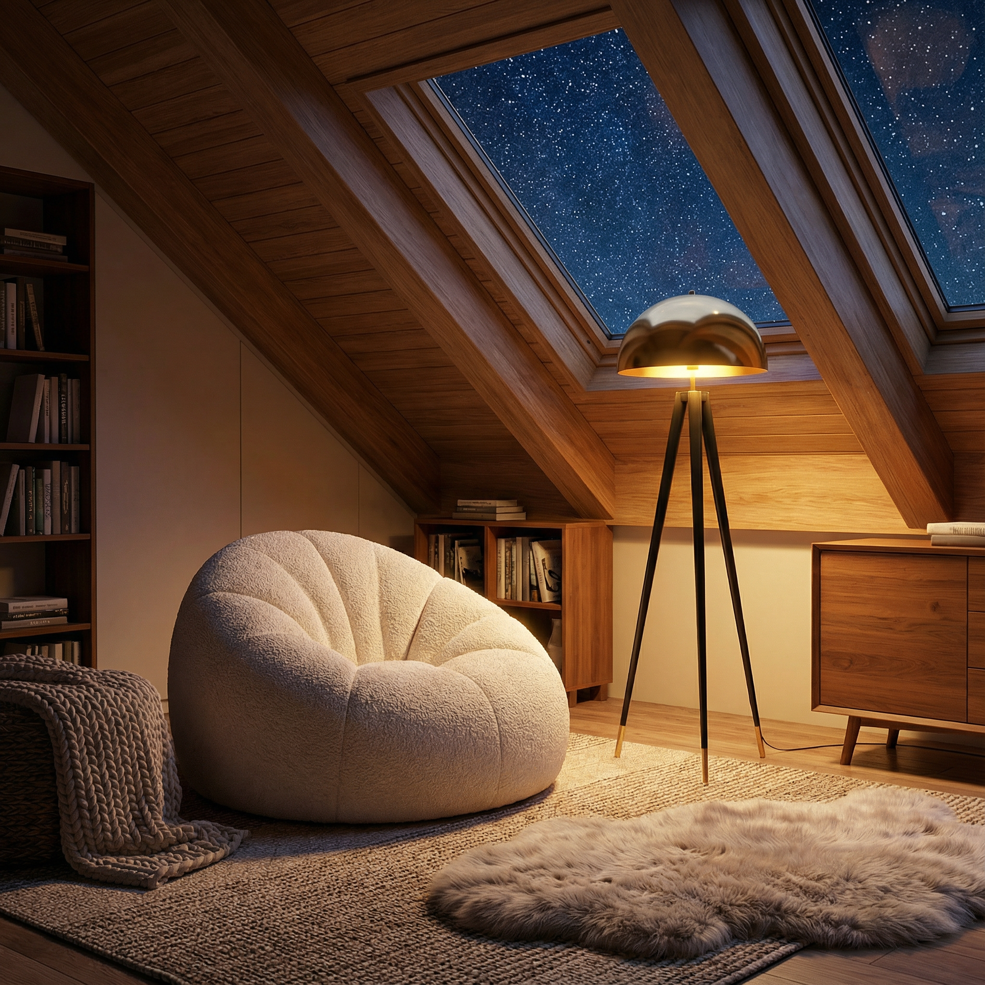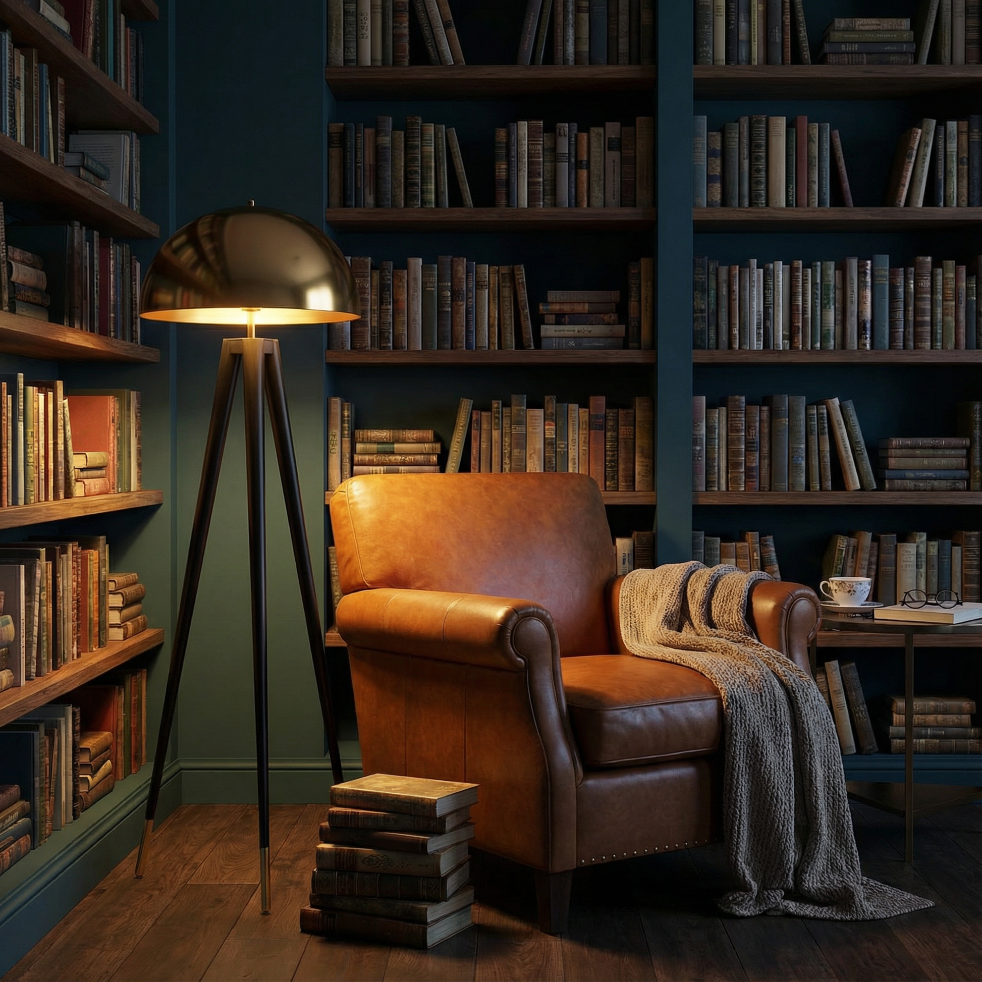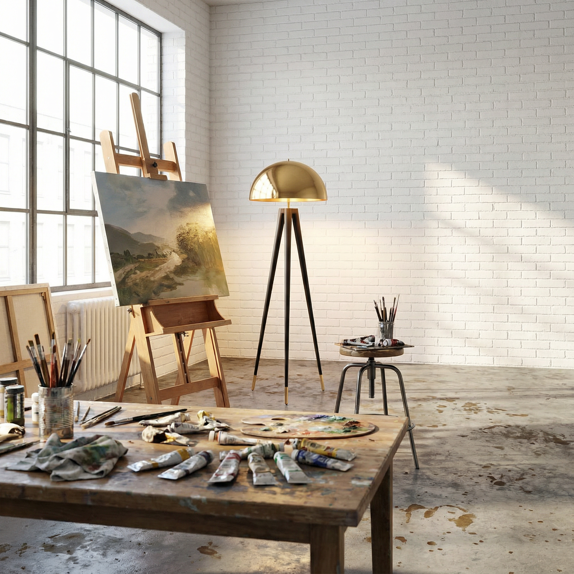 The Enzo floor lamp highlights clean geometry with its domed metallic shade and slender, tapered legs, creating a quiet yet confident focal point. Its warm ambient spread gently enhances seating areas and living zones, adding understated depth and evening comfort without overwhelming the room.