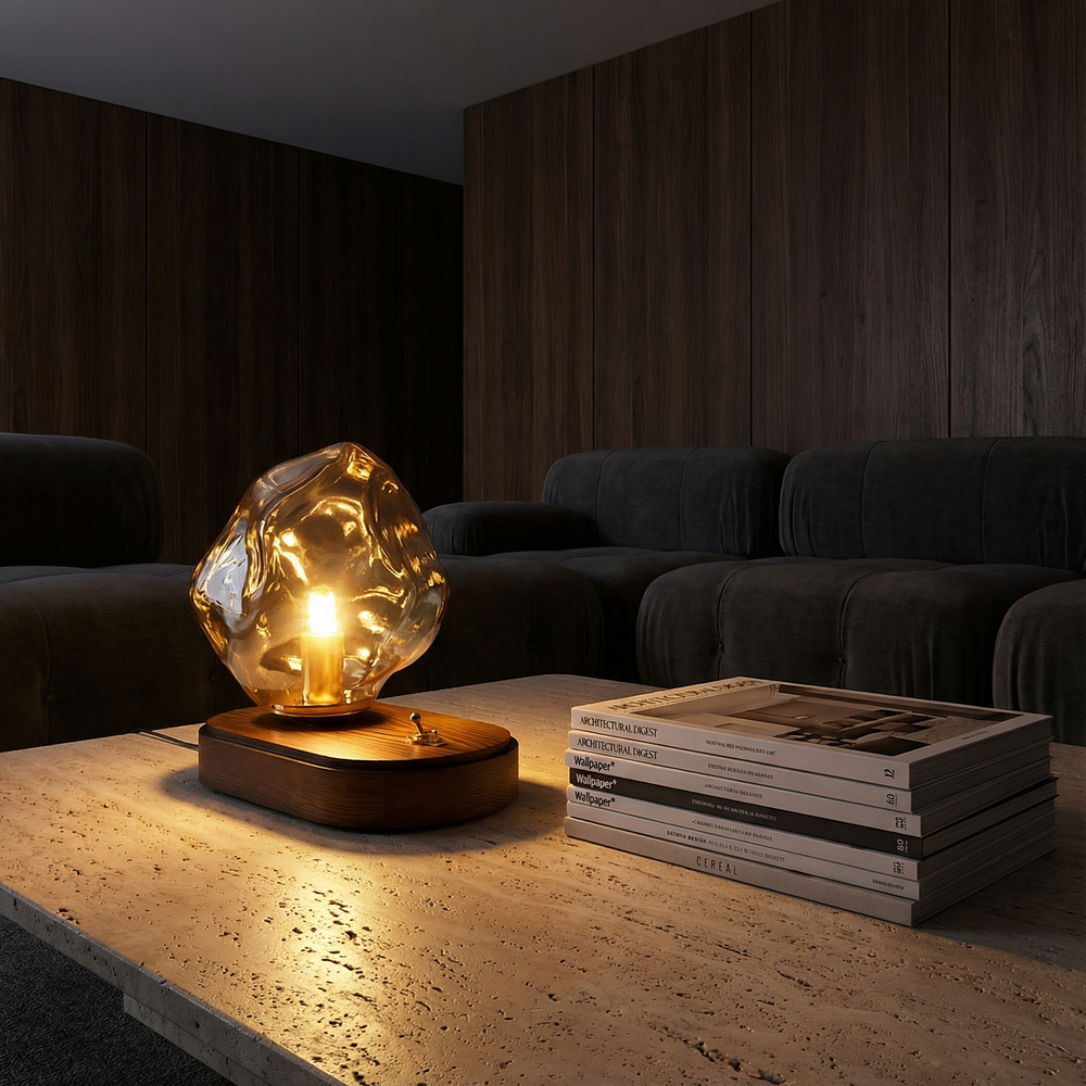 Fenn blends vintage charm with sculptural presence, using amber glass that appears fluid and almost molten when lit. Set on a grounded wooden base, it creates a warm, atmospheric glow that enhances quiet moments, intimate spaces, and thoughtfully styled interiors.
