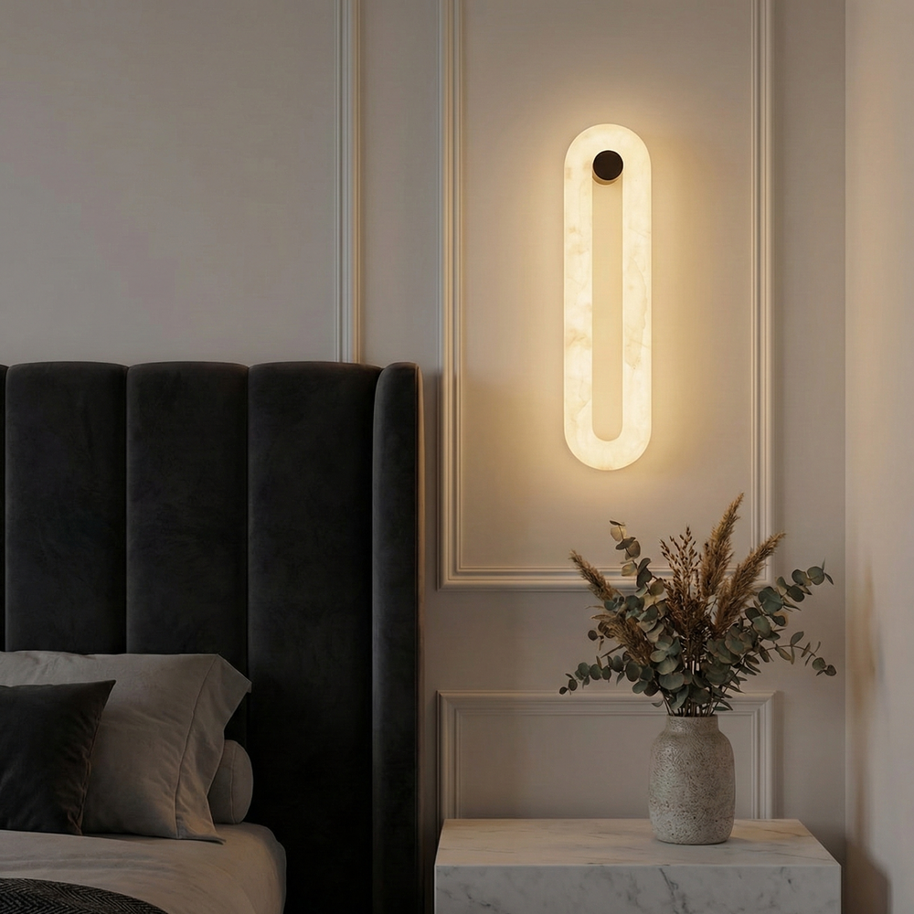 The Galen’s continuous alabaster loop reveals delicate natural veining, creating a quiet interplay of light and stone. Its elongated form adds an understated yet luxurious presence, enhancing modern interiors with soft architectural character.