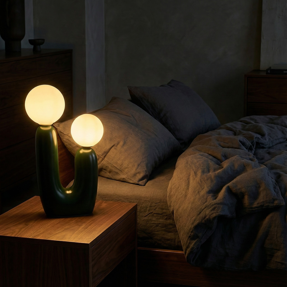 With its twin orb design and fluid resin base, Gray feels both artistic and approachable. The soft glass globes diffuse light evenly, creating a gentle warmth that enhances modern interiors, bedside settings, and styled surfaces without overpowering the room.