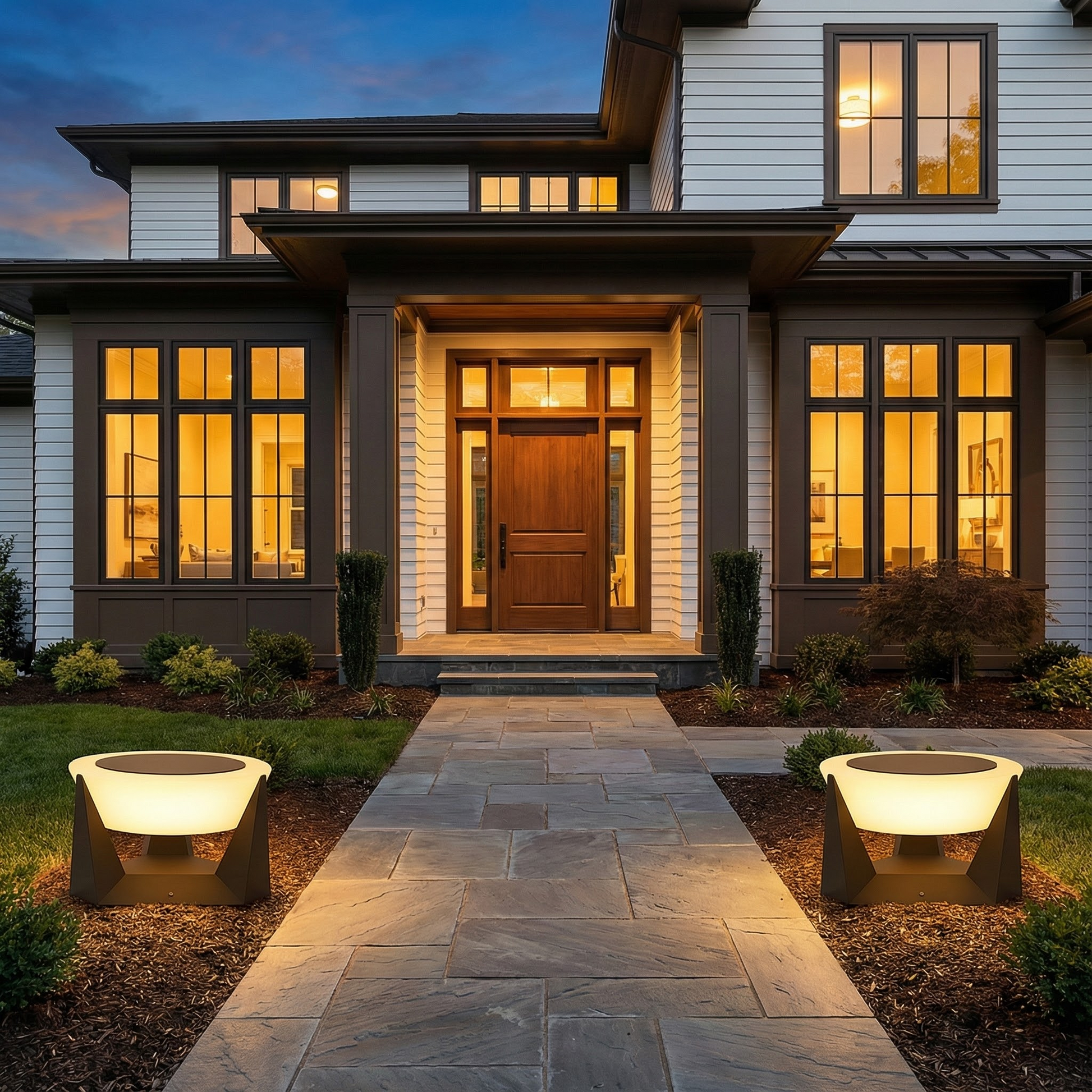 A refined pathway light that brings structured clarity and soft presence to modern outdoor environments.
