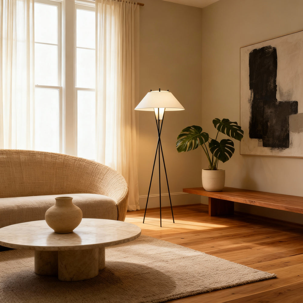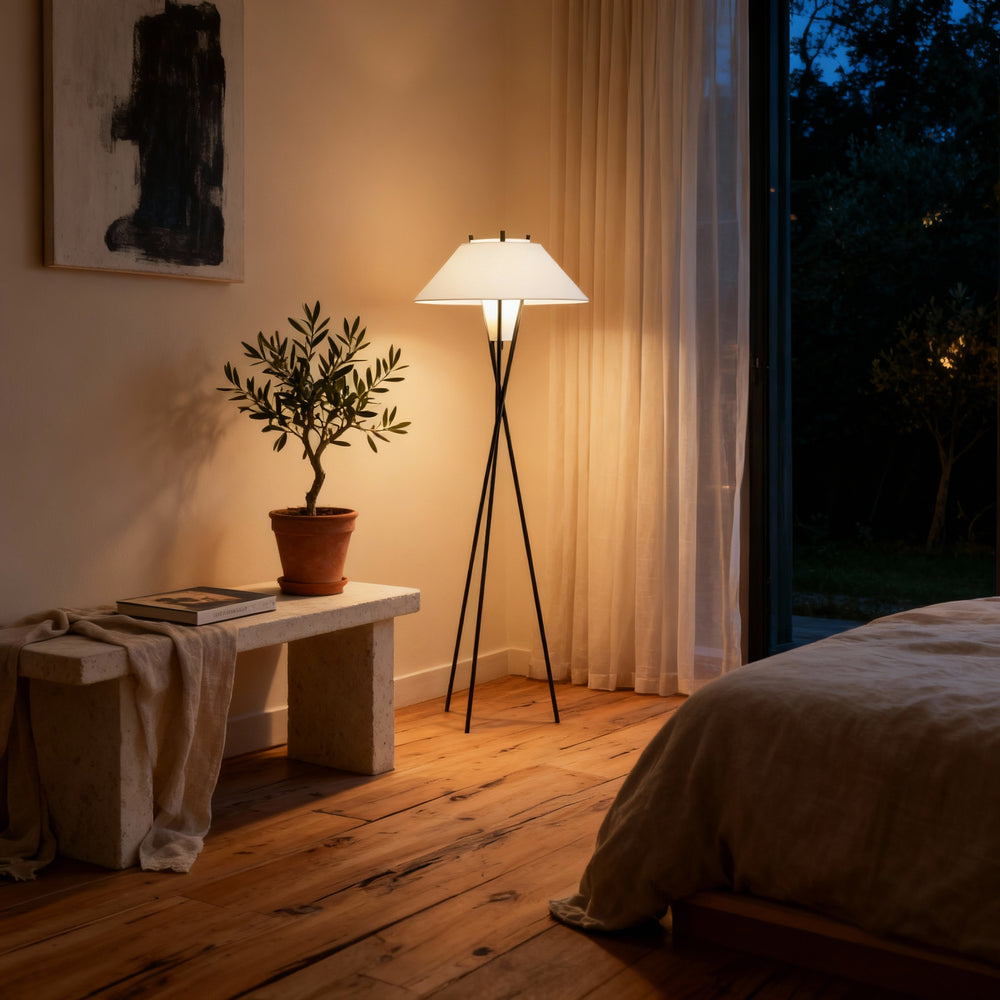 The wide shade diffuses ambient light with ease, while the tripod structure offers subtle sculptural interest. Helin suits both cozy corners and spacious living areas inspired by Nordic calm.