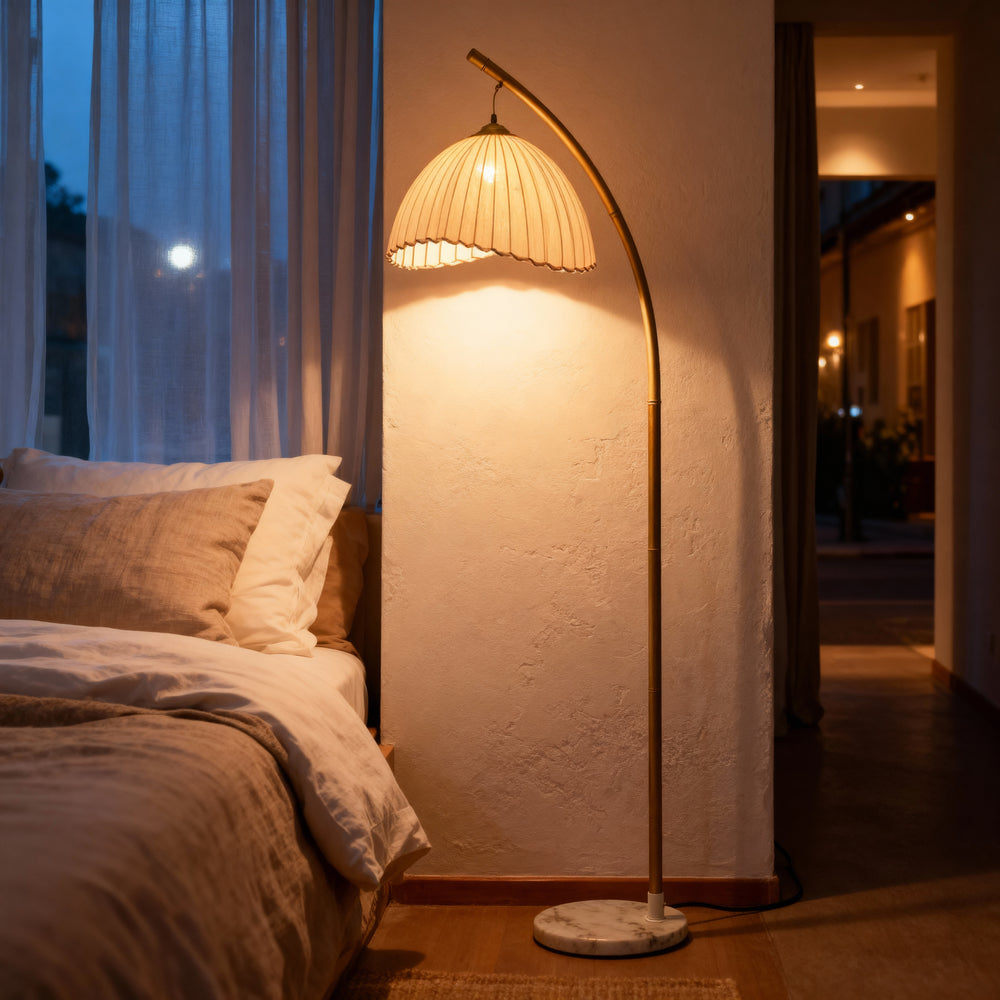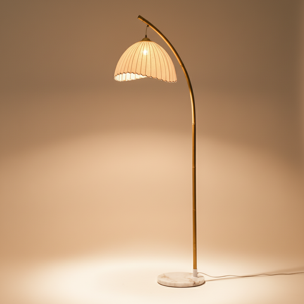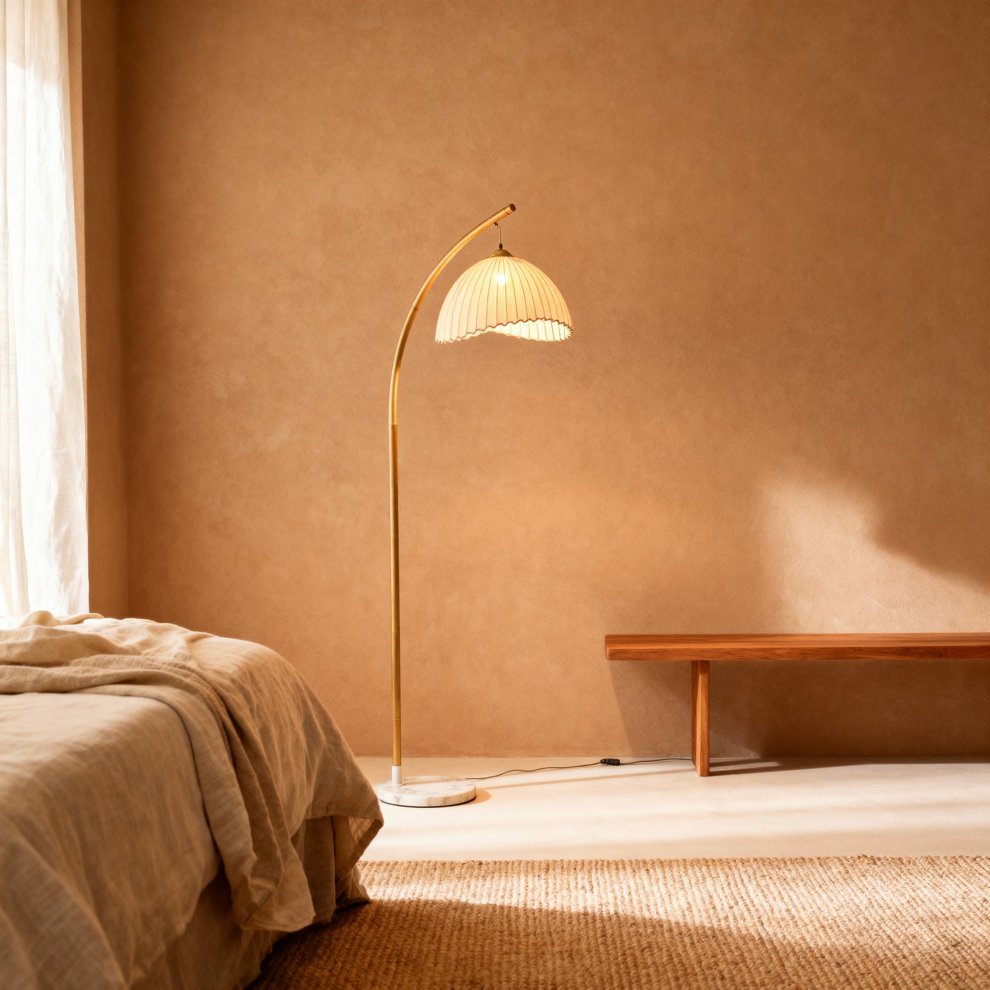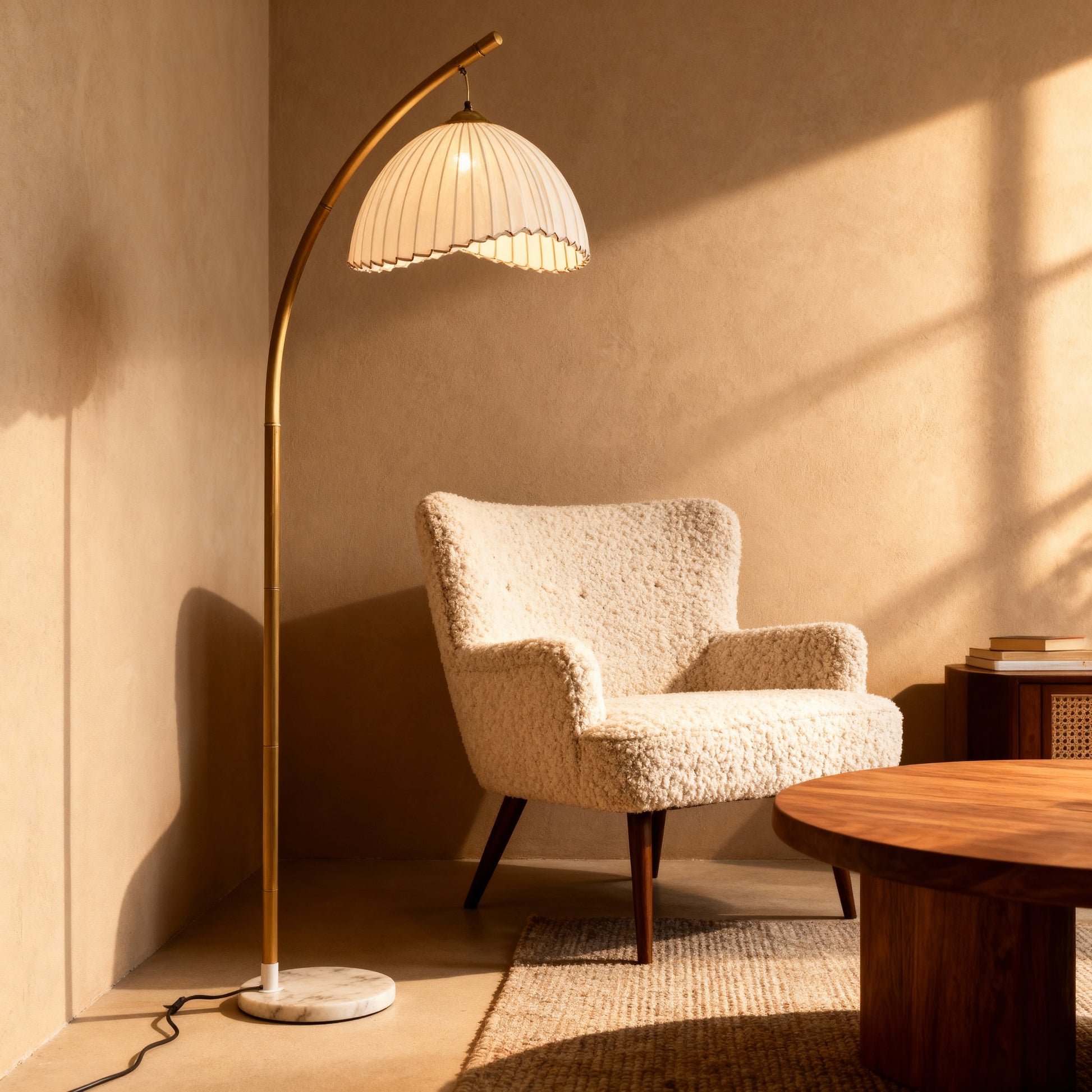 An elegant curve lifts the pleated dome so light falls exactly where you need it, creating a gentle halo against surrounding walls. The gold finish reads warm without glare, pairing easily with neutral palettes, stone, and wood for a composed, lived-in feel.