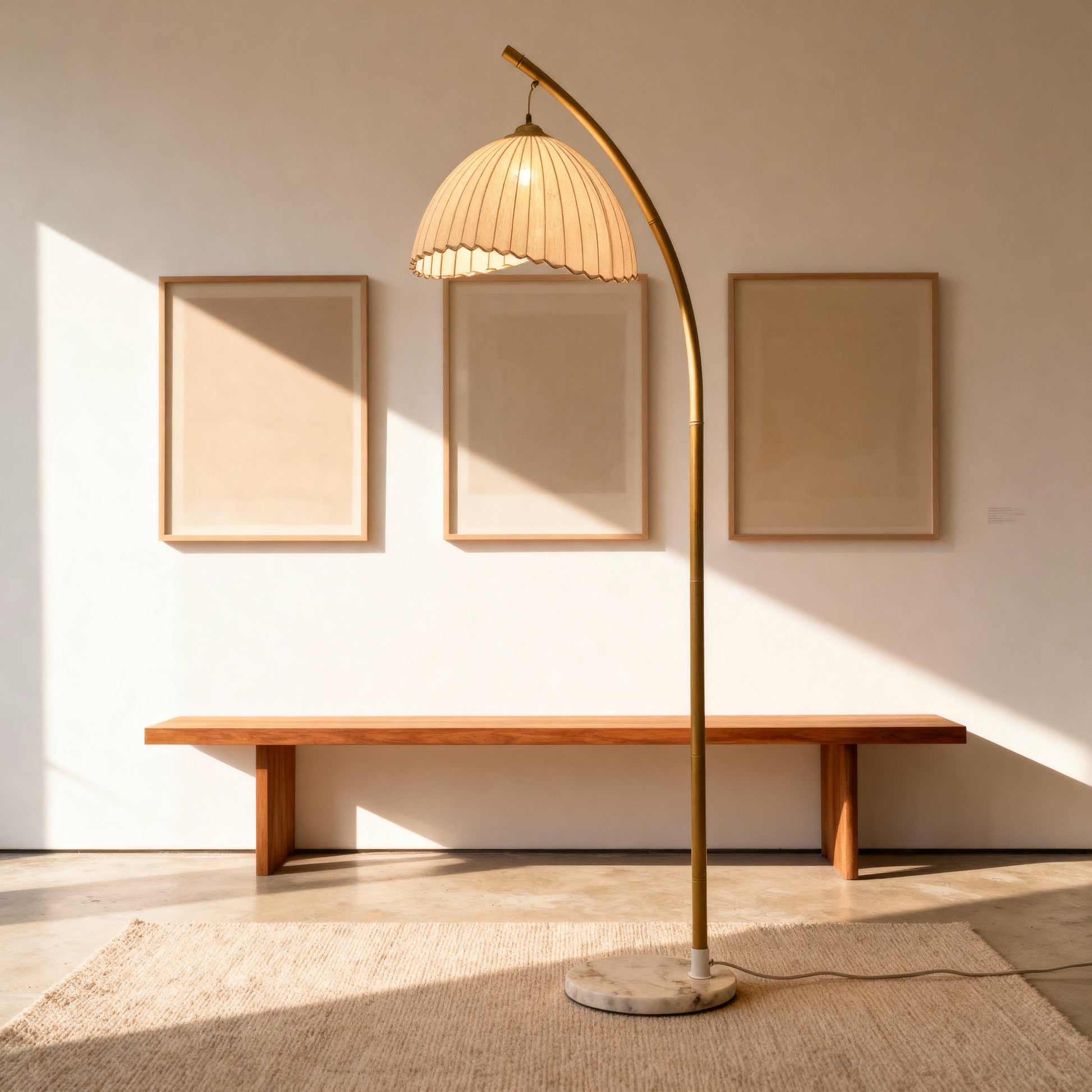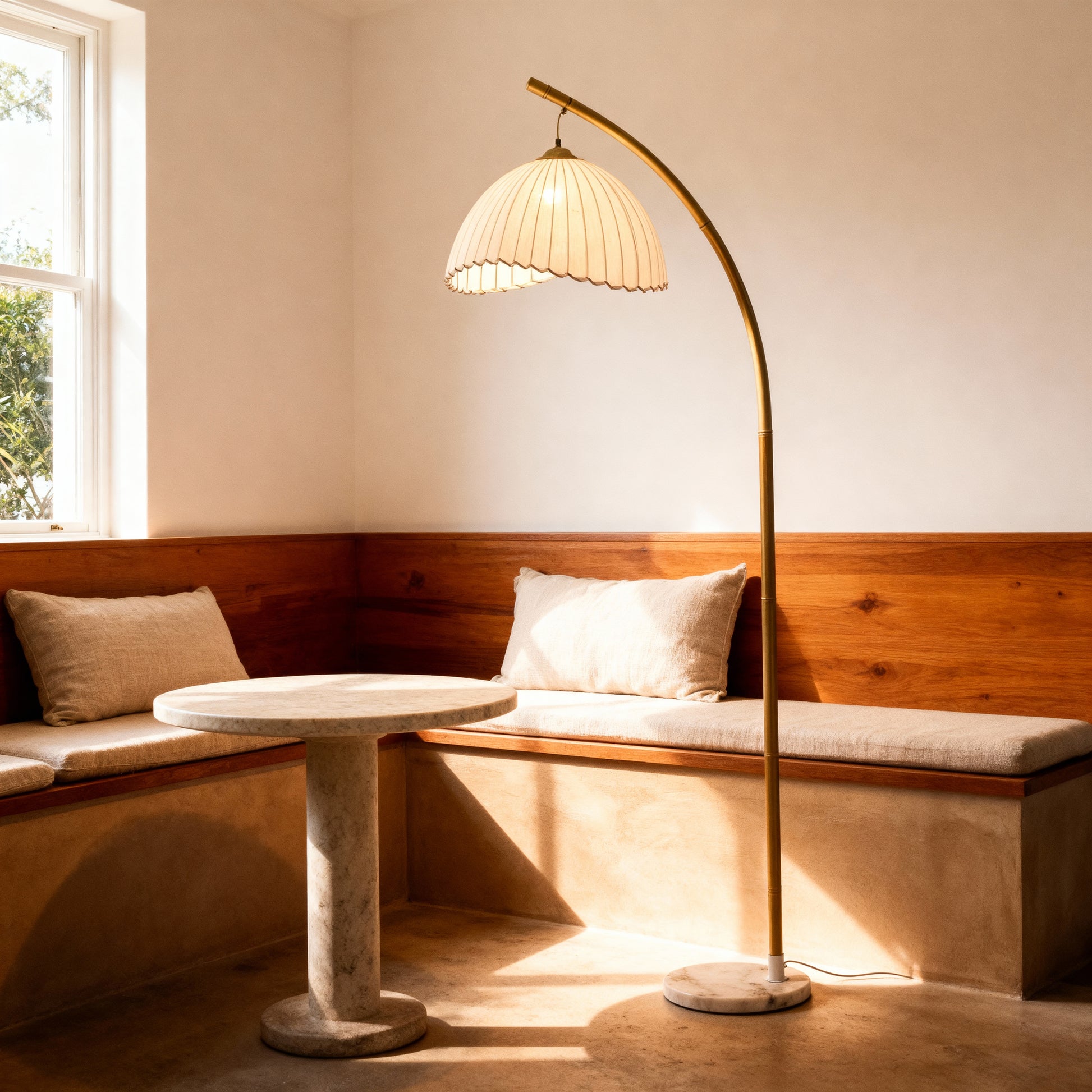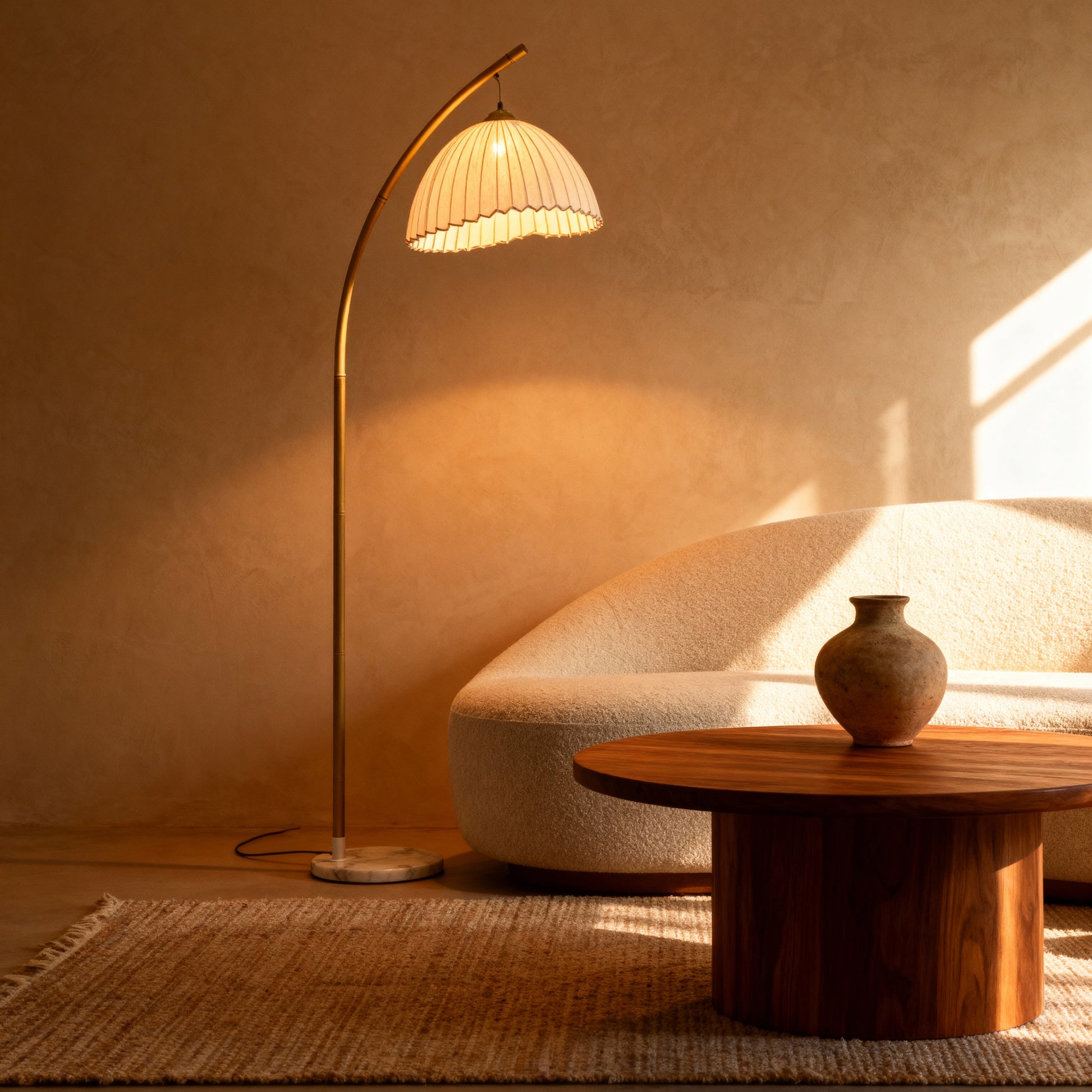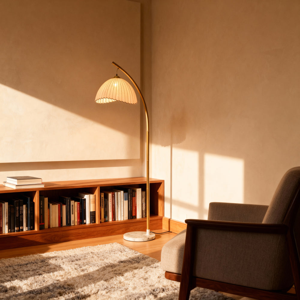 An elegant curve lifts the pleated dome so light falls exactly where you need it, creating a gentle halo against surrounding walls. The gold finish reads warm without glare, pairing easily with neutral palettes, stone, and wood for a composed, lived-in feel.