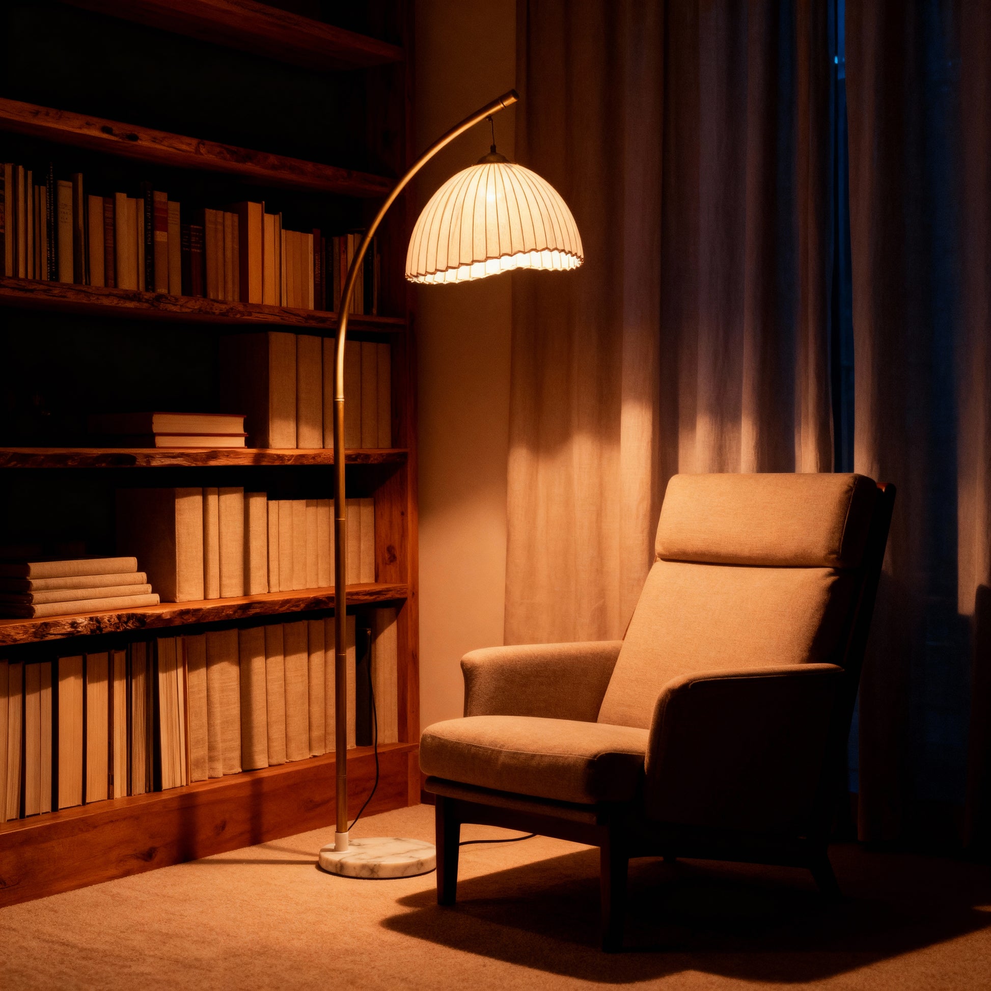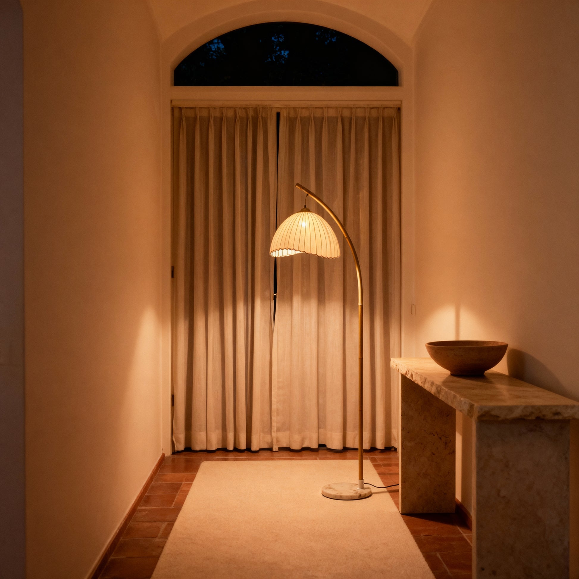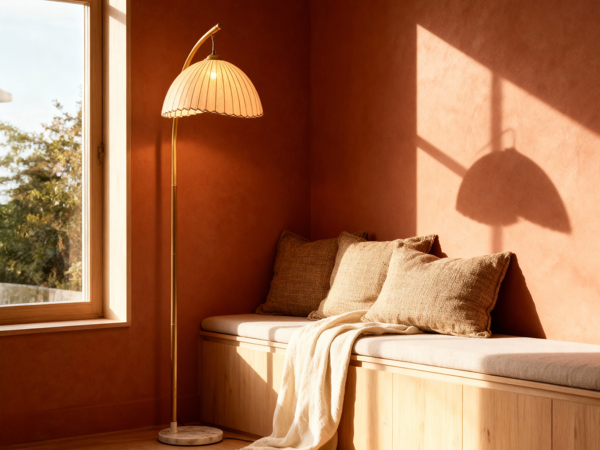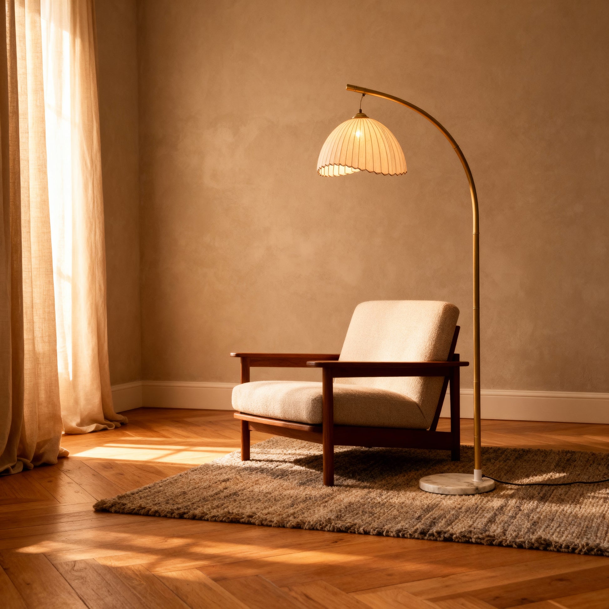 An elegant curve lifts the pleated dome so light falls exactly where you need it, creating a gentle halo against surrounding walls. The gold finish reads warm without glare, pairing easily with neutral palettes, stone, and wood for a composed, lived-in feel.