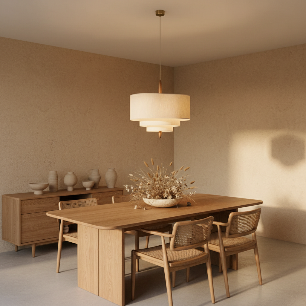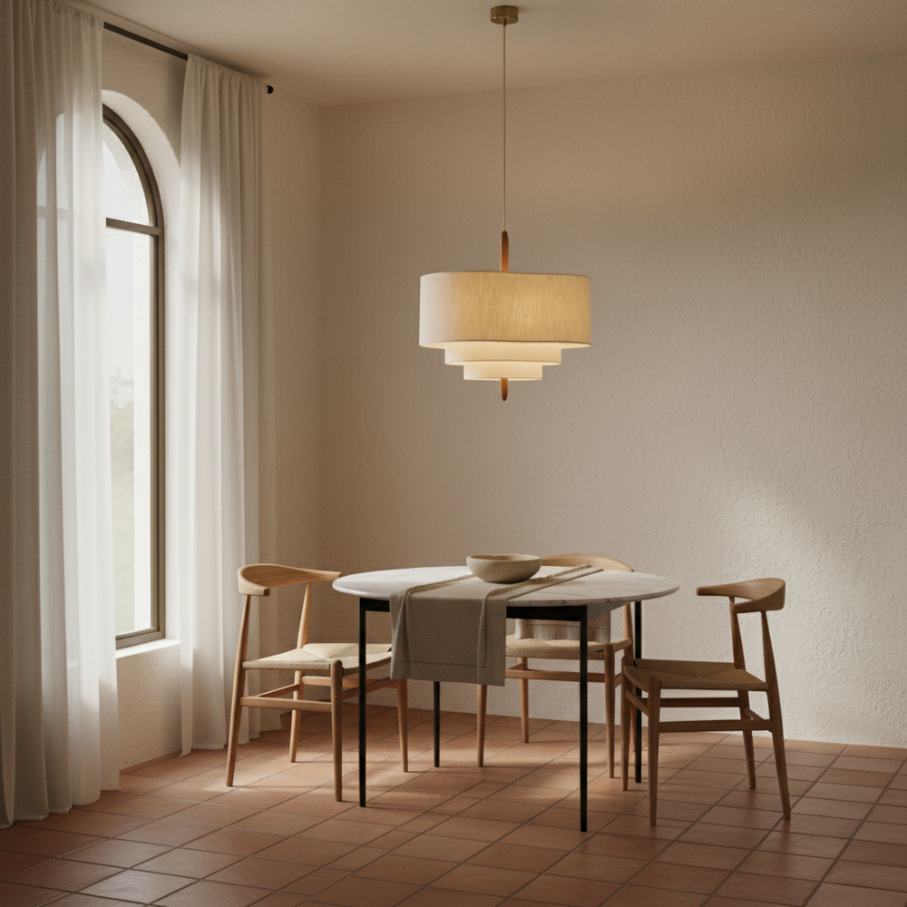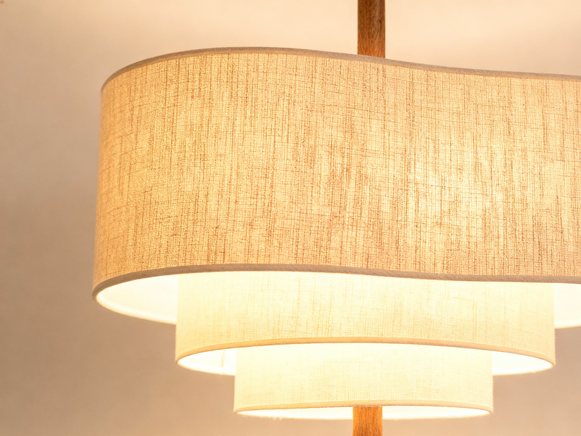 The Jett ceiling light combines clean symmetry with the warmth of fabric and soft illumination. Its graceful, tiered design adds subtle depth to interiors while casting a calm, even glow across the room.