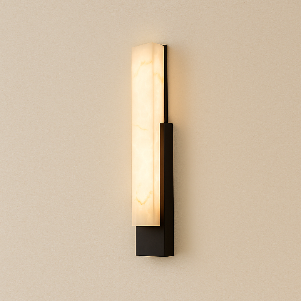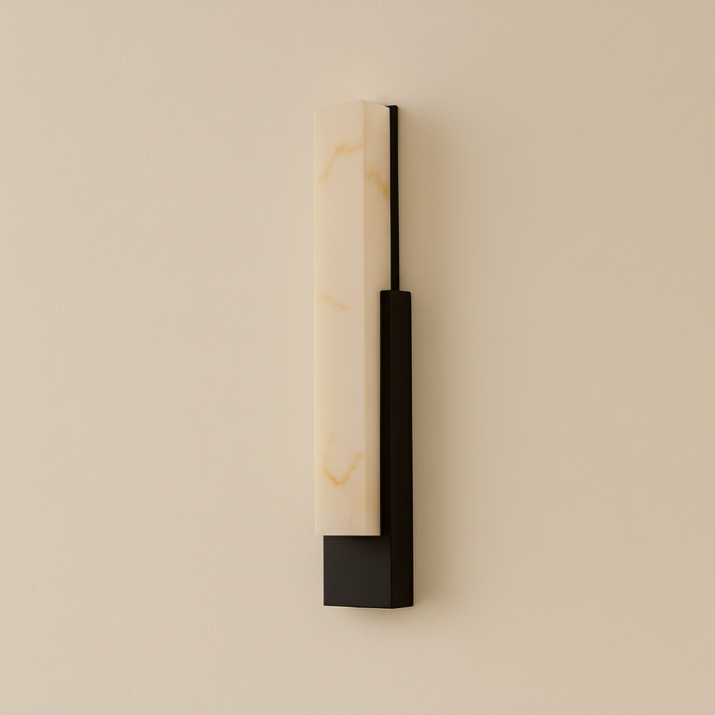 The Julia sconce features a striking asymmetrical design, where a glowing marble-effect panel appears to float against its dark steel base. Each panel offers its own subtle veining, providing a unique, sophisticated accent built to endure the outdoor elements.