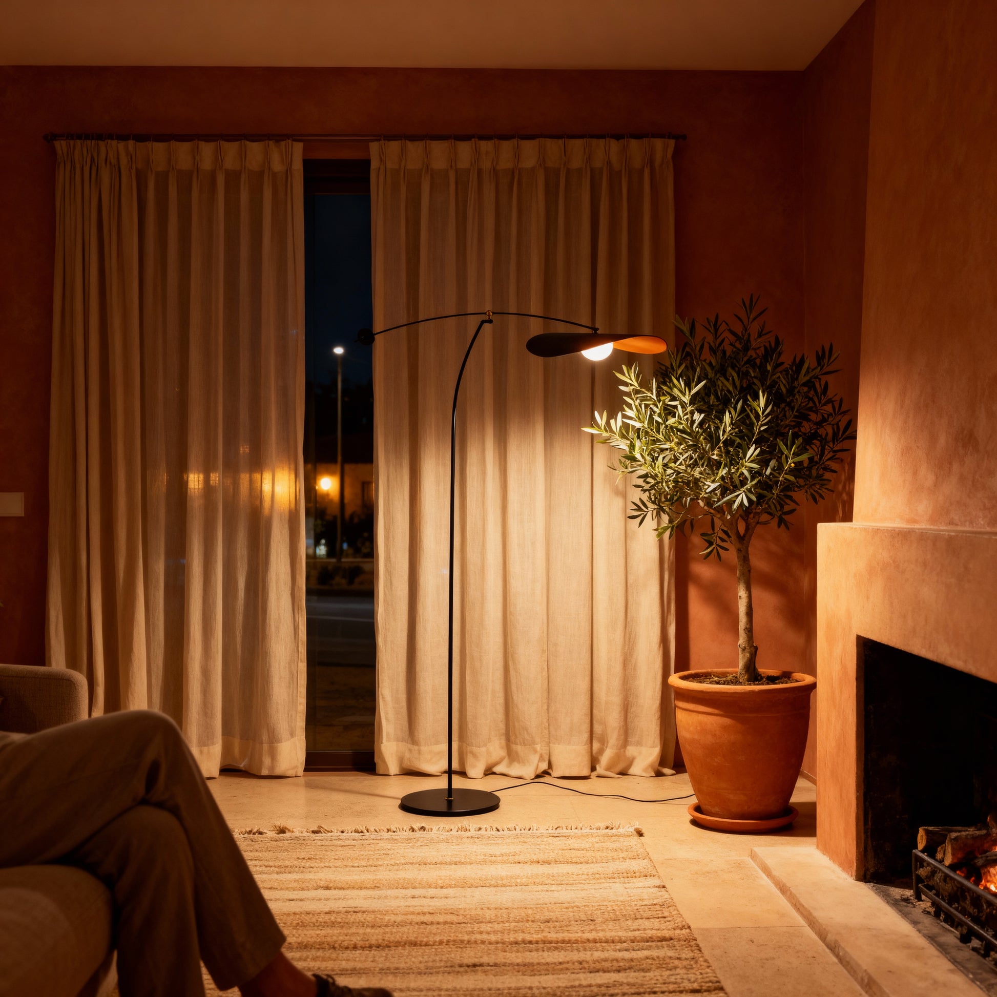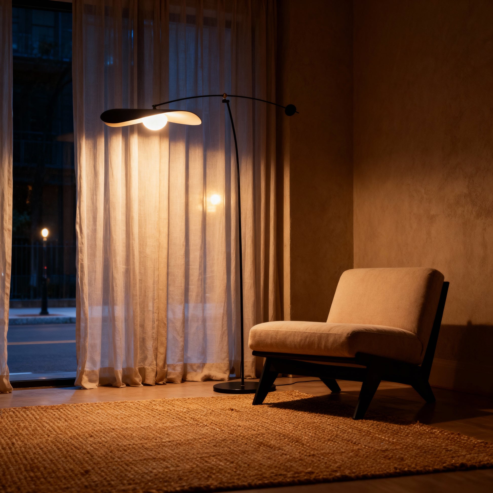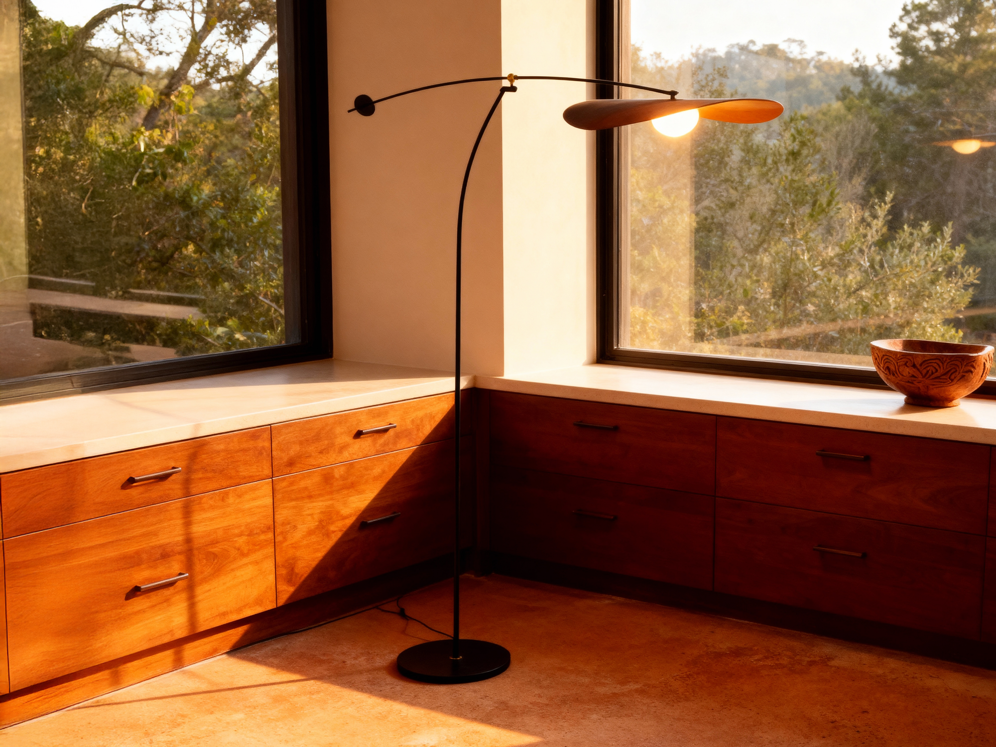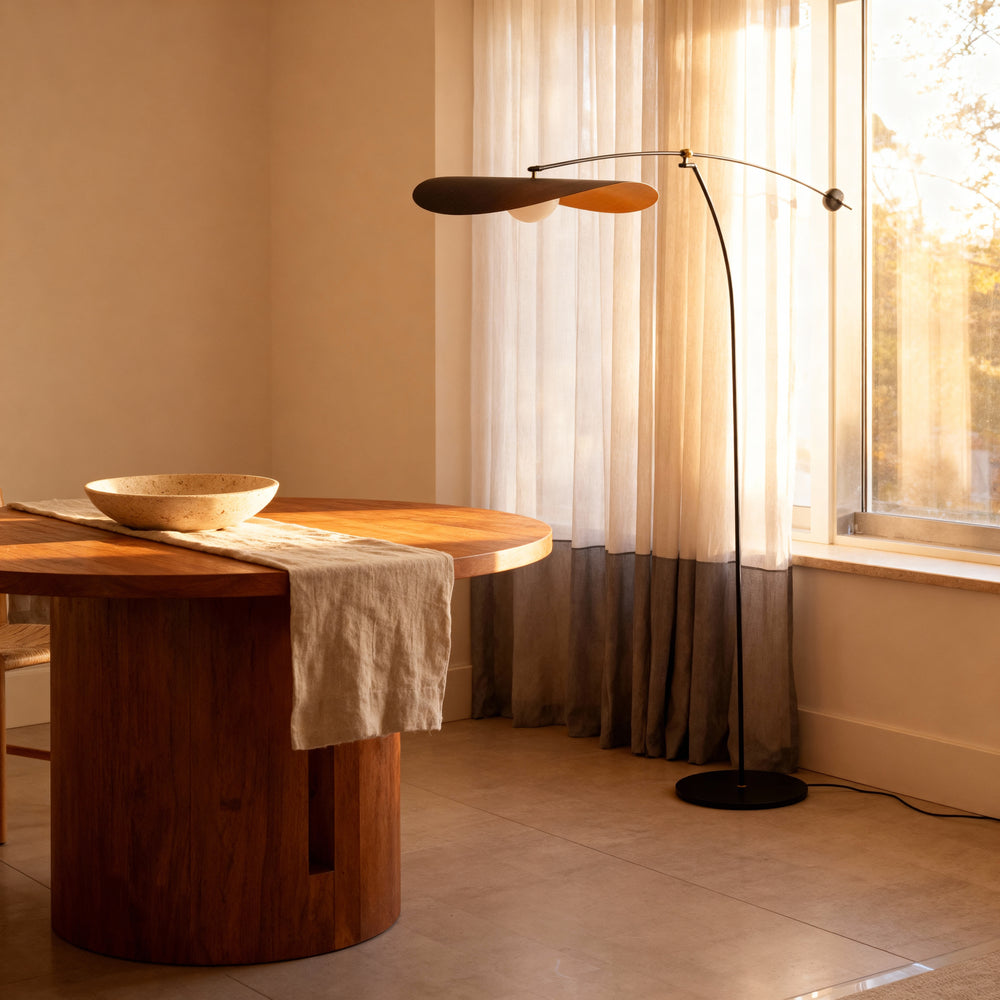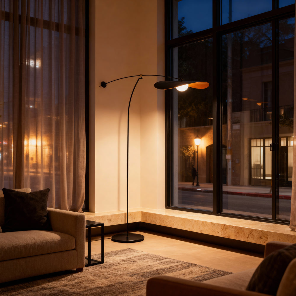A counterbalanced arc with a sculpted shade brings warm, focused light with minimal footprint.