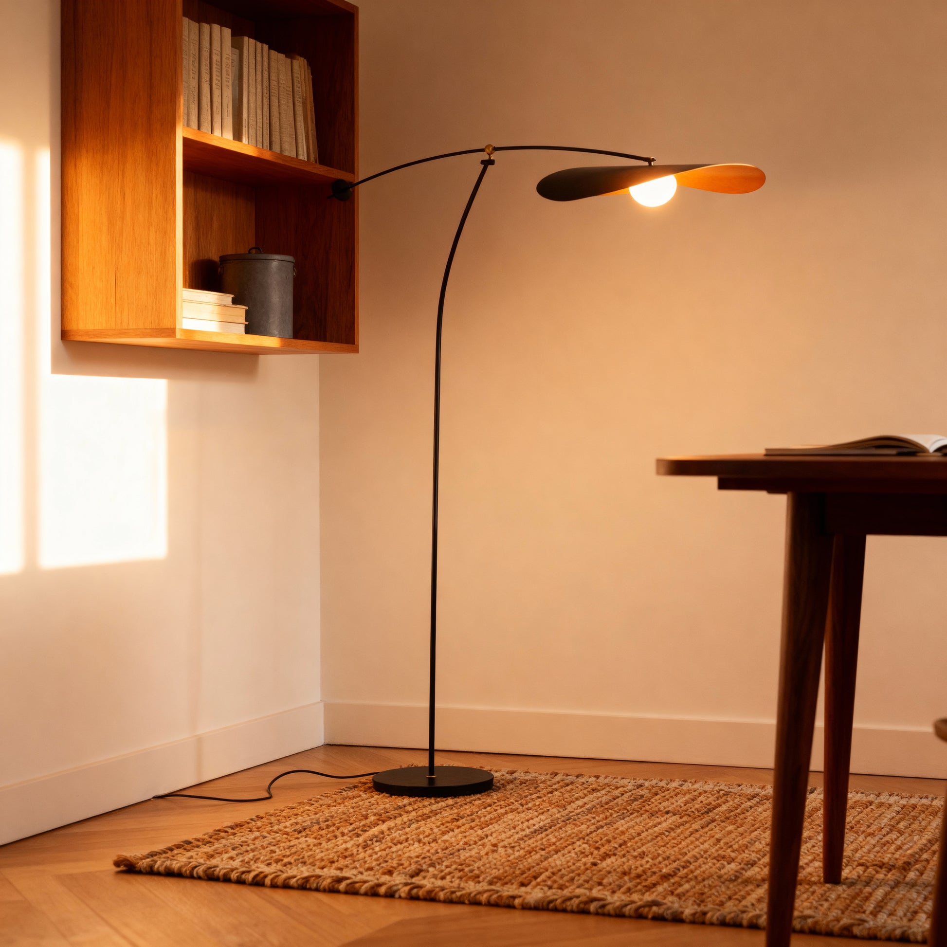 A slim upright rises into a long, balanced arm, ending in a softly curved shade that cradles the lamp’s glow. The composition reads light and intentional, projecting a warm pool of illumination while keeping the base discreet to preserve clean circulation and an uncluttered scene.