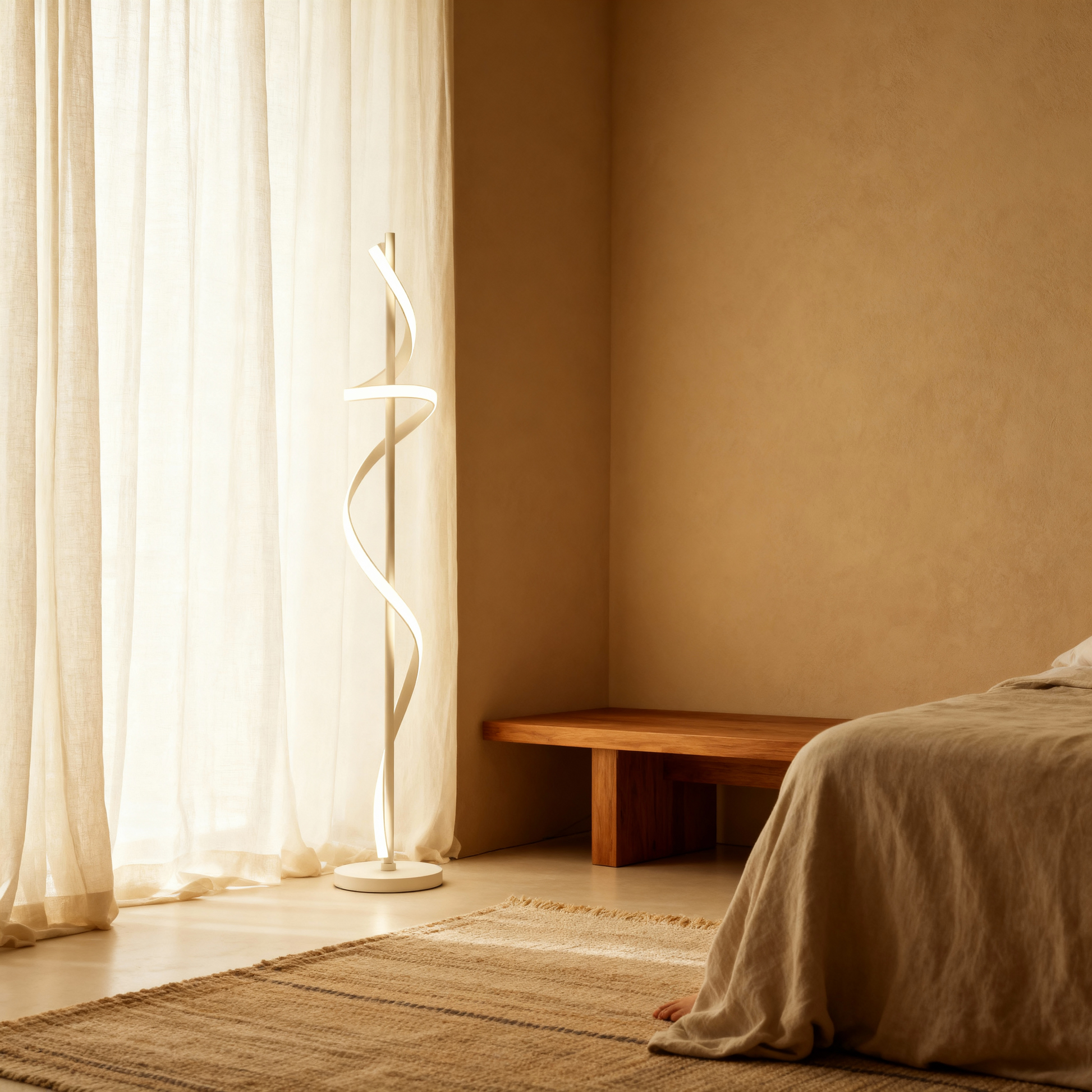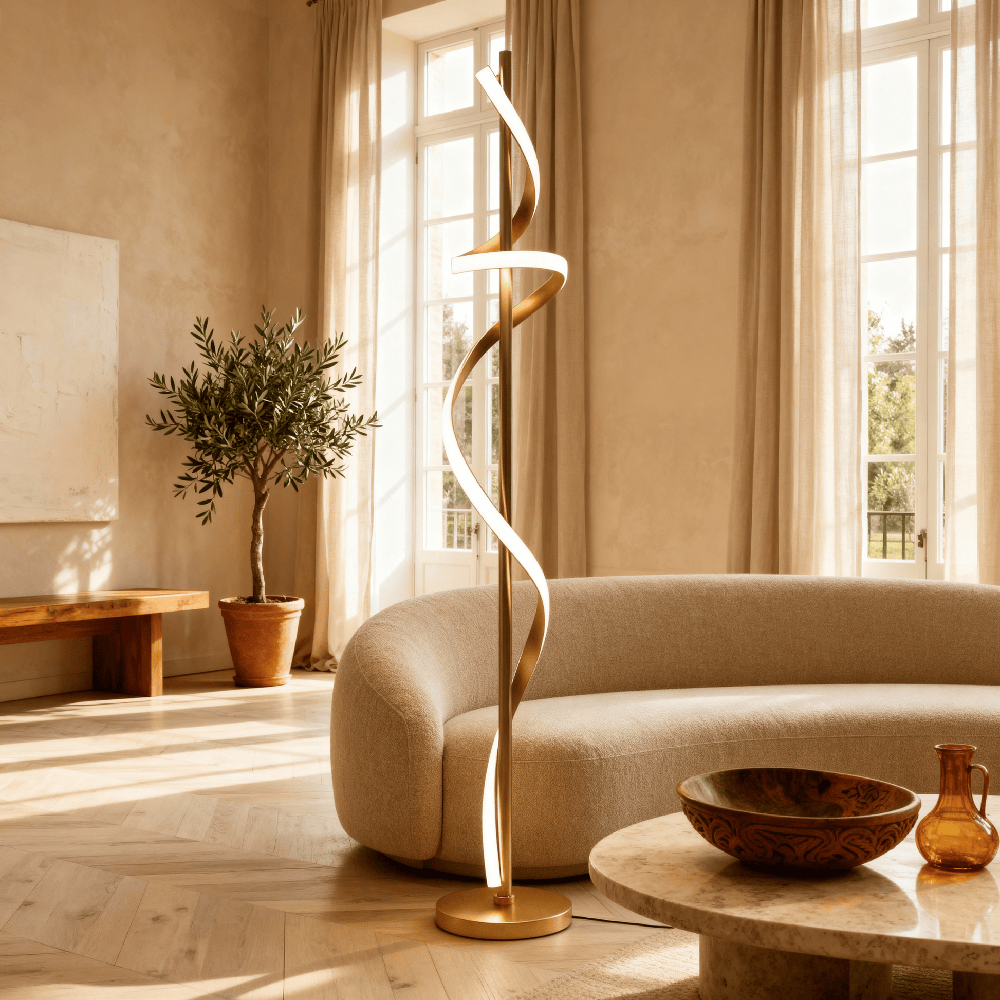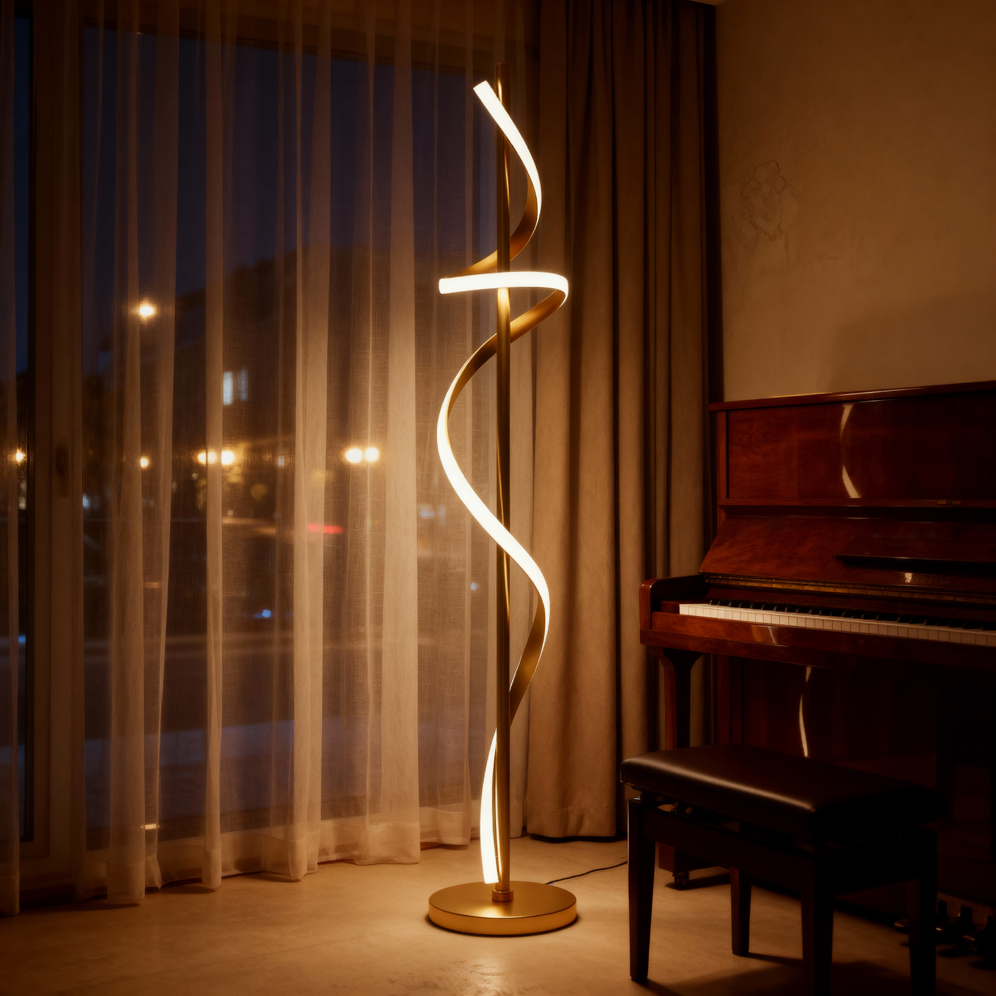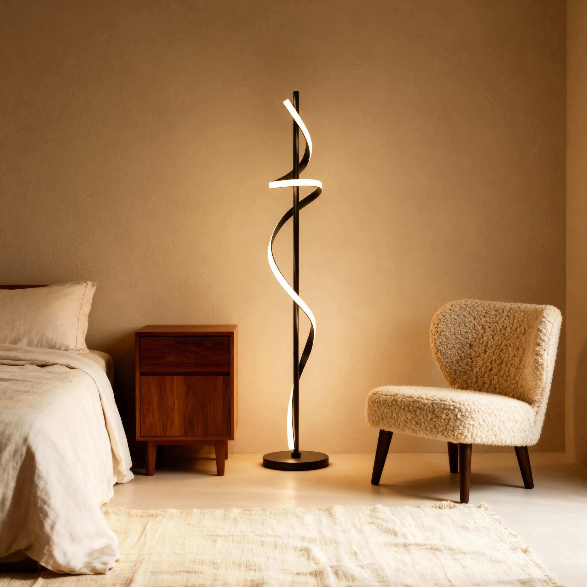 A modern spiral floor lamp that blends luminous motion with refined minimalism for elevated interiors.