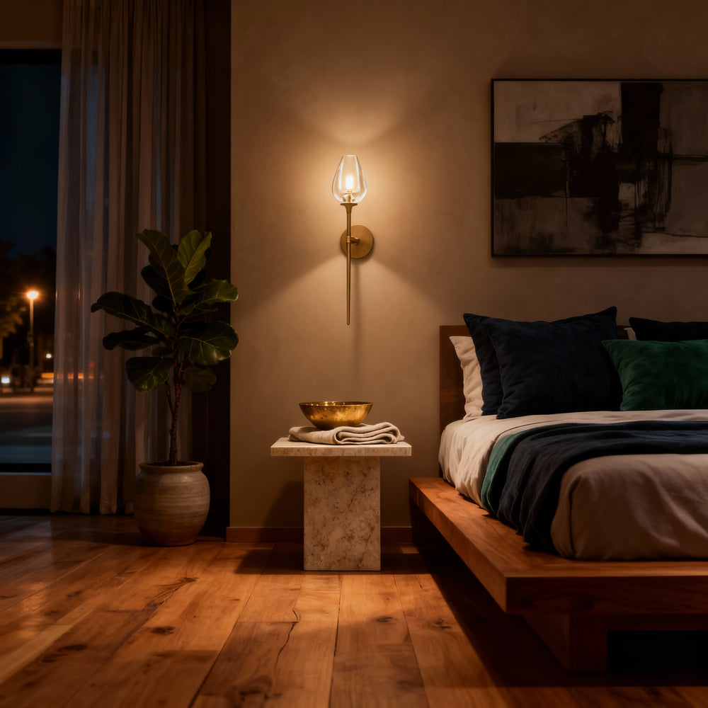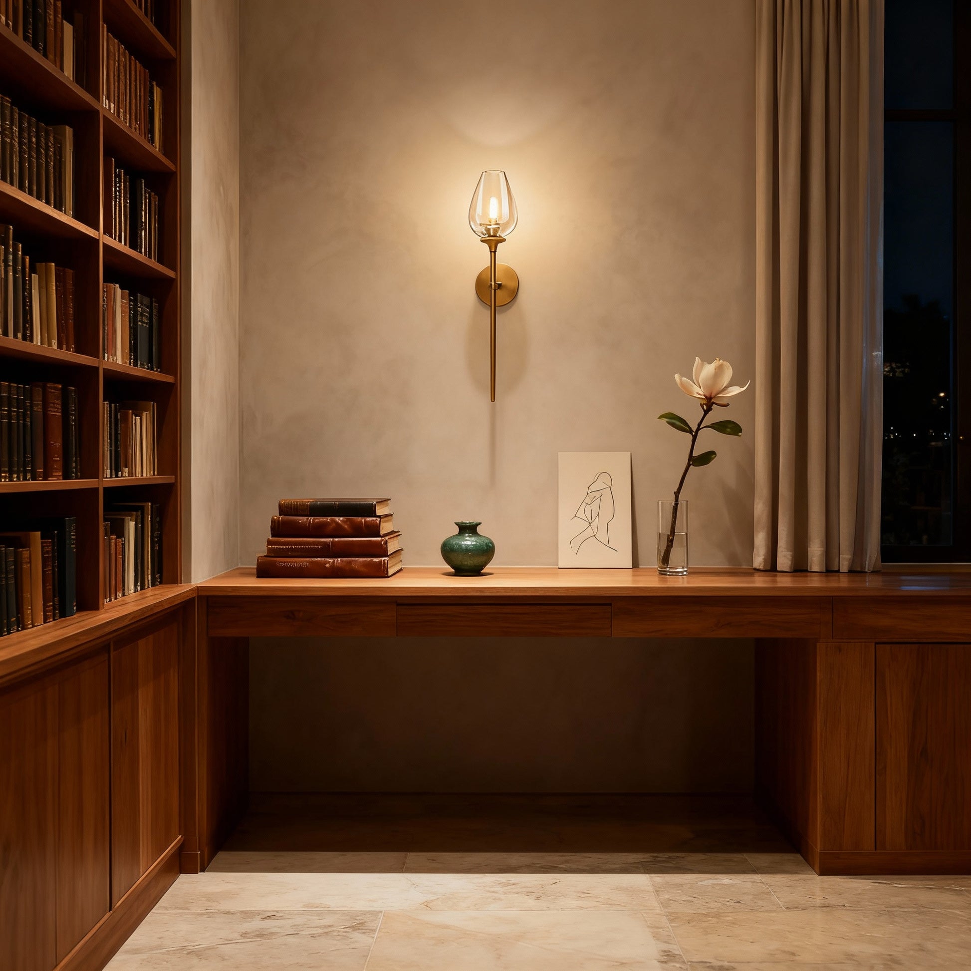 A statement of light and form, Loom captures the essence of modern refinement. Its elongated brass stem and crystalline diffuser evoke balance and clarity, casting a soft ambient glow that transforms walls into luminous architecture.