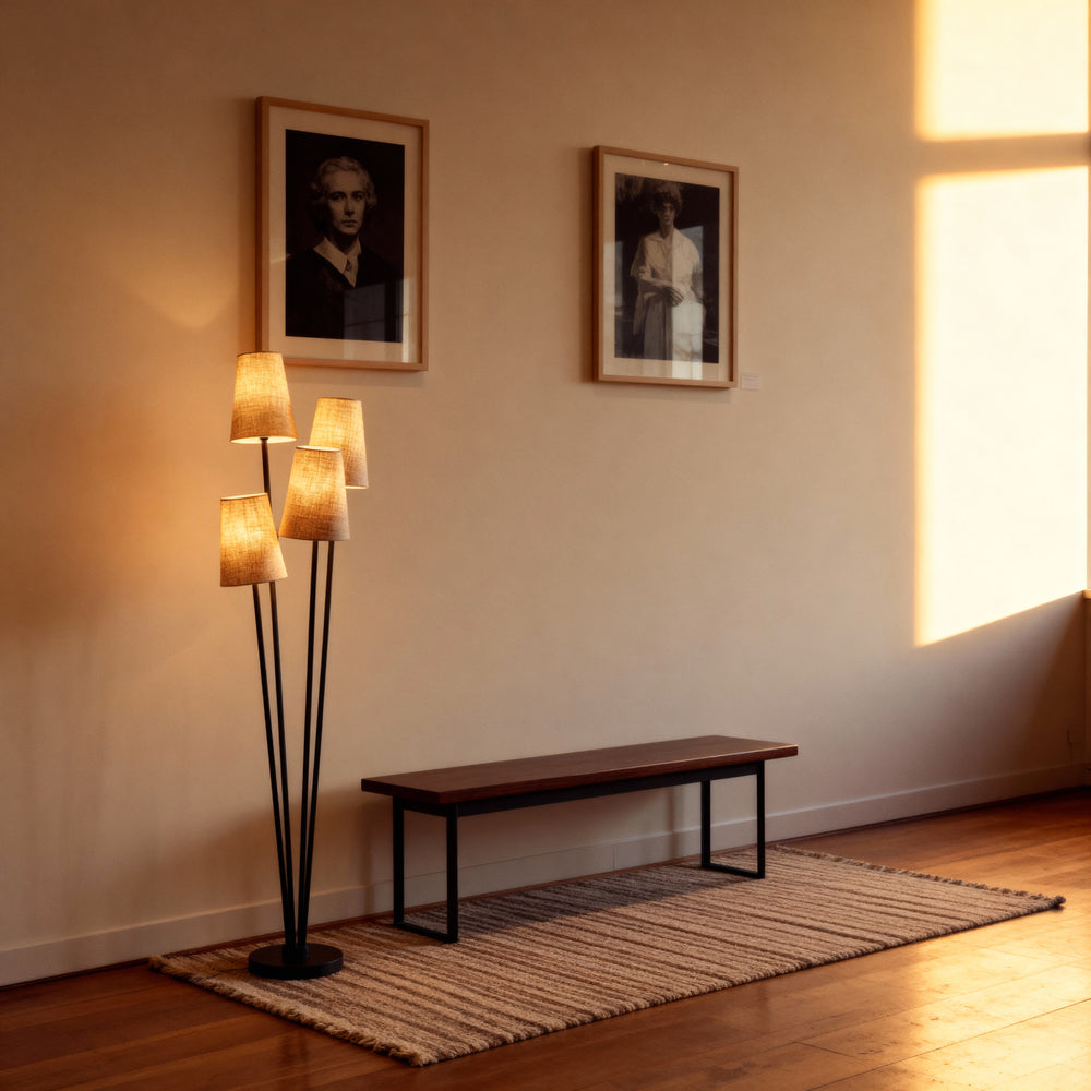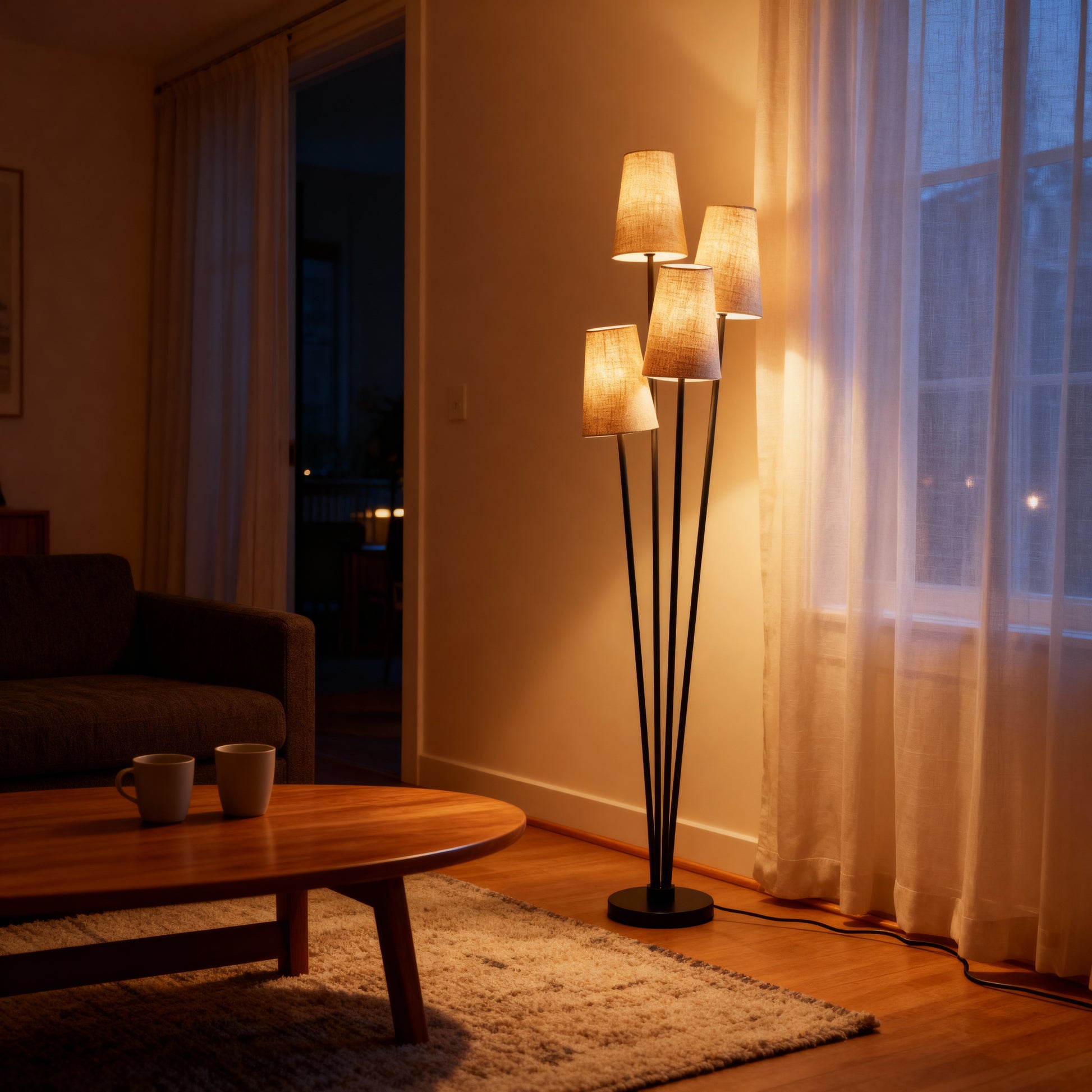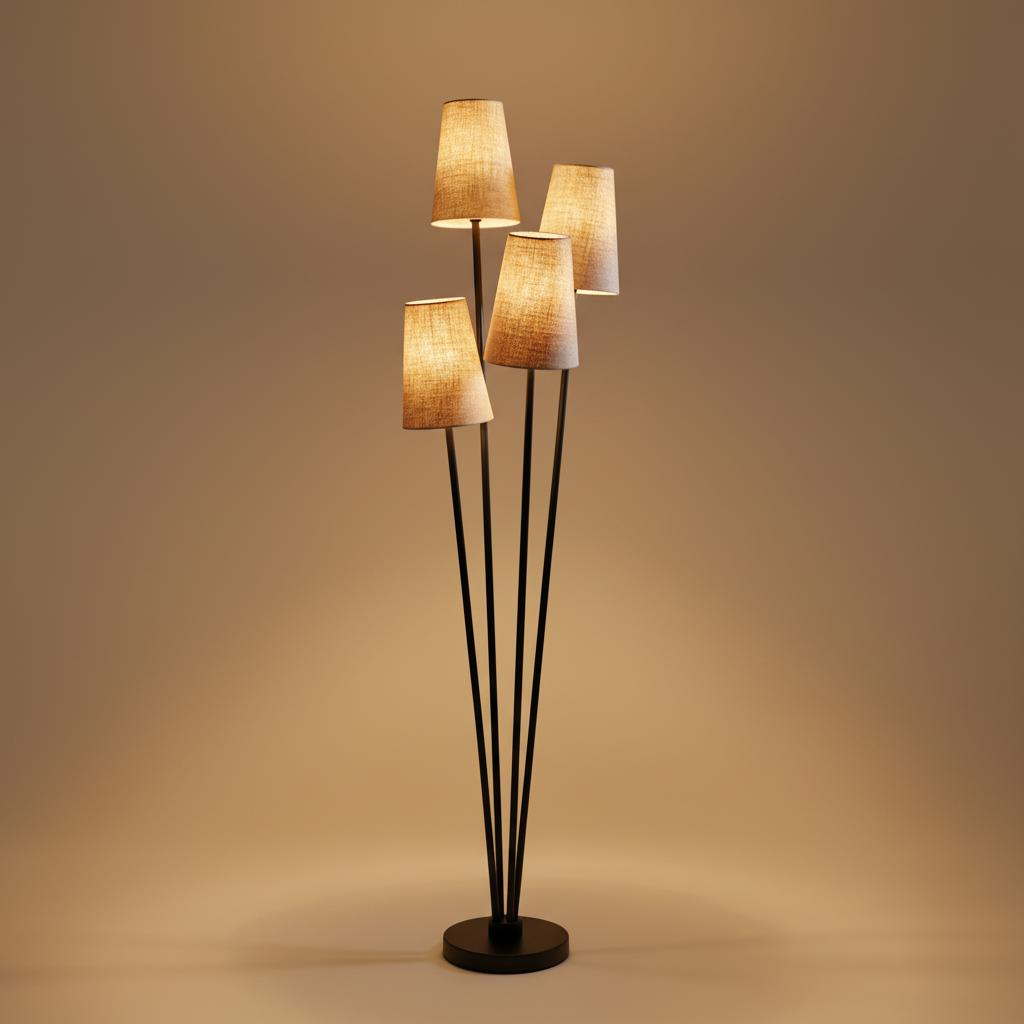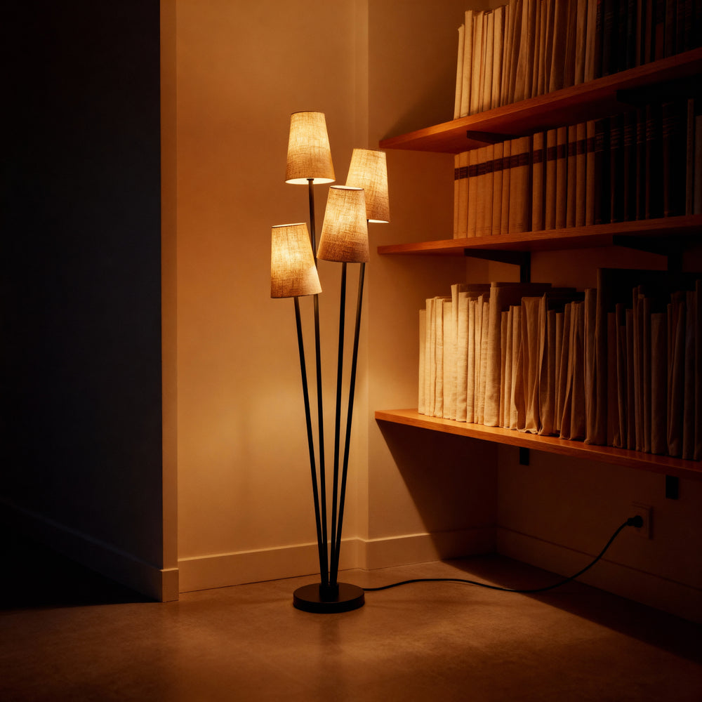 A clustered floor lamp with four tapered shades and slender stems for layered, ambient illumination.