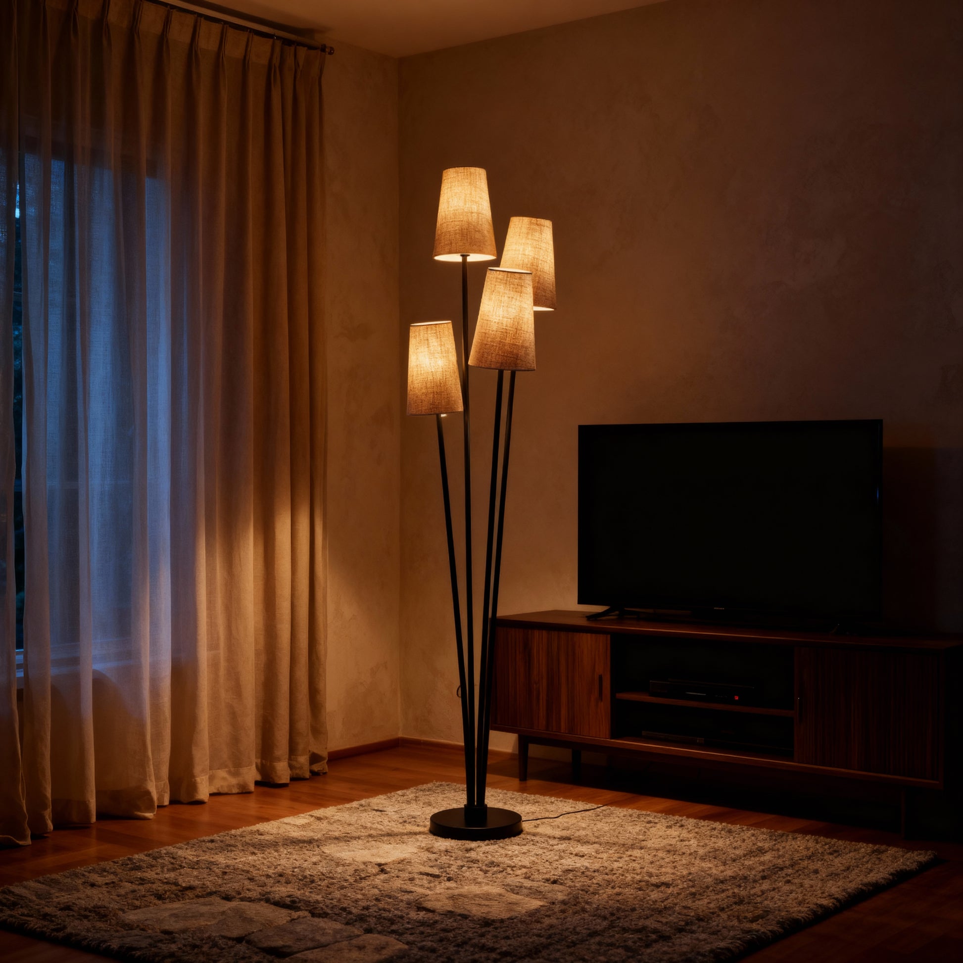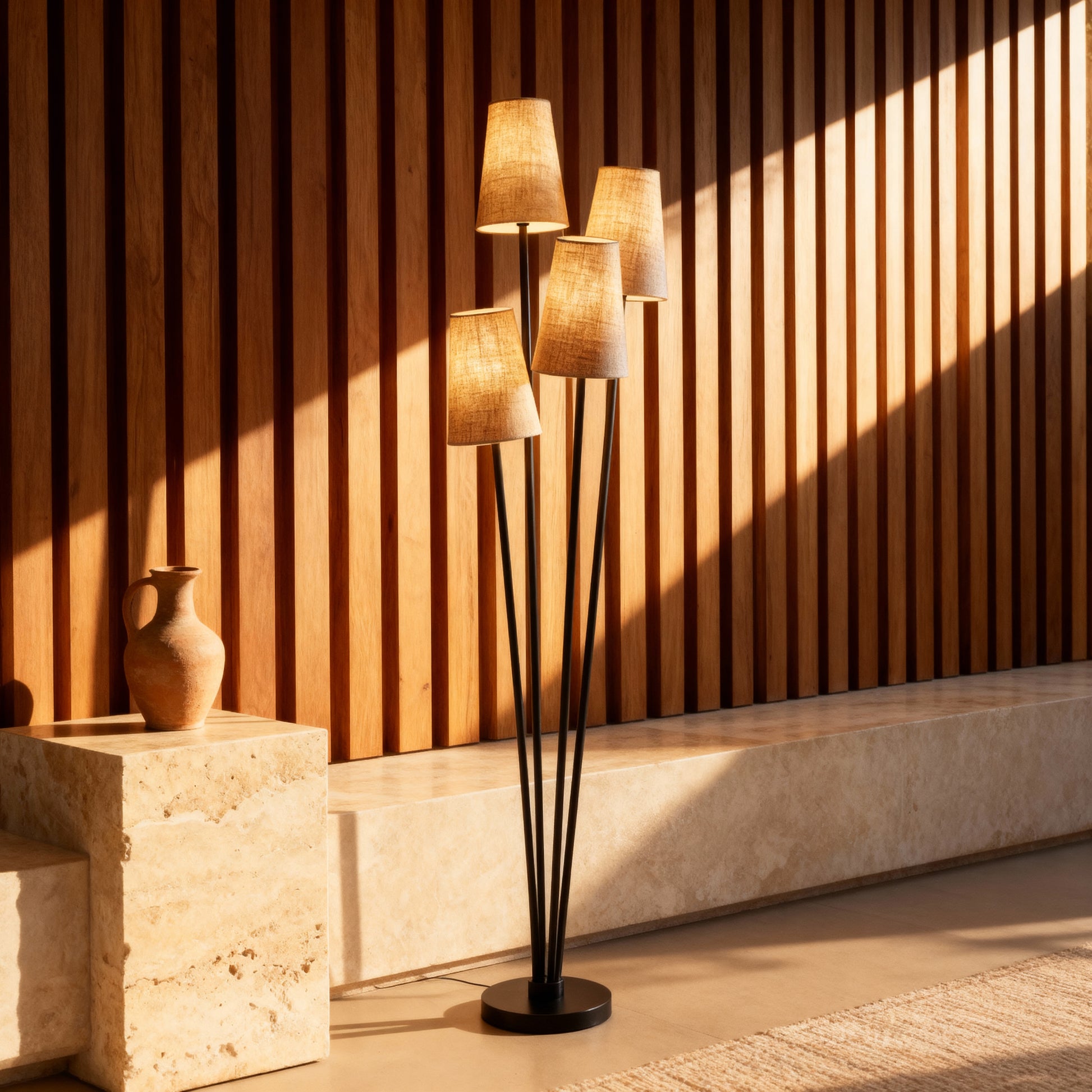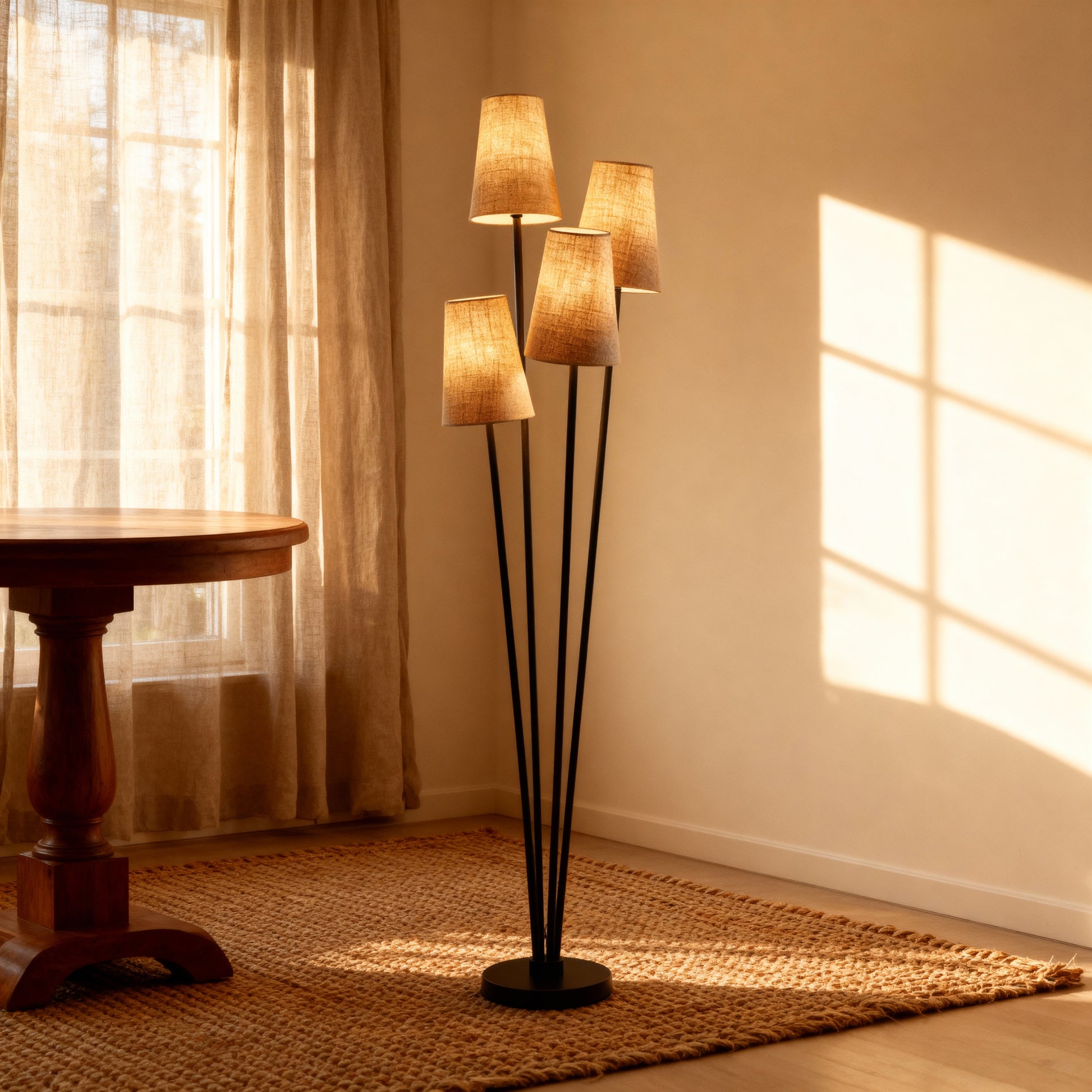 A clustered floor lamp with four tapered shades and slender stems for layered, ambient illumination.