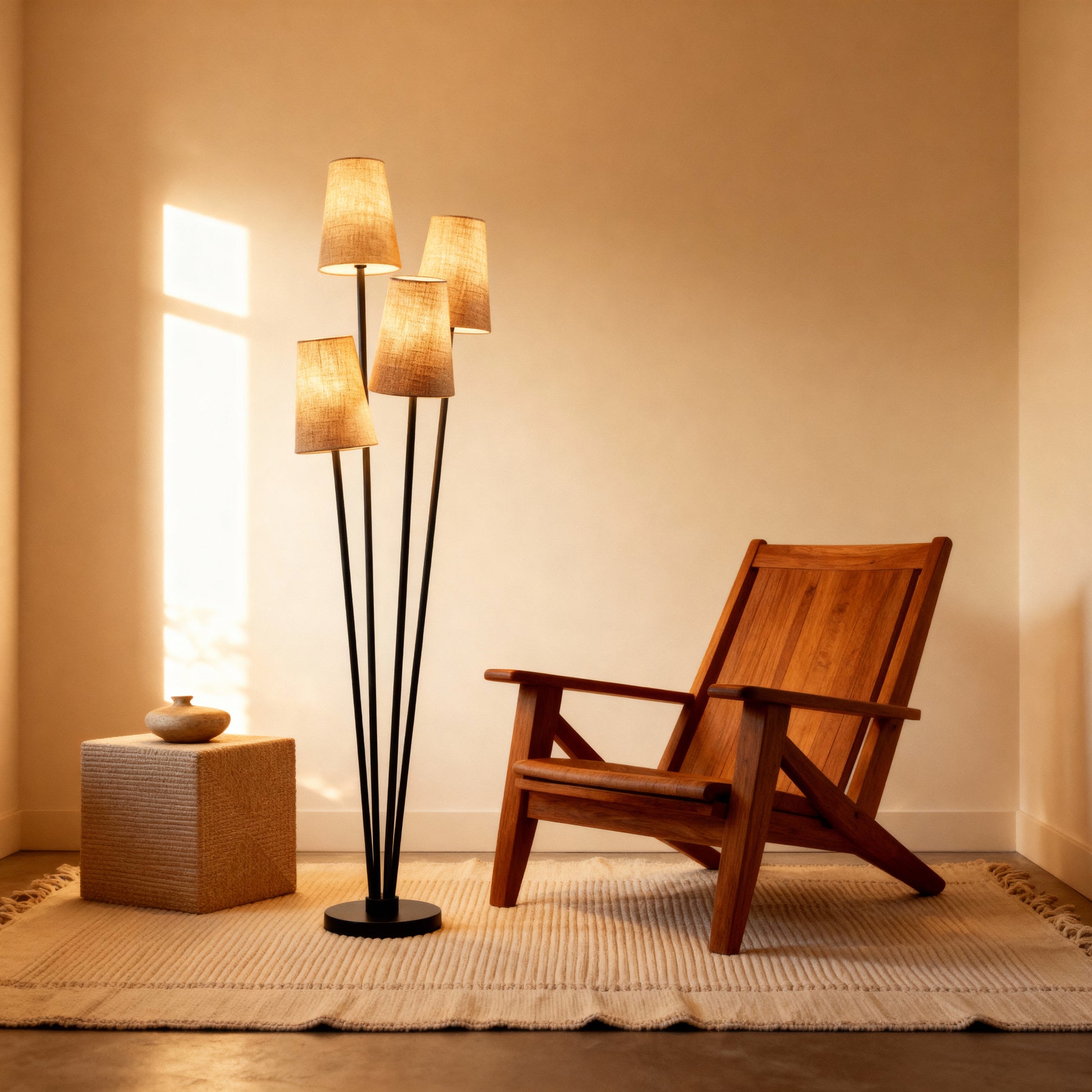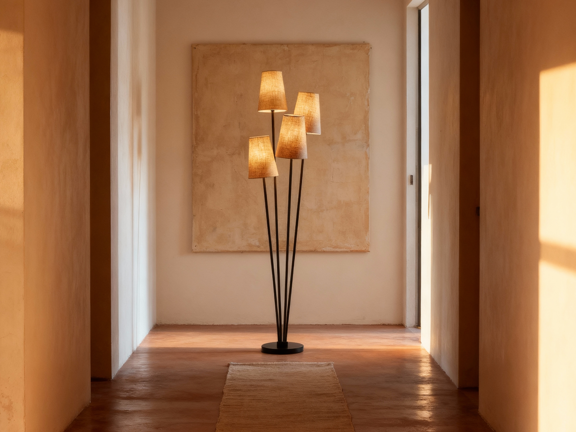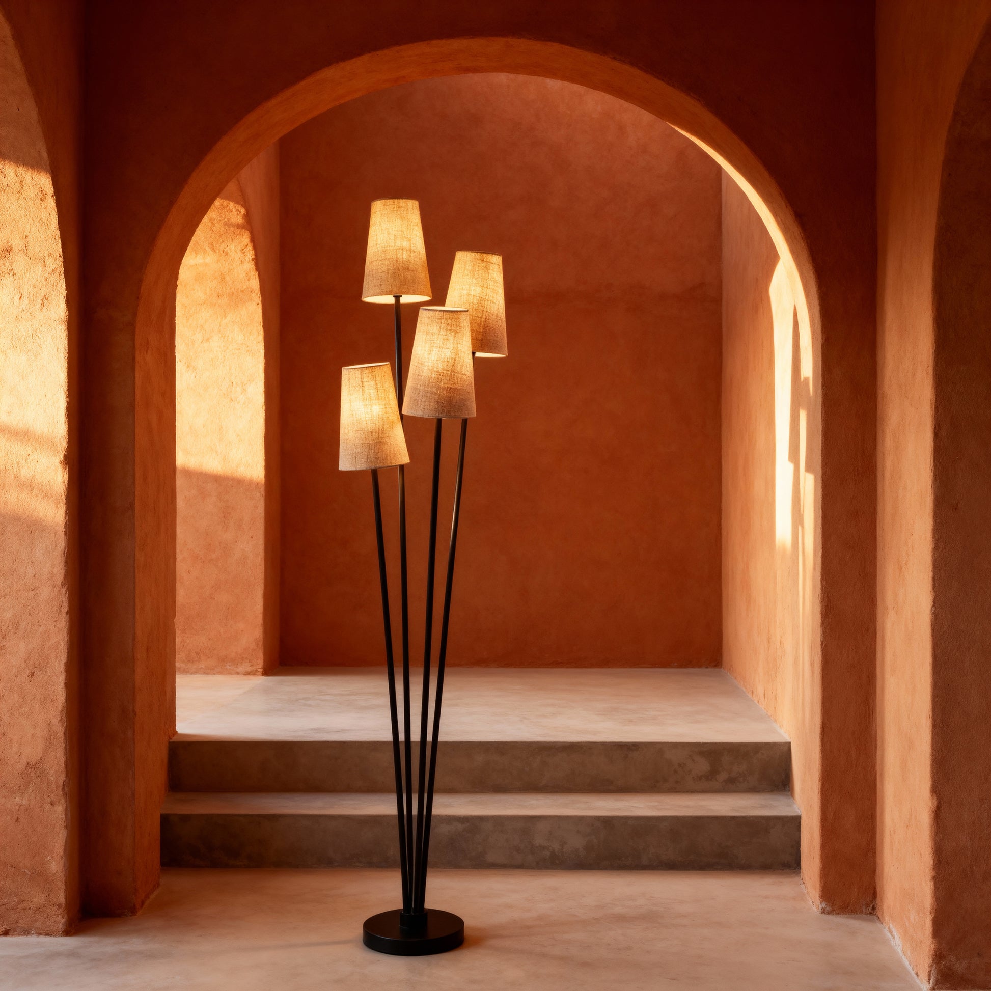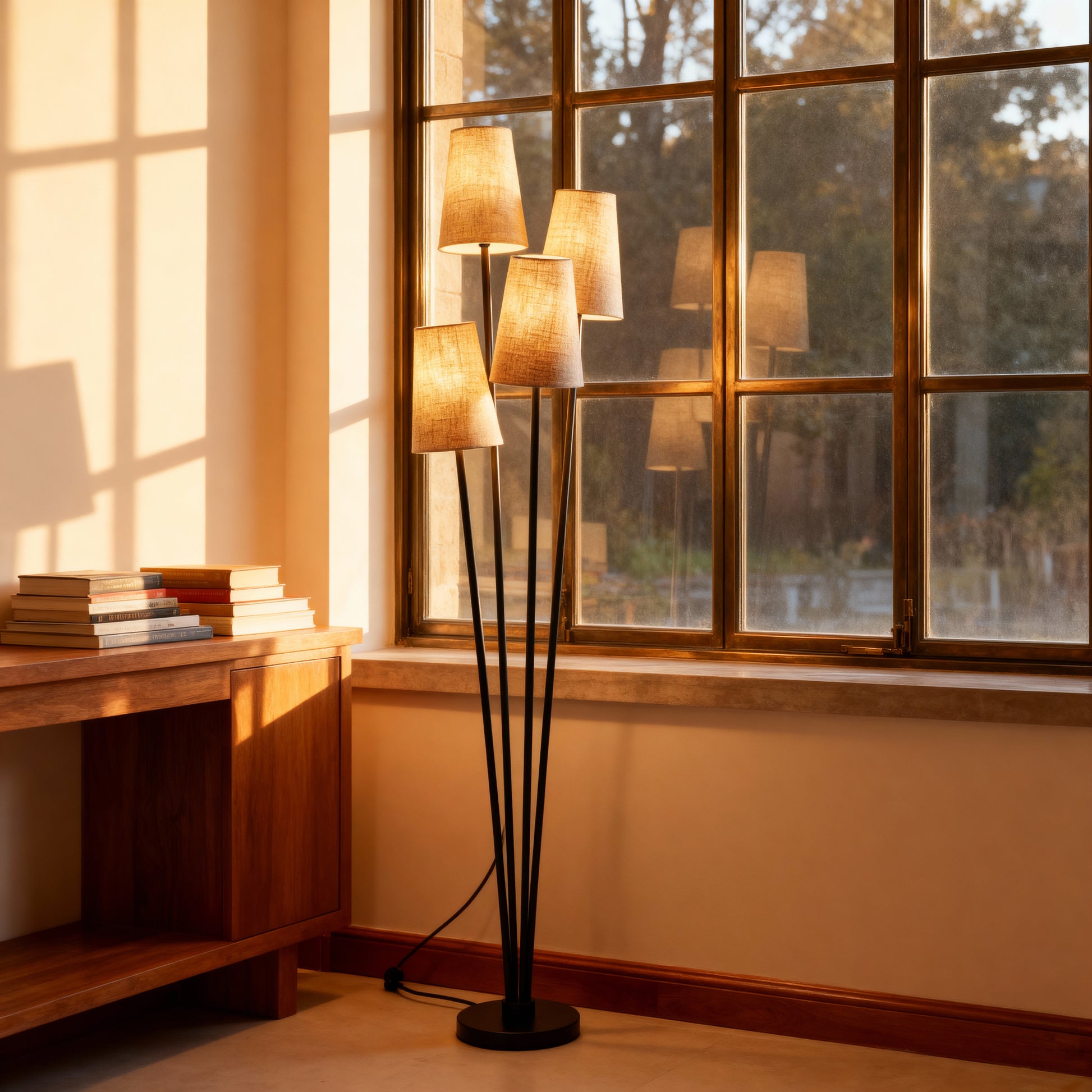 A clustered floor lamp with four tapered shades and slender stems for layered, ambient illumination.