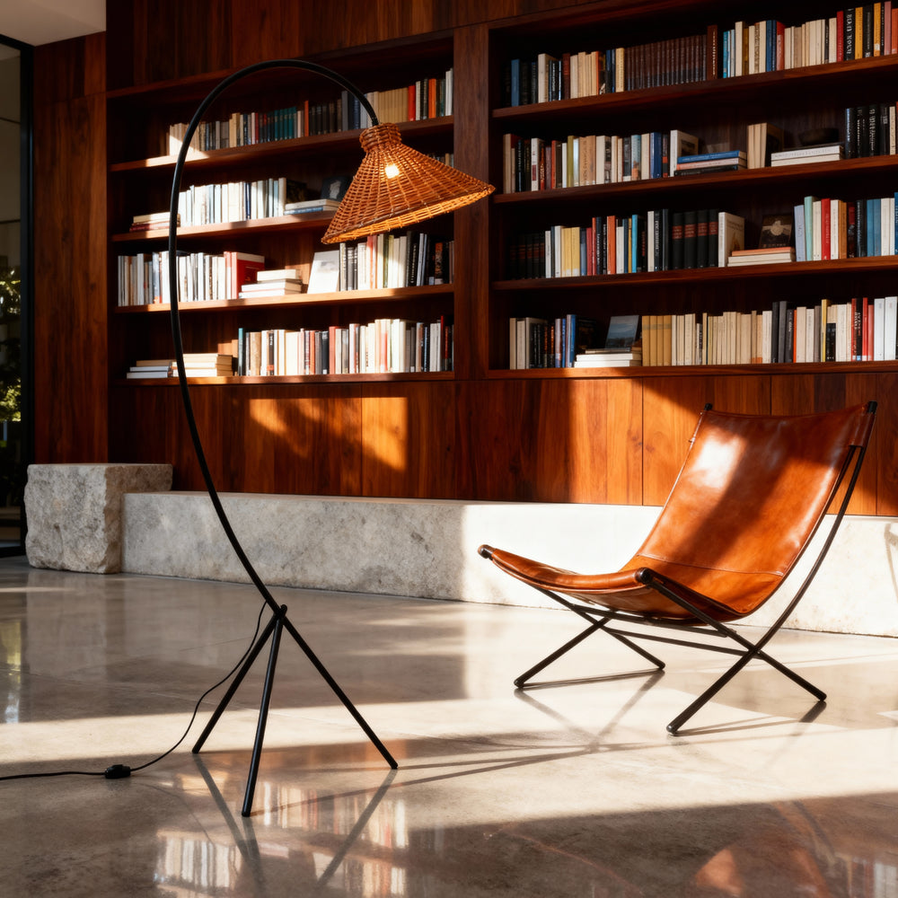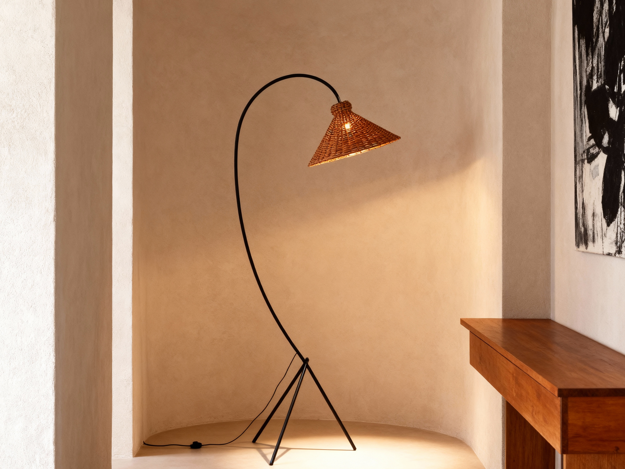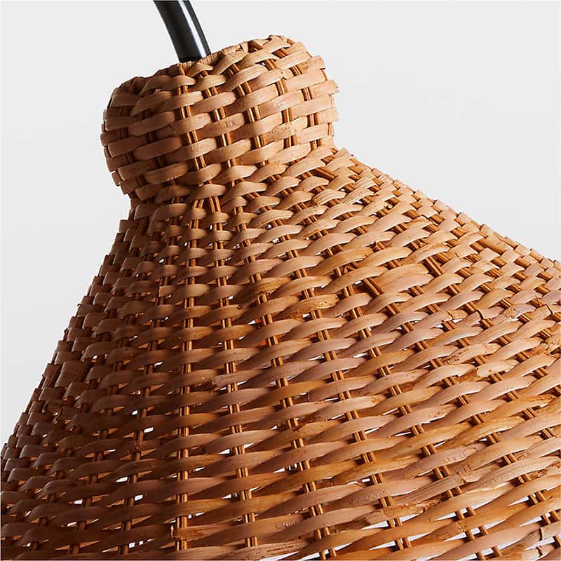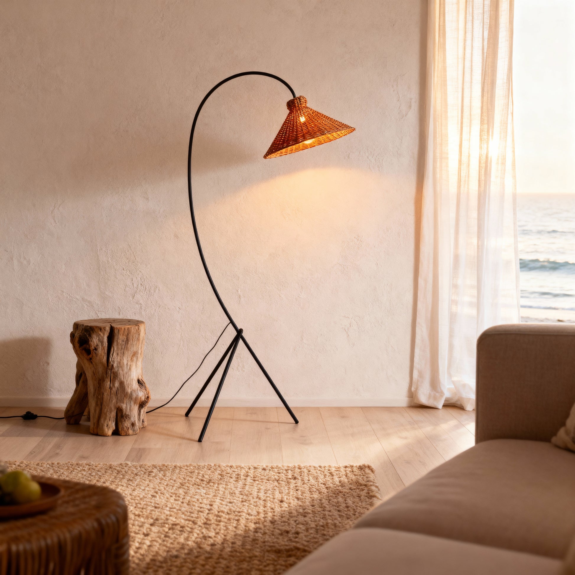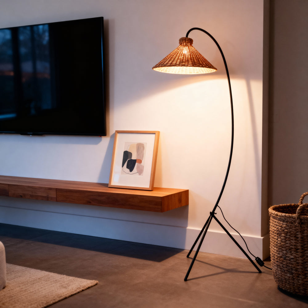 An arcing silhouette with a rattan cone shade delivers intimate, diffuse light for relaxed interiors.
