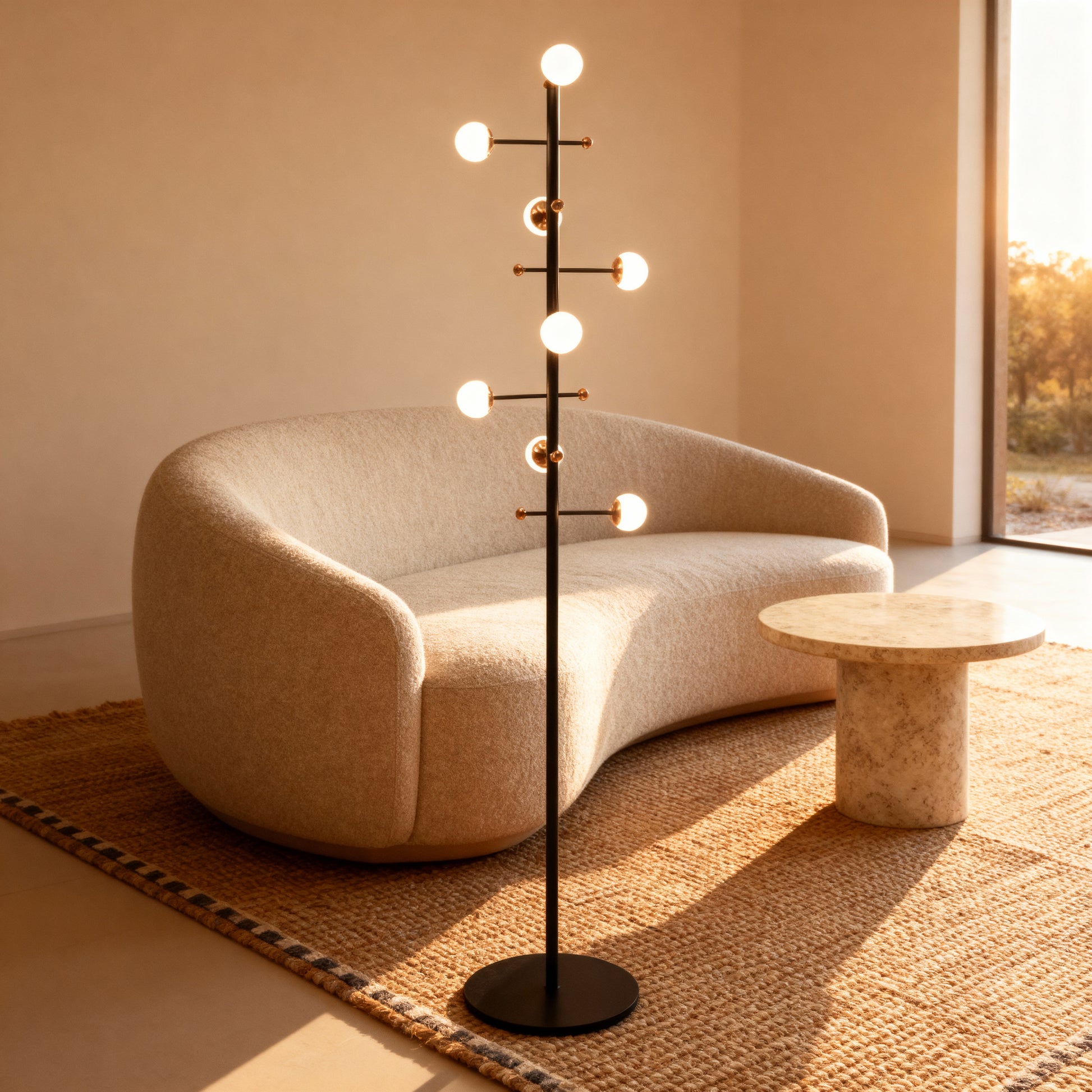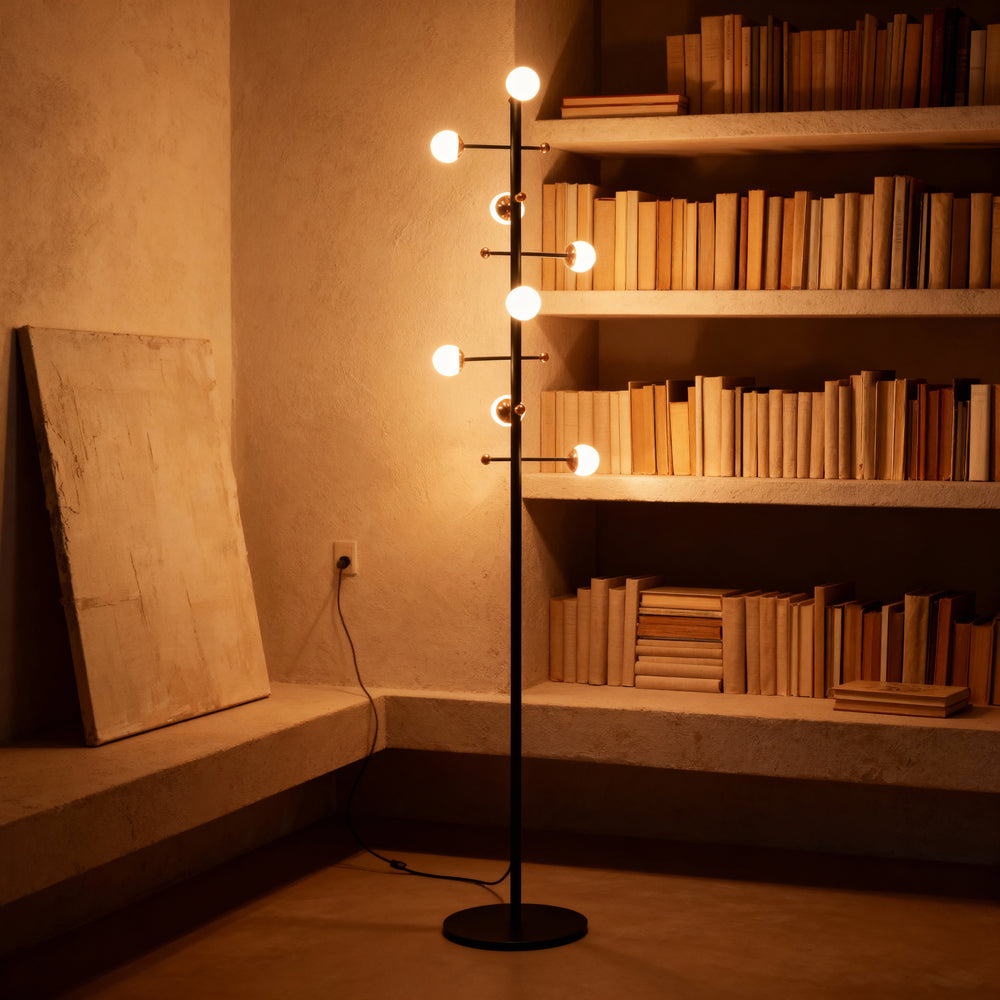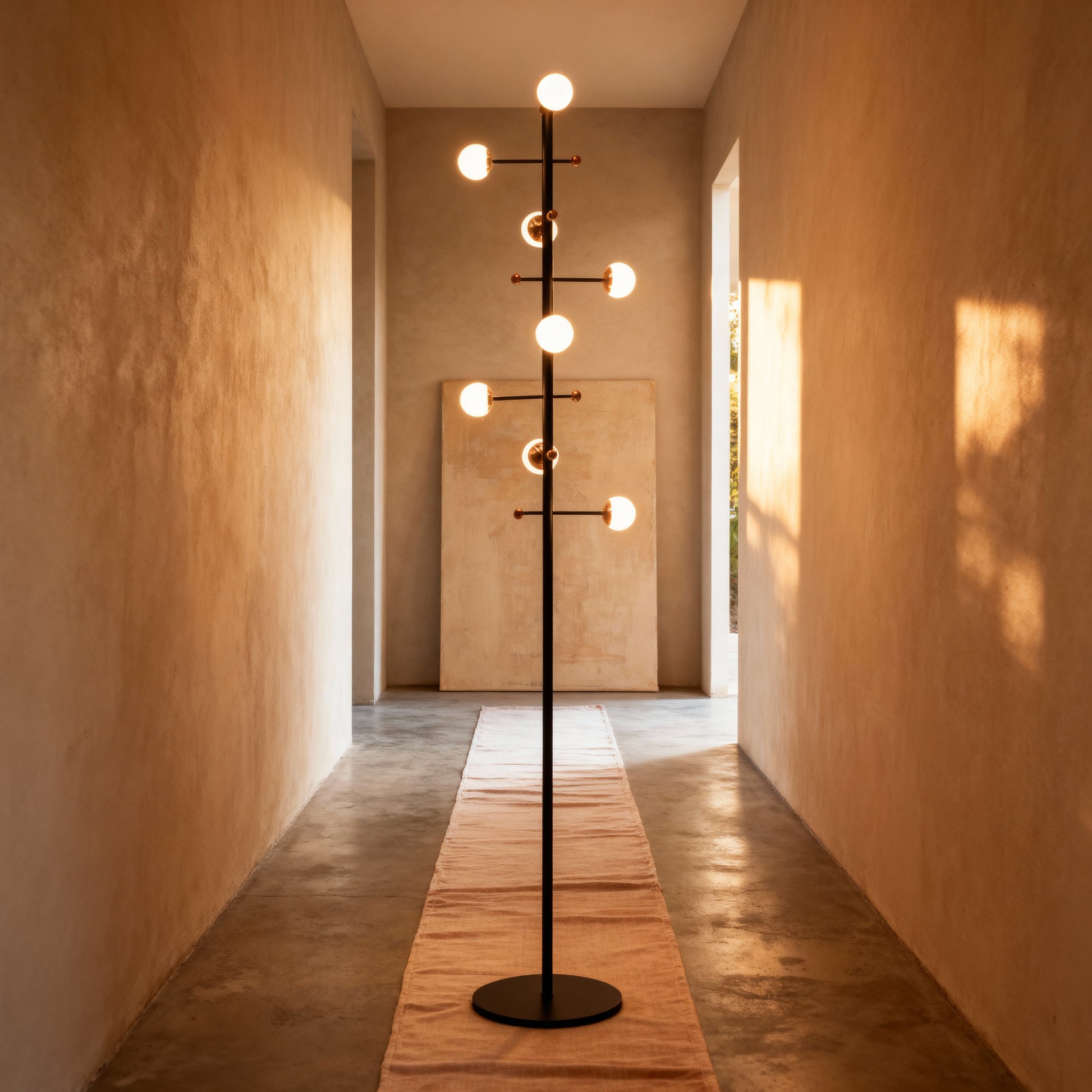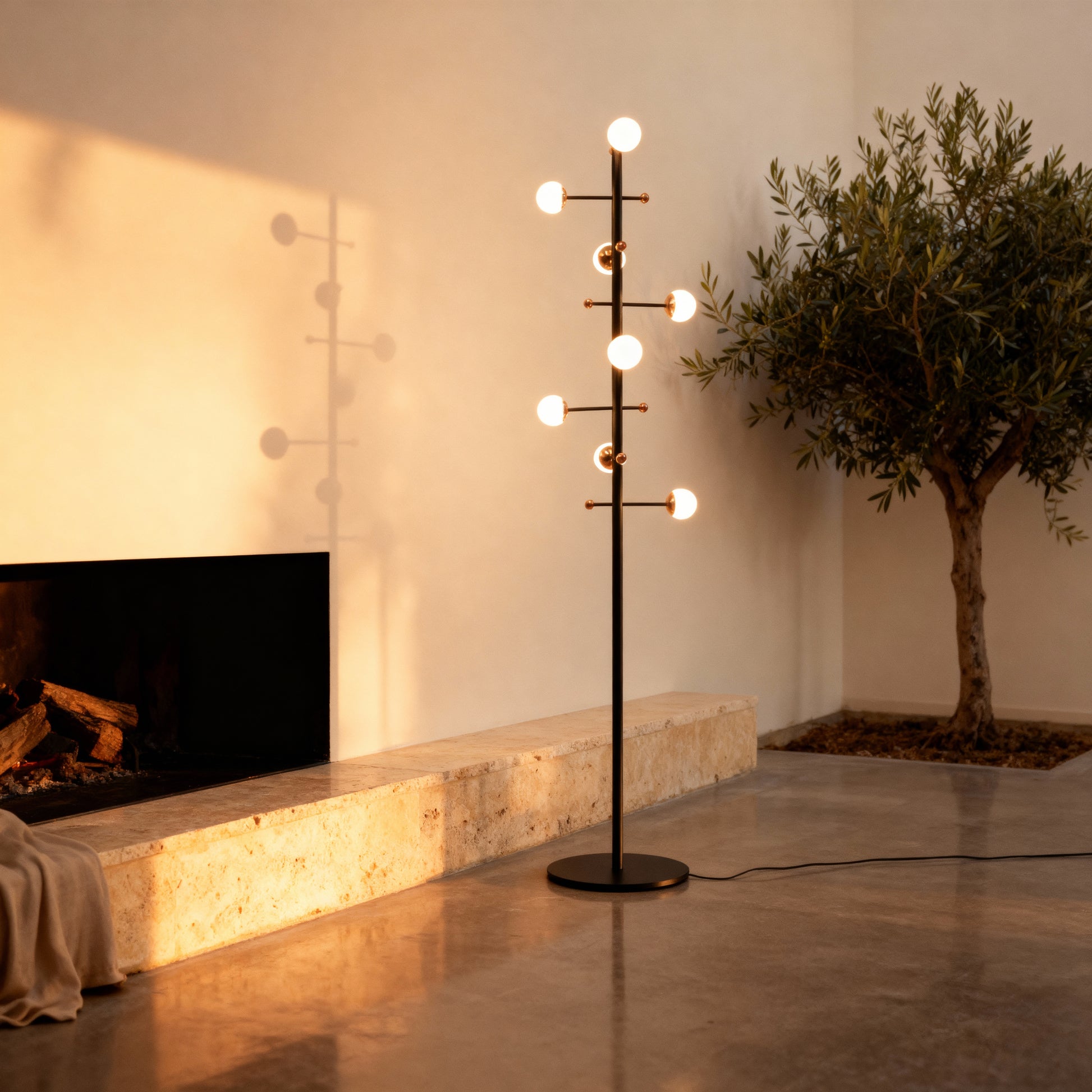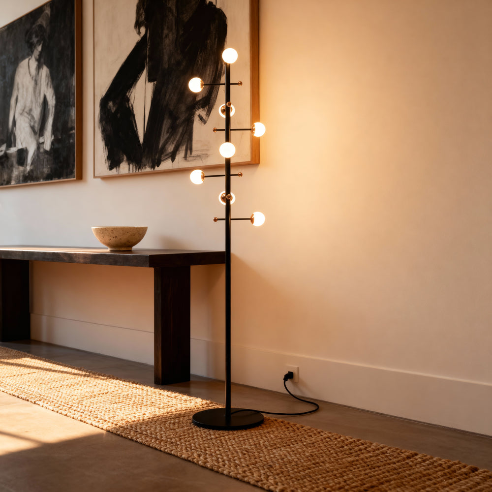 A vertical spine anchors short cross-arms tipped with glowing opal globes, producing a calm, even wash that flatters surrounding textures. Naya’s compact footprint and branching symmetry bring warmth and quiet drama without visual clutter, ideal beside a sofa, reading chair, or entry console.
