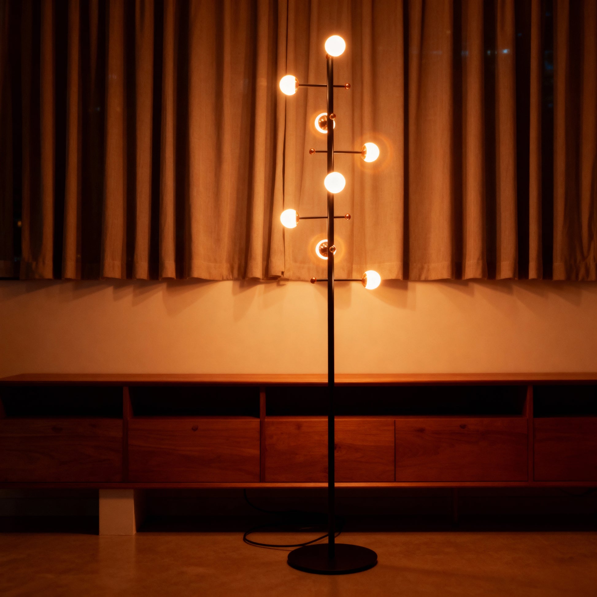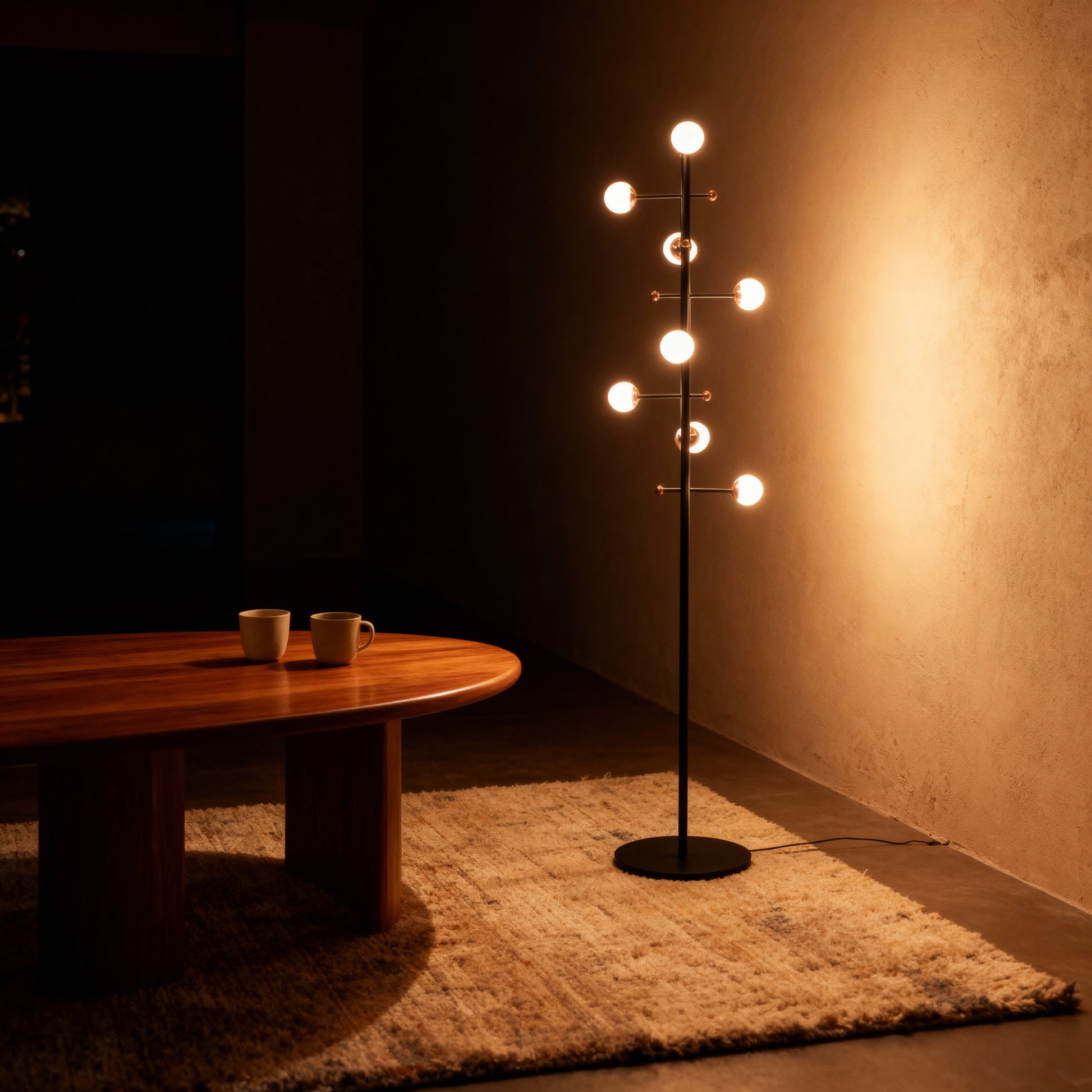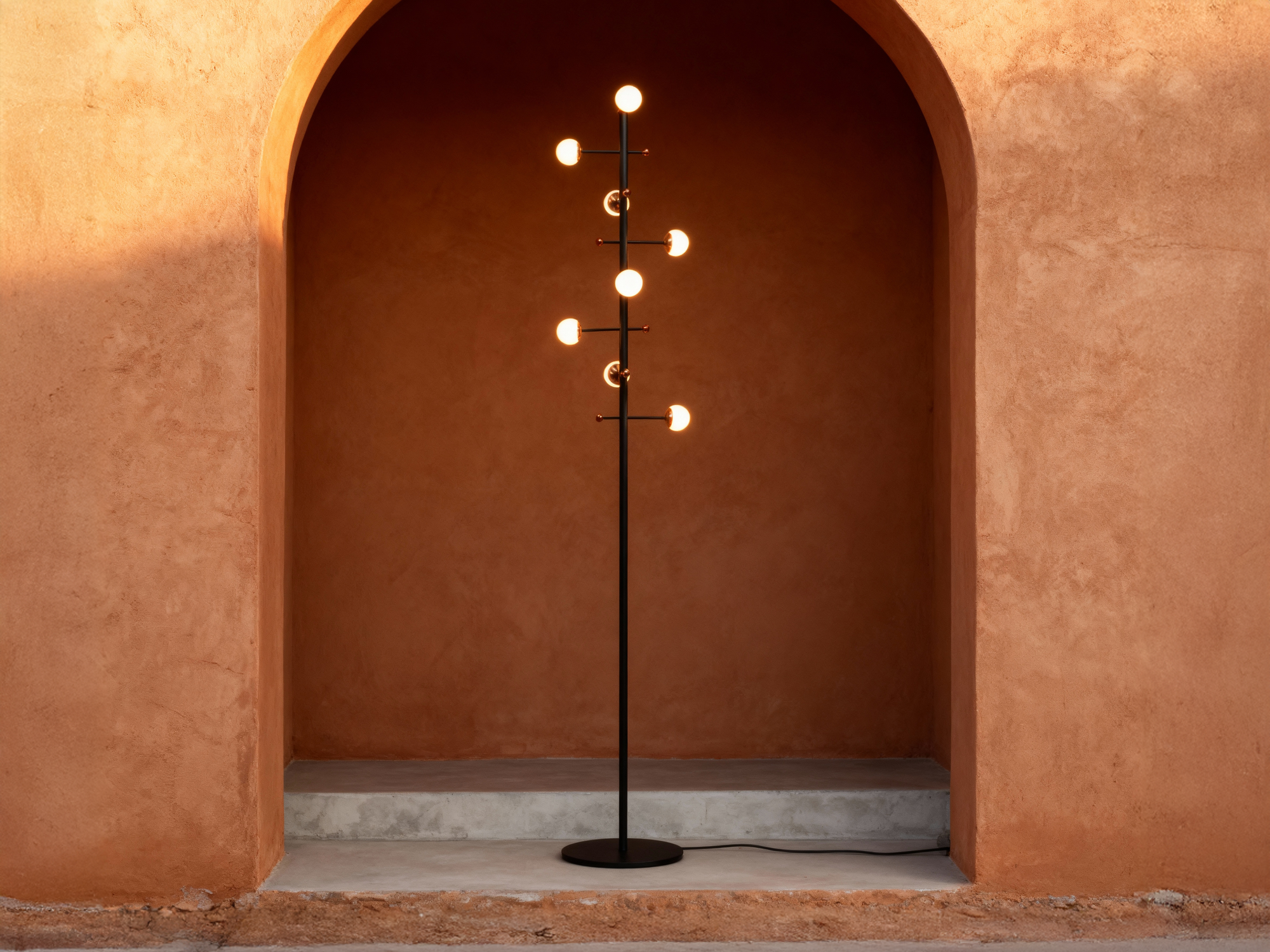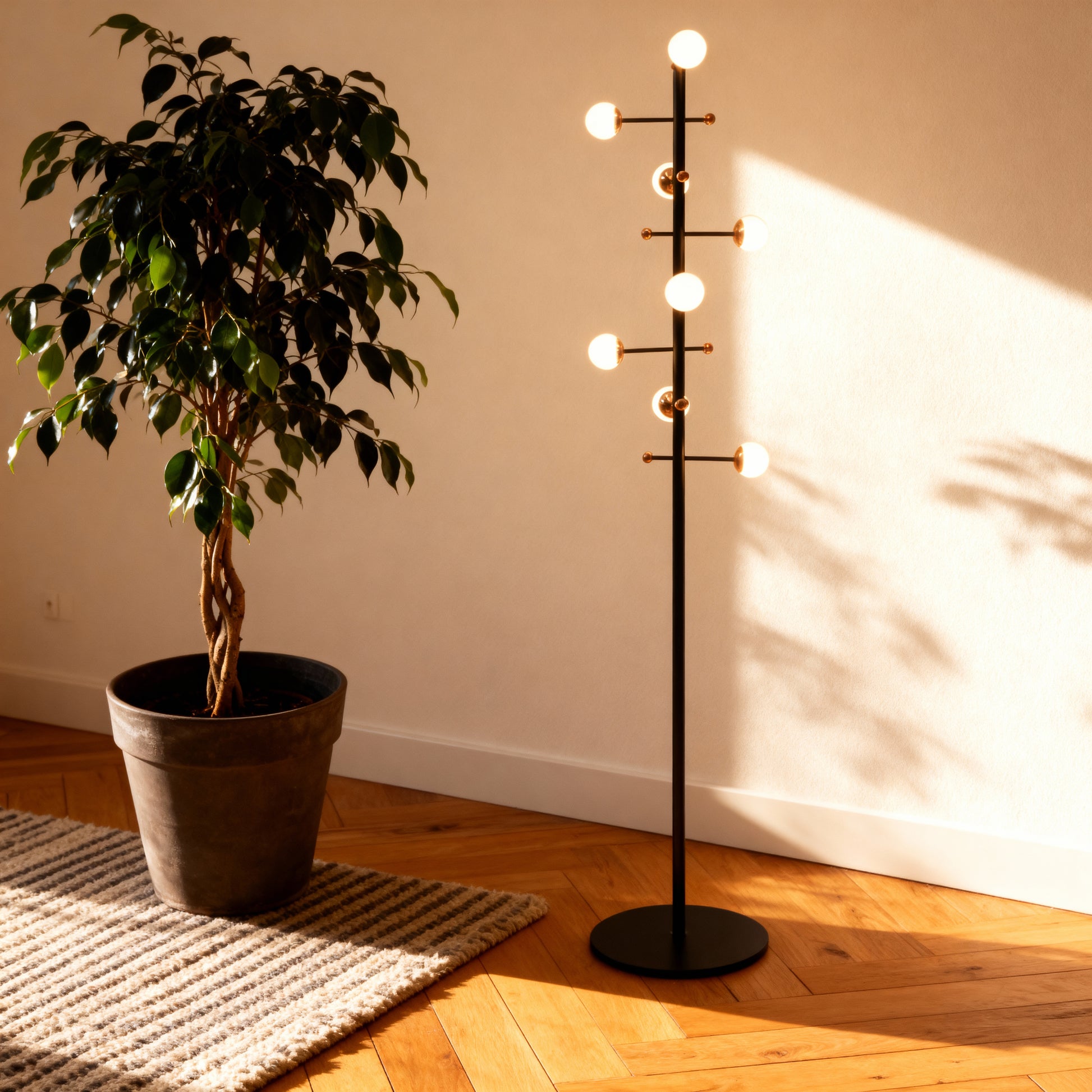 A vertical spine anchors short cross-arms tipped with glowing opal globes, producing a calm, even wash that flatters surrounding textures. Naya’s compact footprint and branching symmetry bring warmth and quiet drama without visual clutter, ideal beside a sofa, reading chair, or entry console.