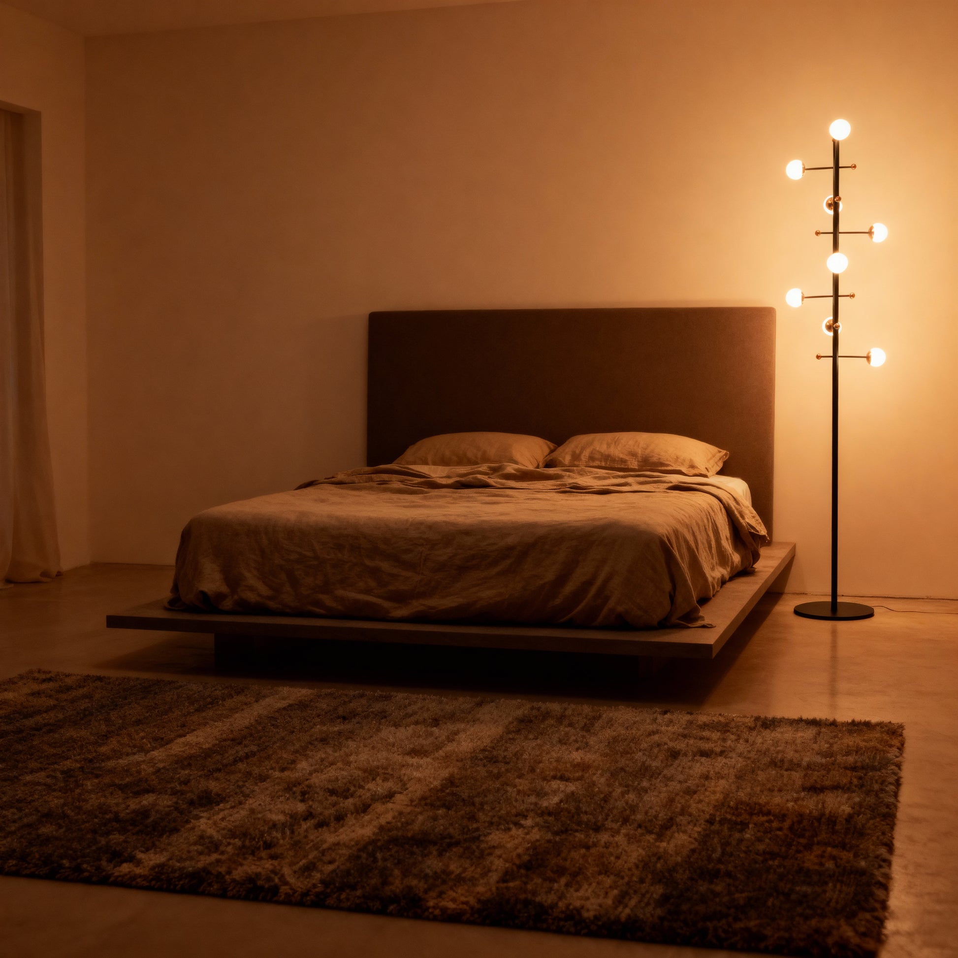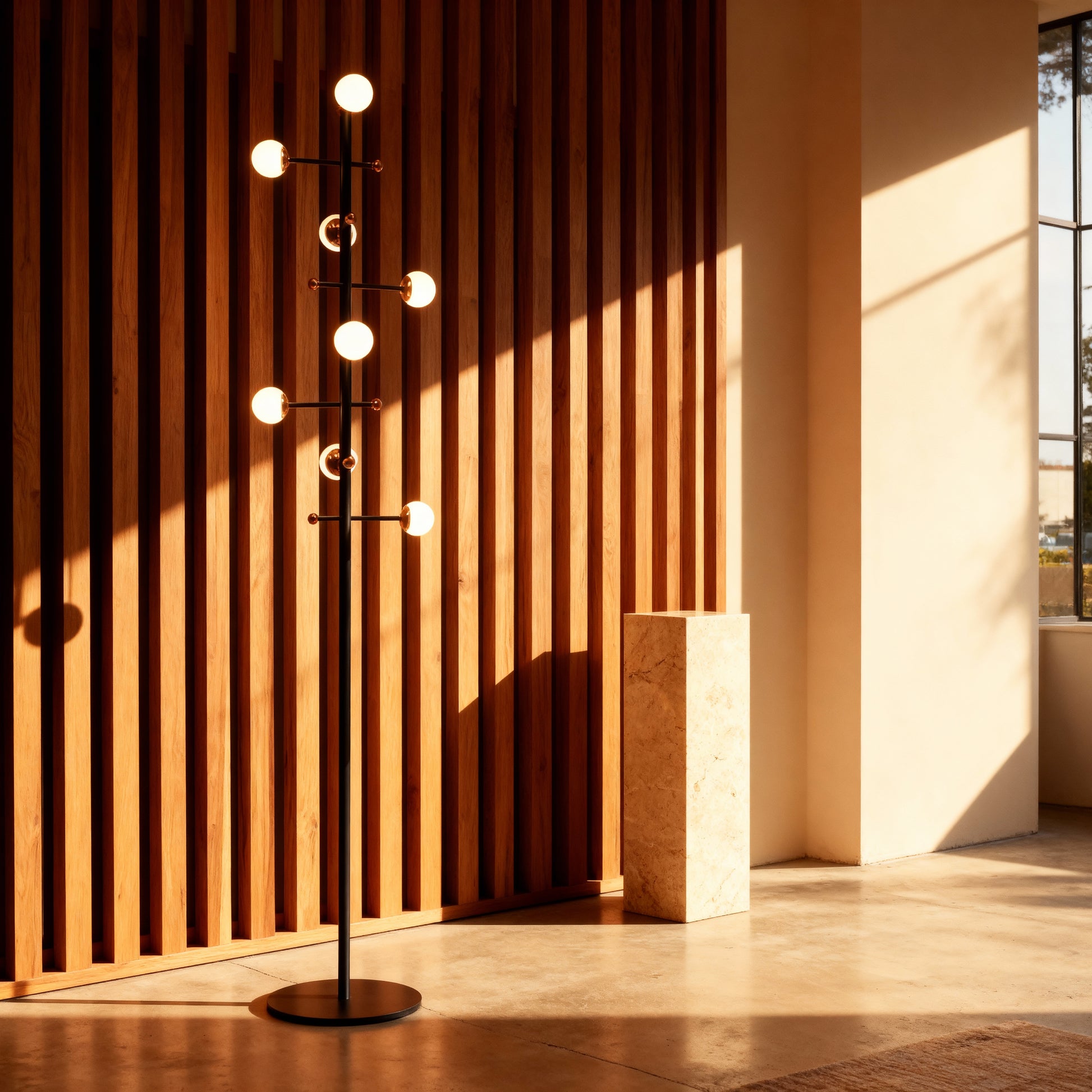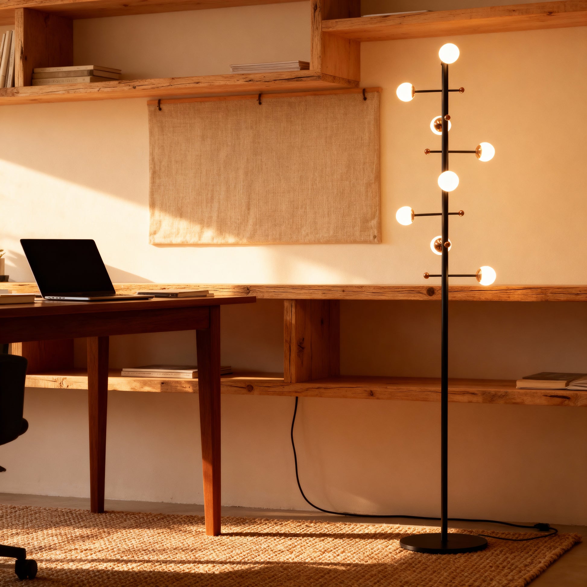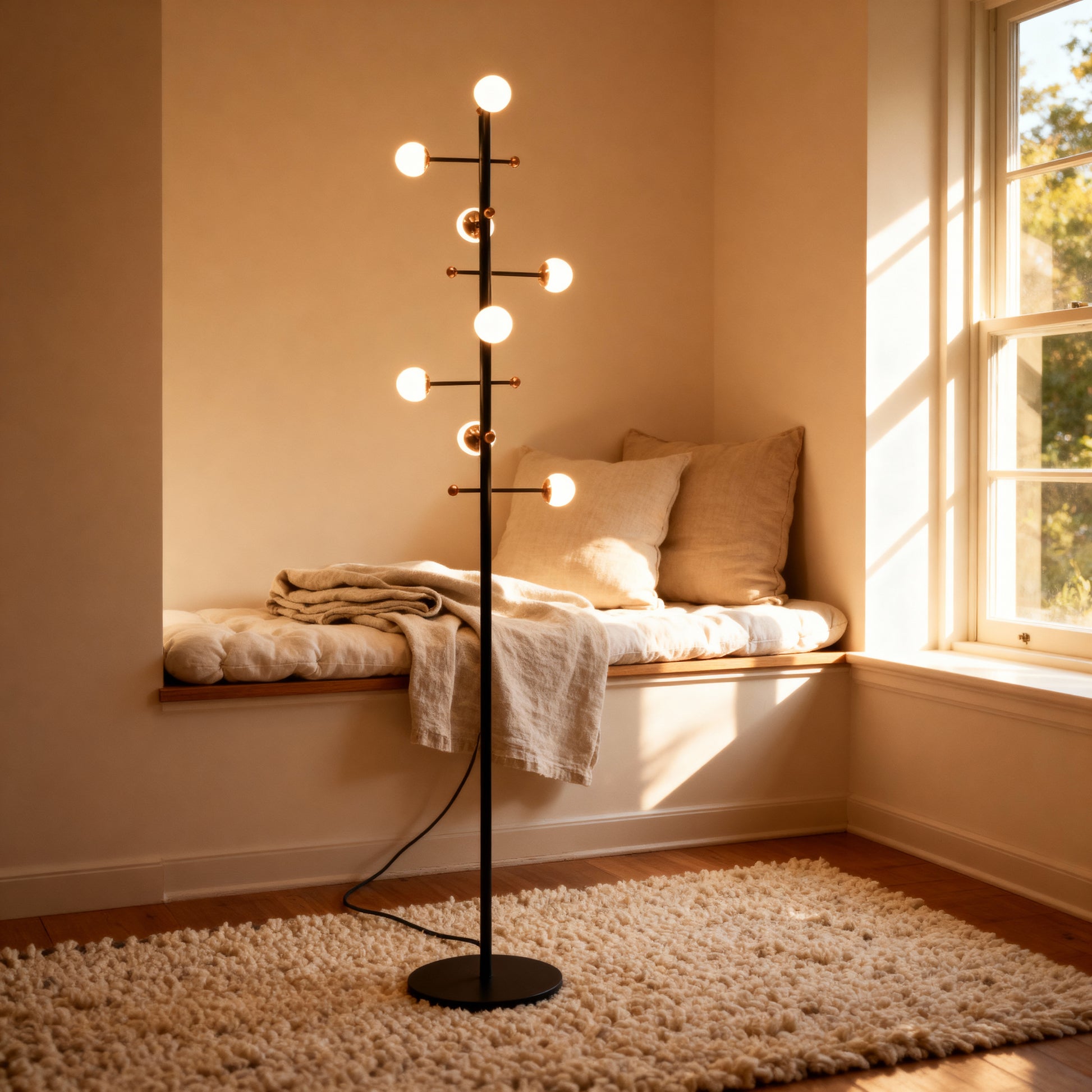 A vertical spine anchors short cross-arms tipped with glowing opal globes, producing a calm, even wash that flatters surrounding textures. Naya’s compact footprint and branching symmetry bring warmth and quiet drama without visual clutter, ideal beside a sofa, reading chair, or entry console.
