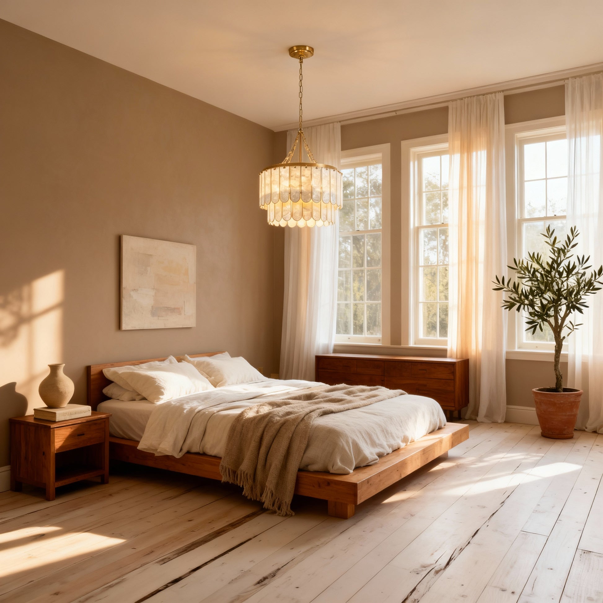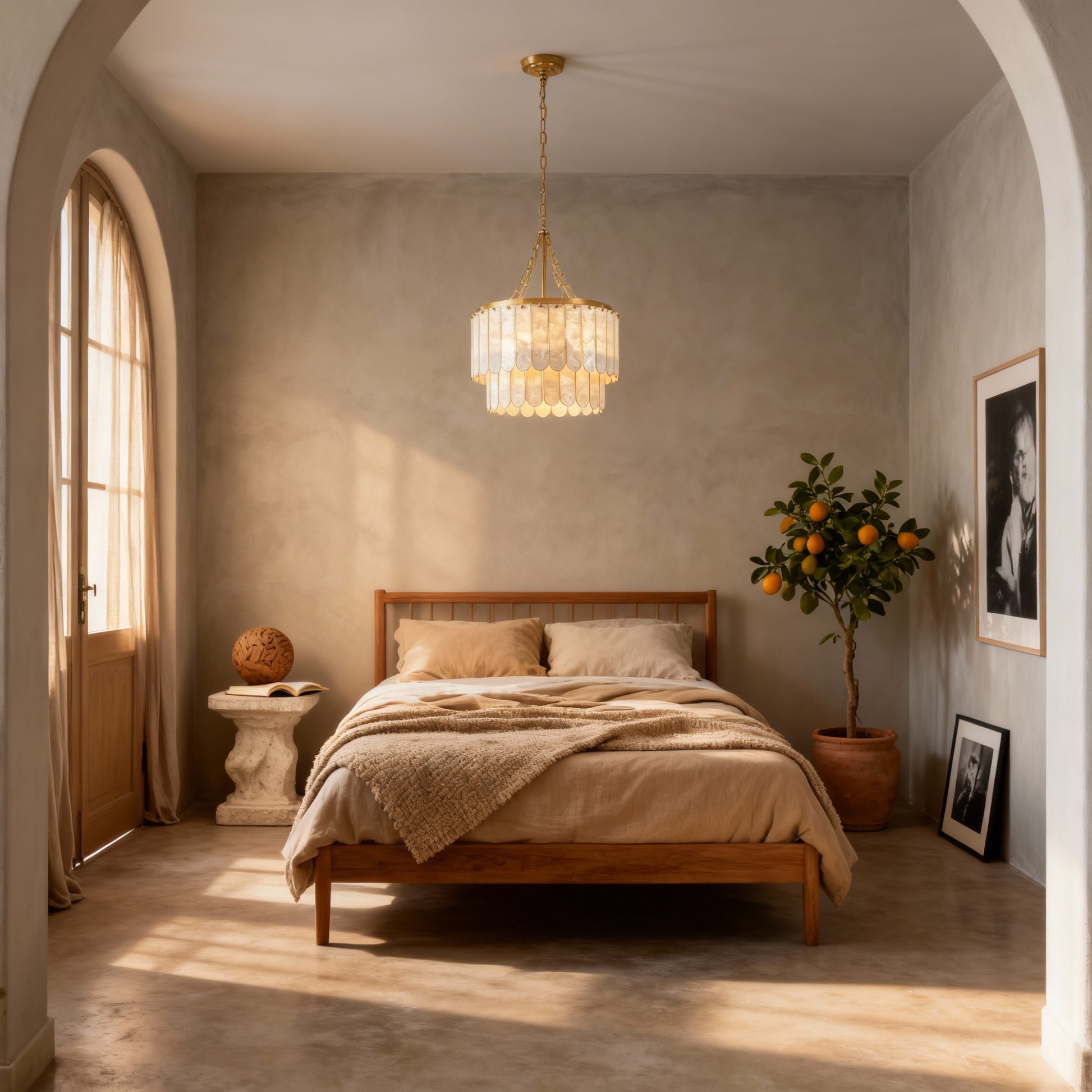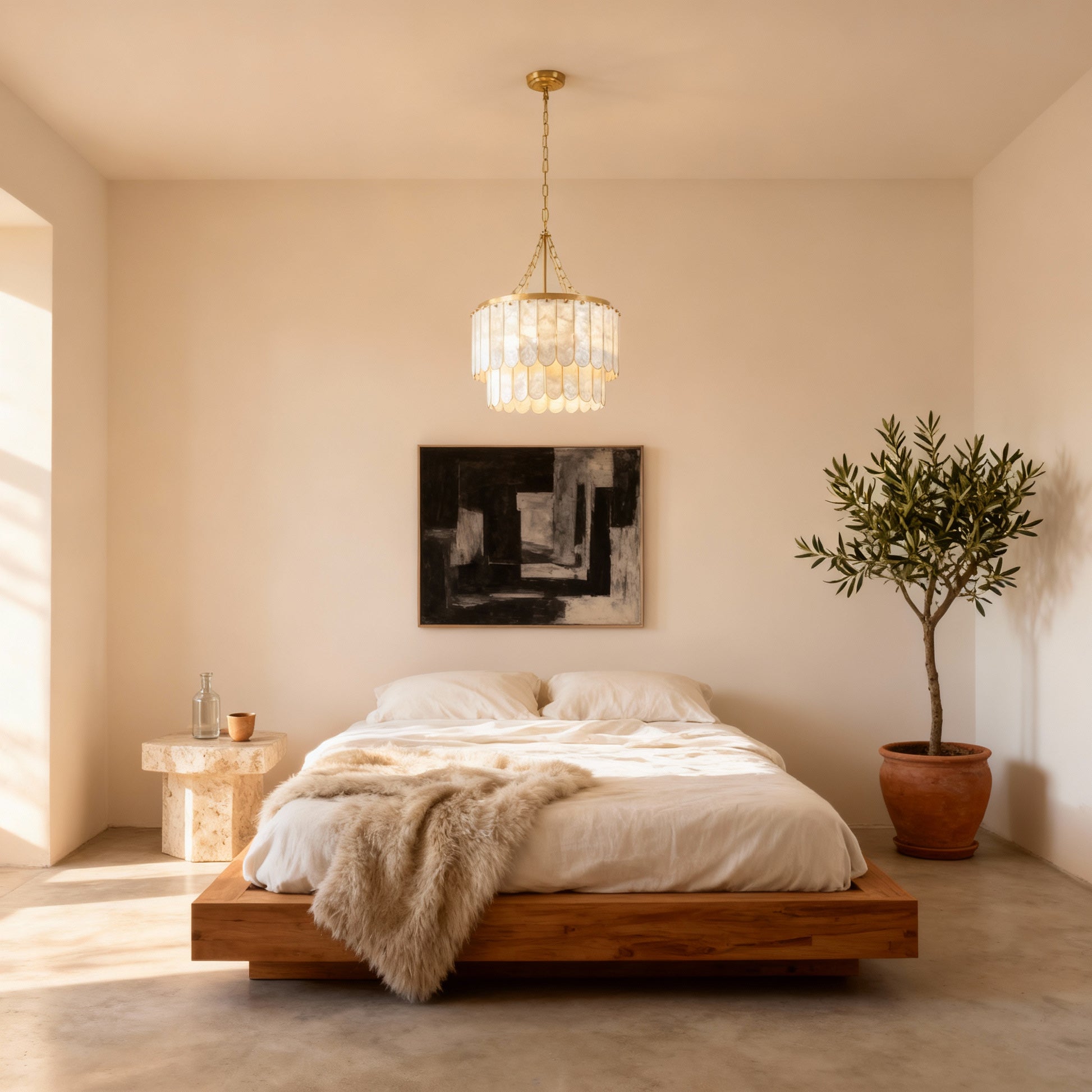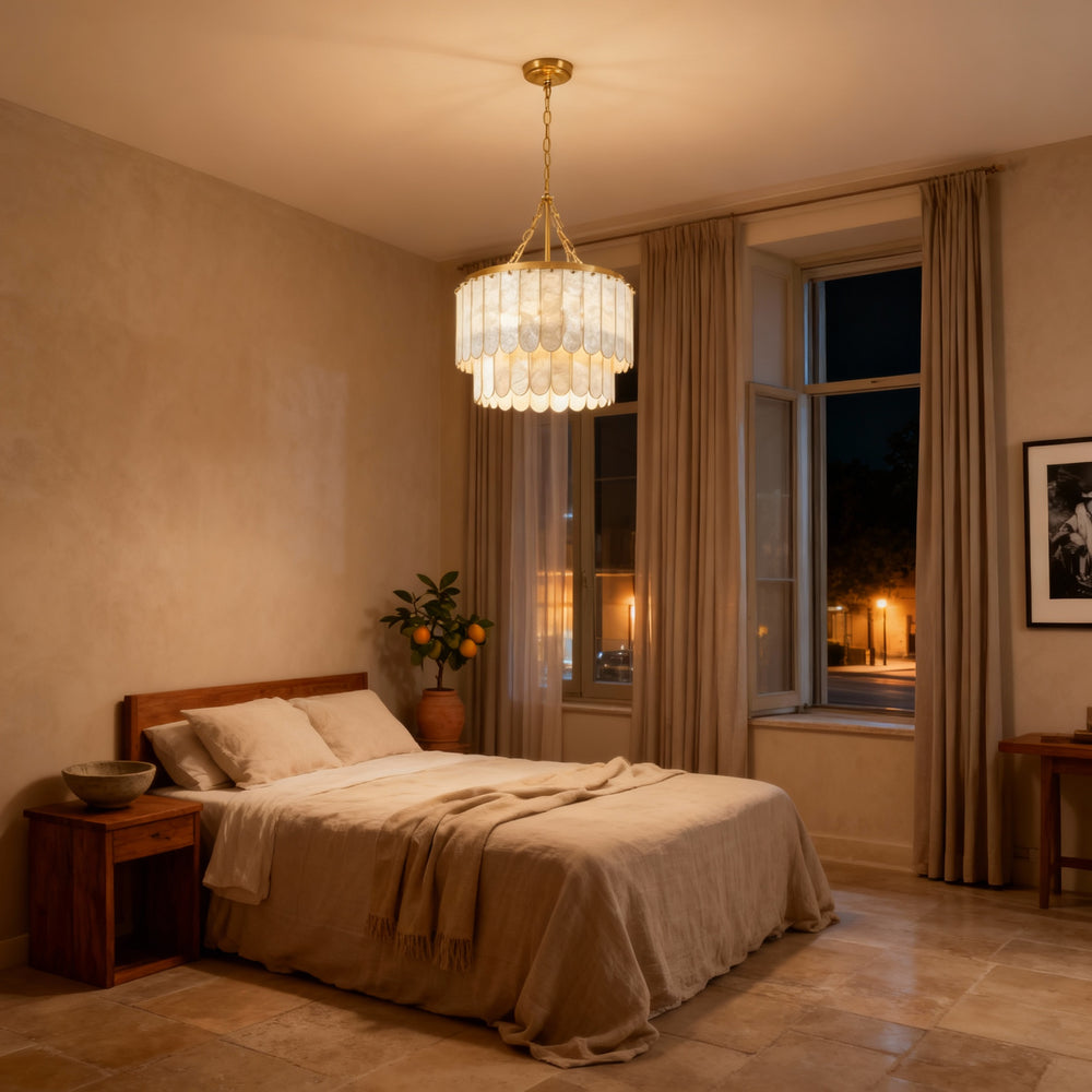 Nyra’s layered capiz panels diffuse light with natural softness, creating a warm, floating presence that enhances modern living and dining areas. Its metal frame provides clean structure while the translucent shell textures bring depth and a subtle handcrafted character to the space.