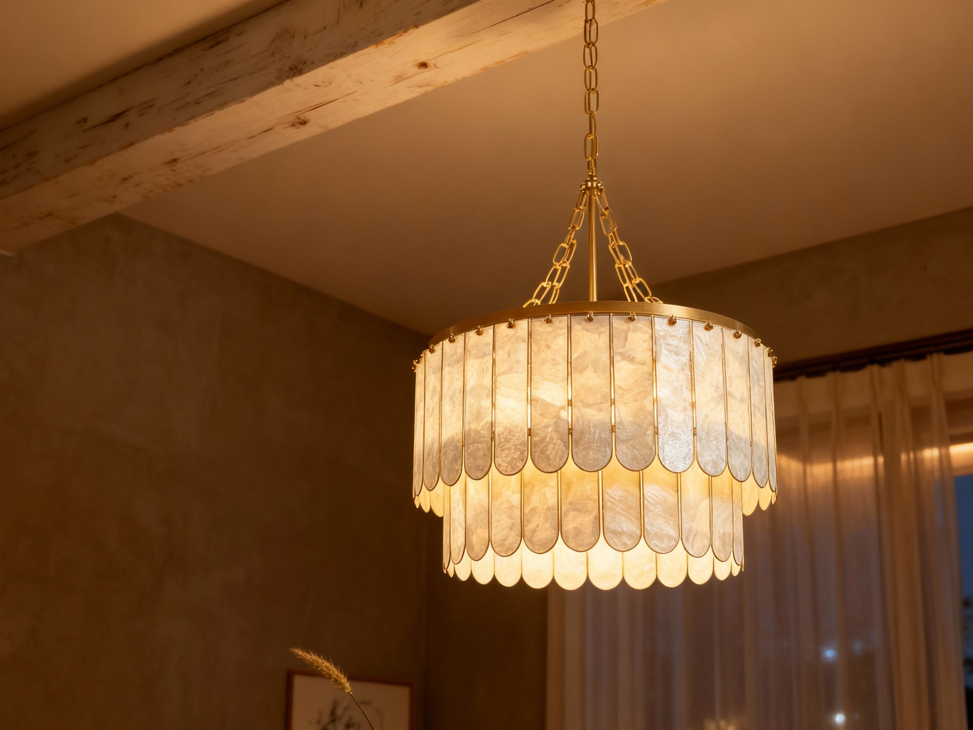 A refined capiz silhouette that casts a soft, atmospheric glow for warm and elevated interiors.