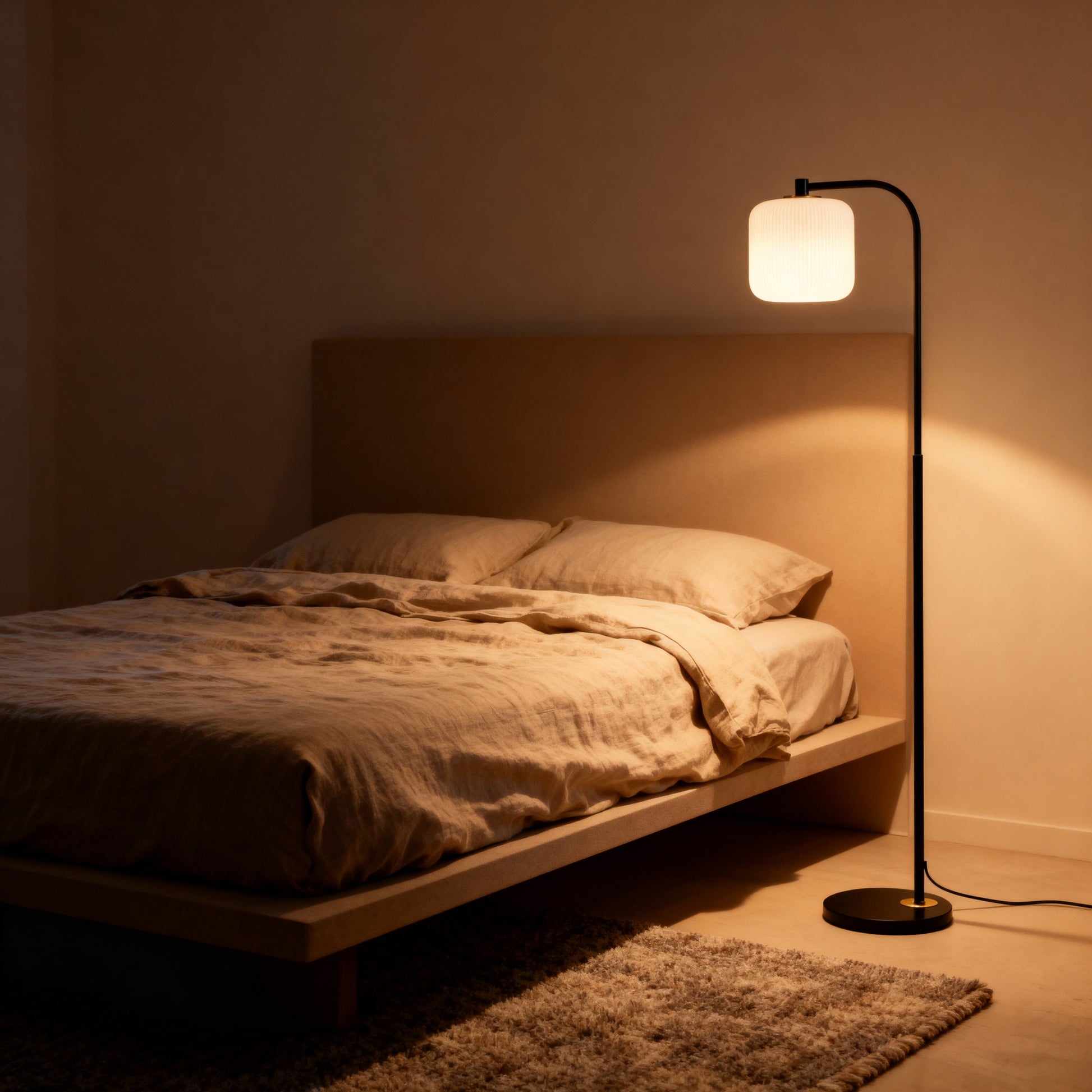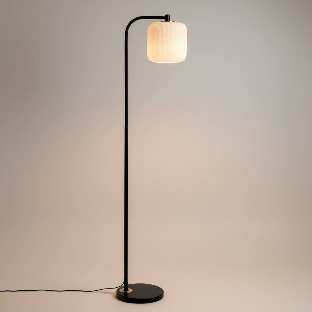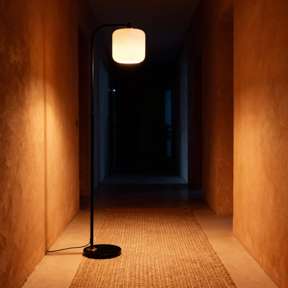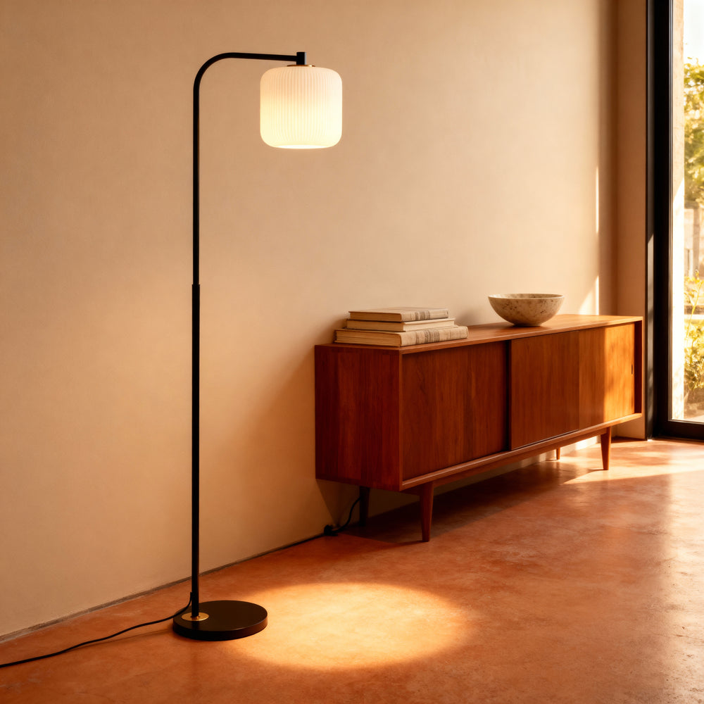 A slender arc and pleated shade bring warm, understated character to sofas, chairs, and bedsides.