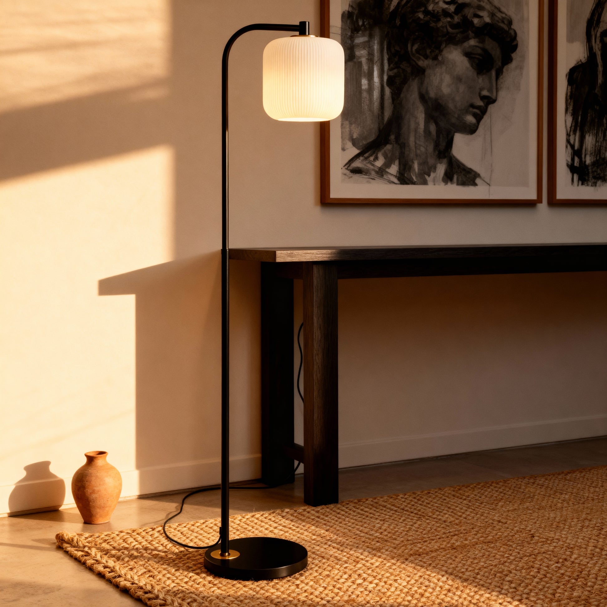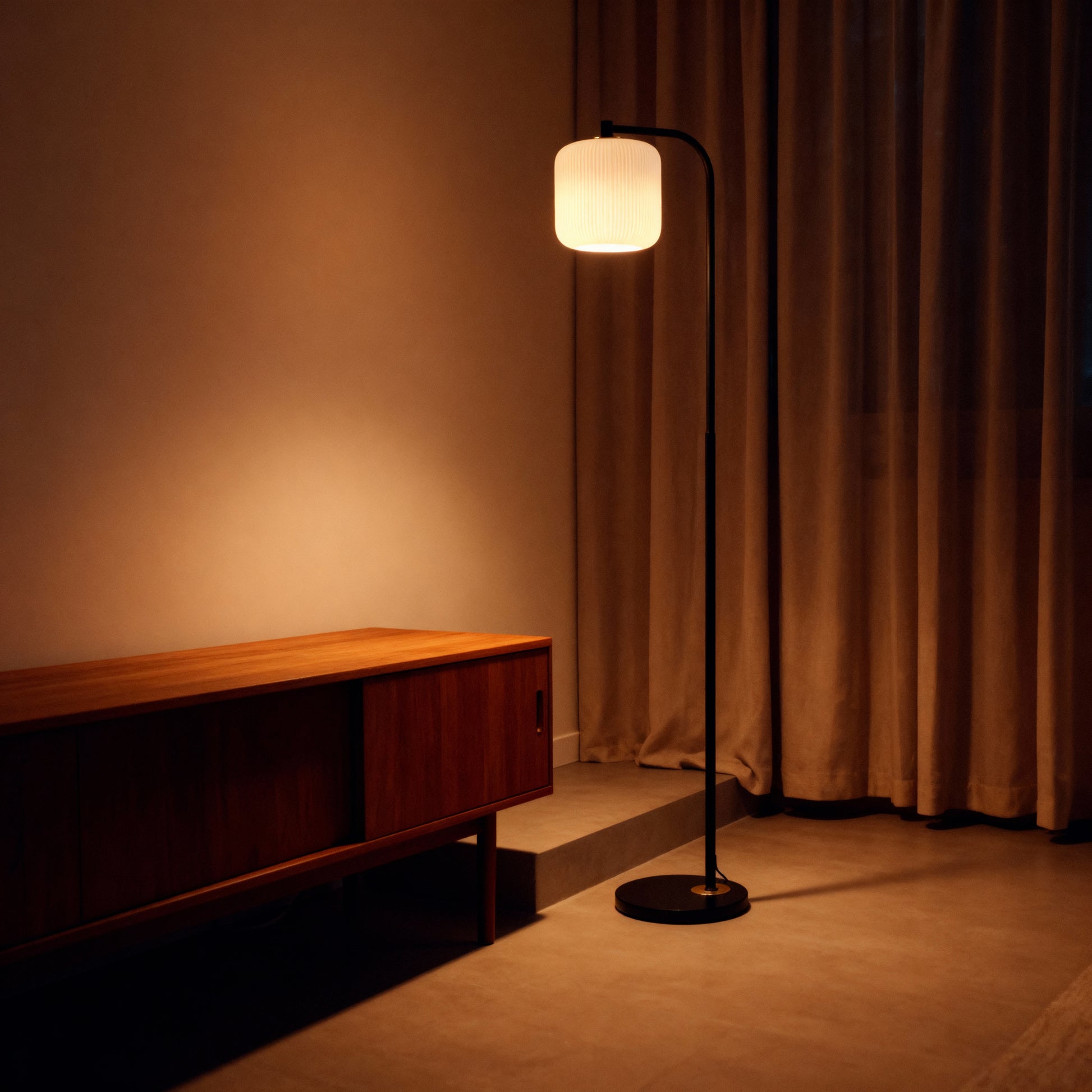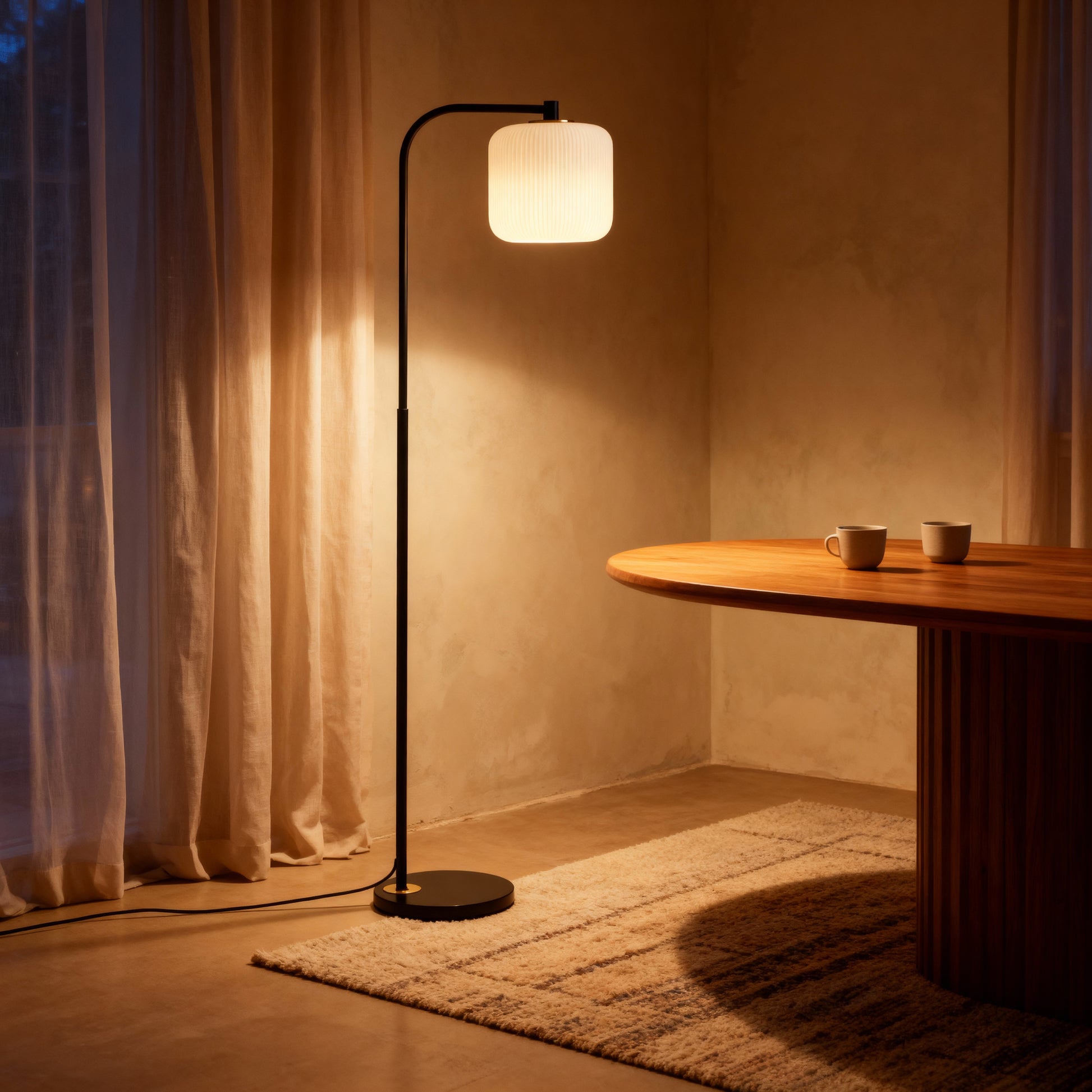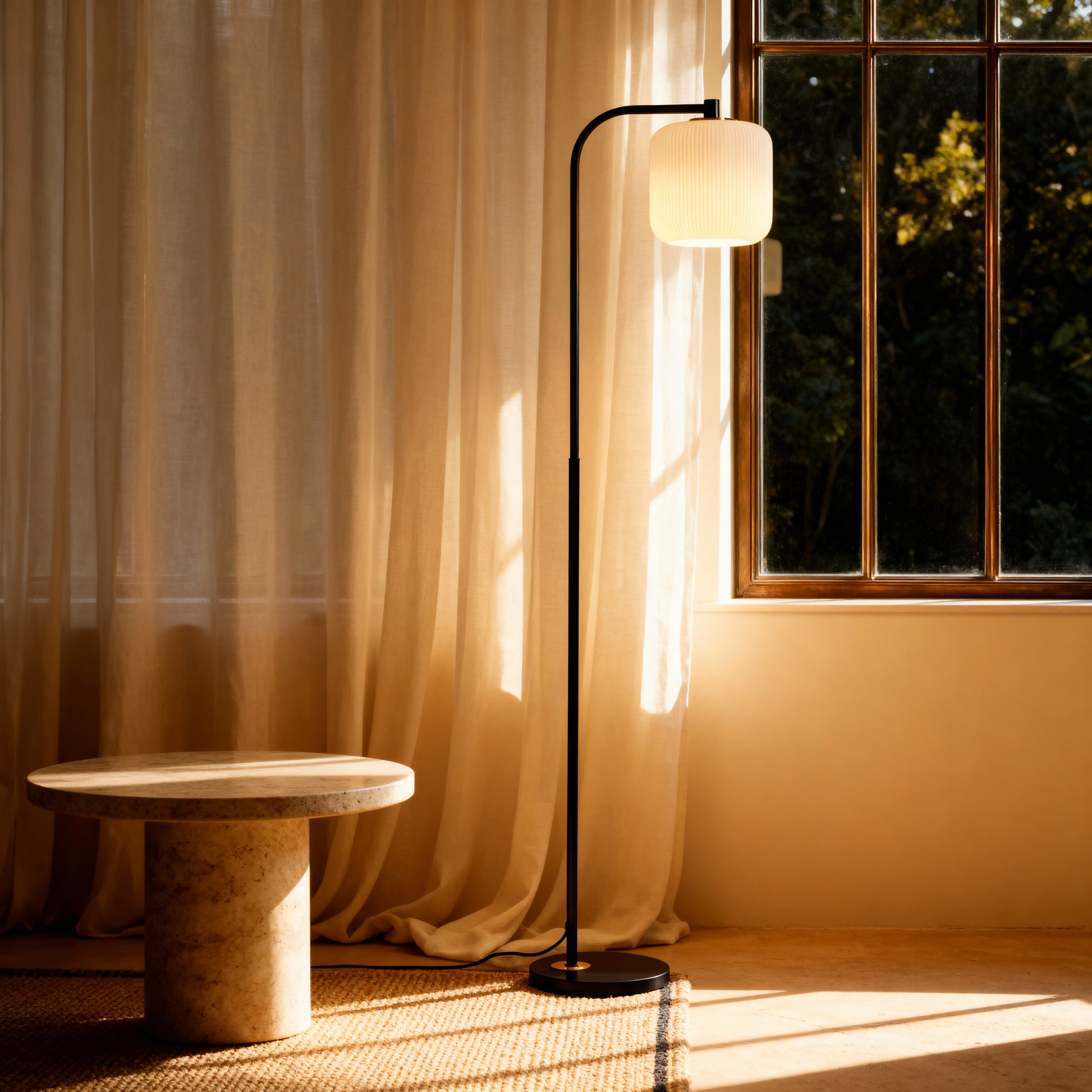 A slender arc and pleated shade bring warm, understated character to sofas, chairs, and bedsides.