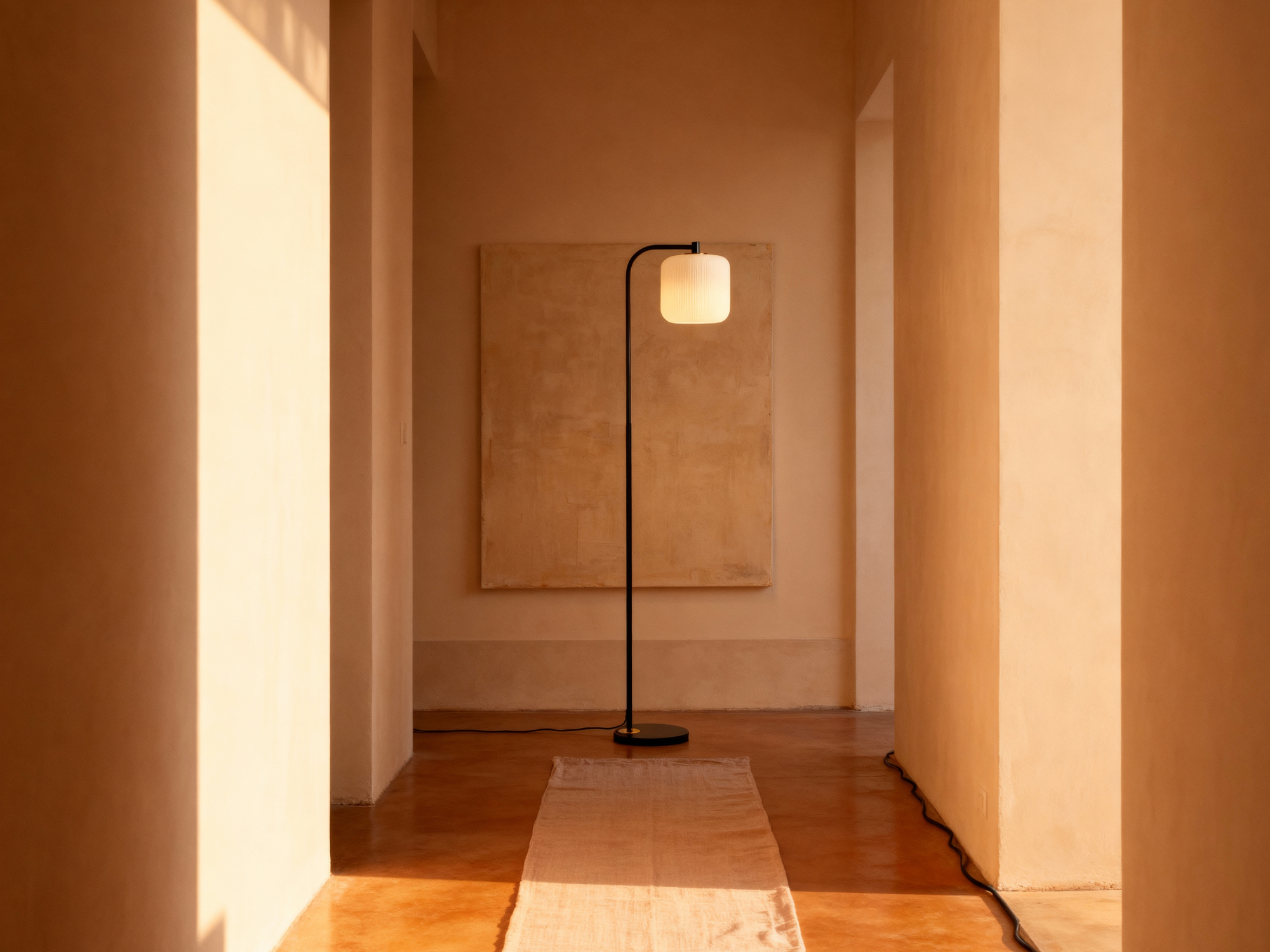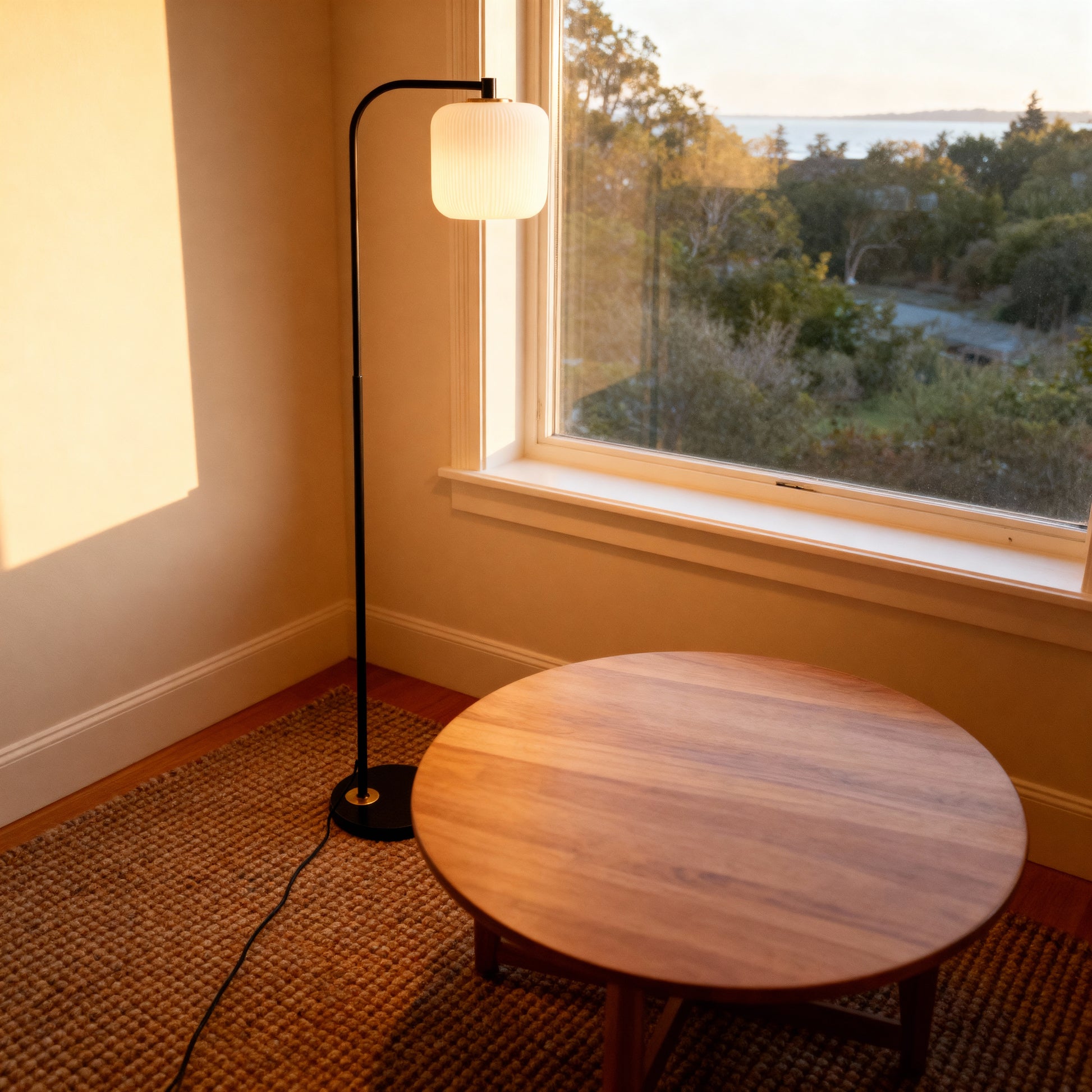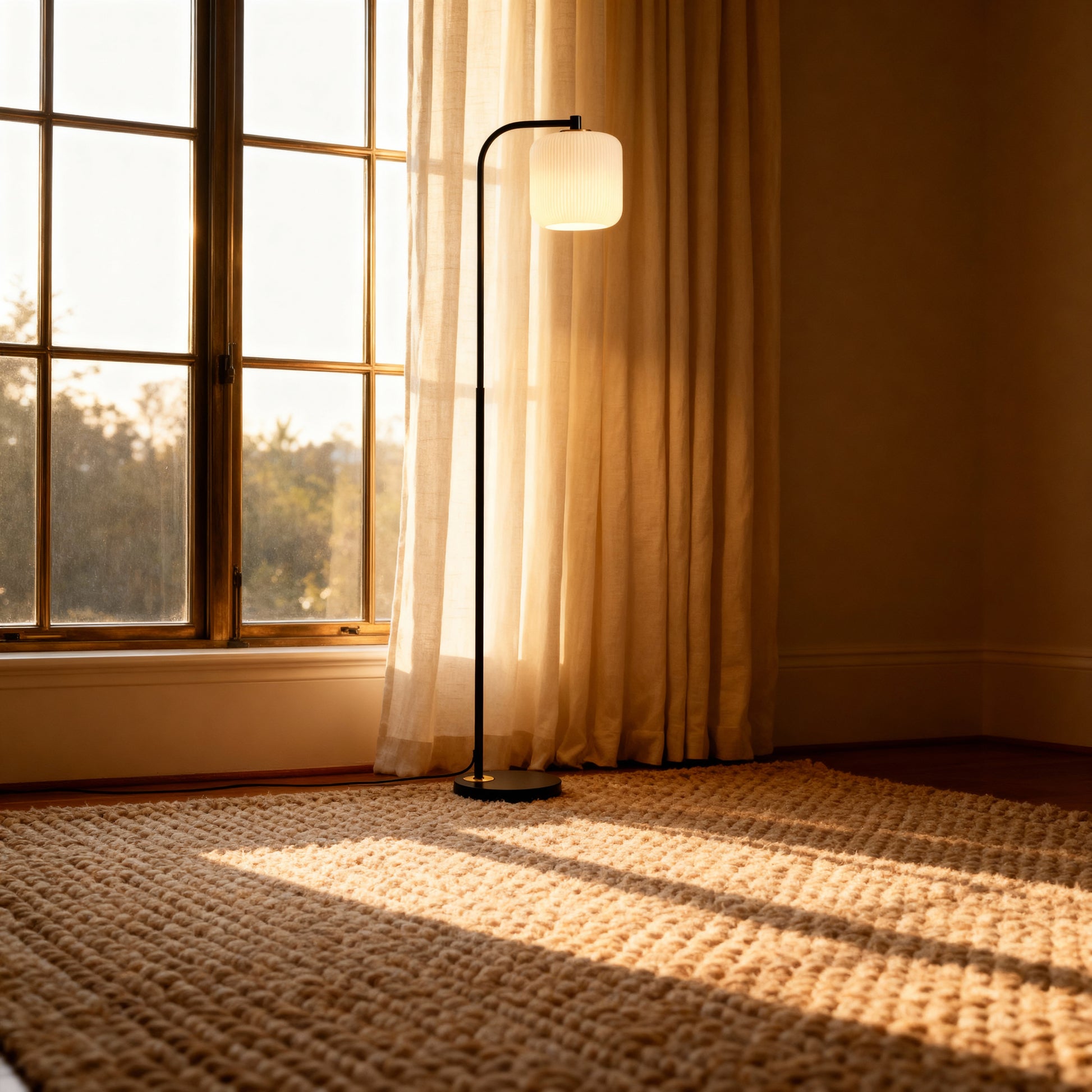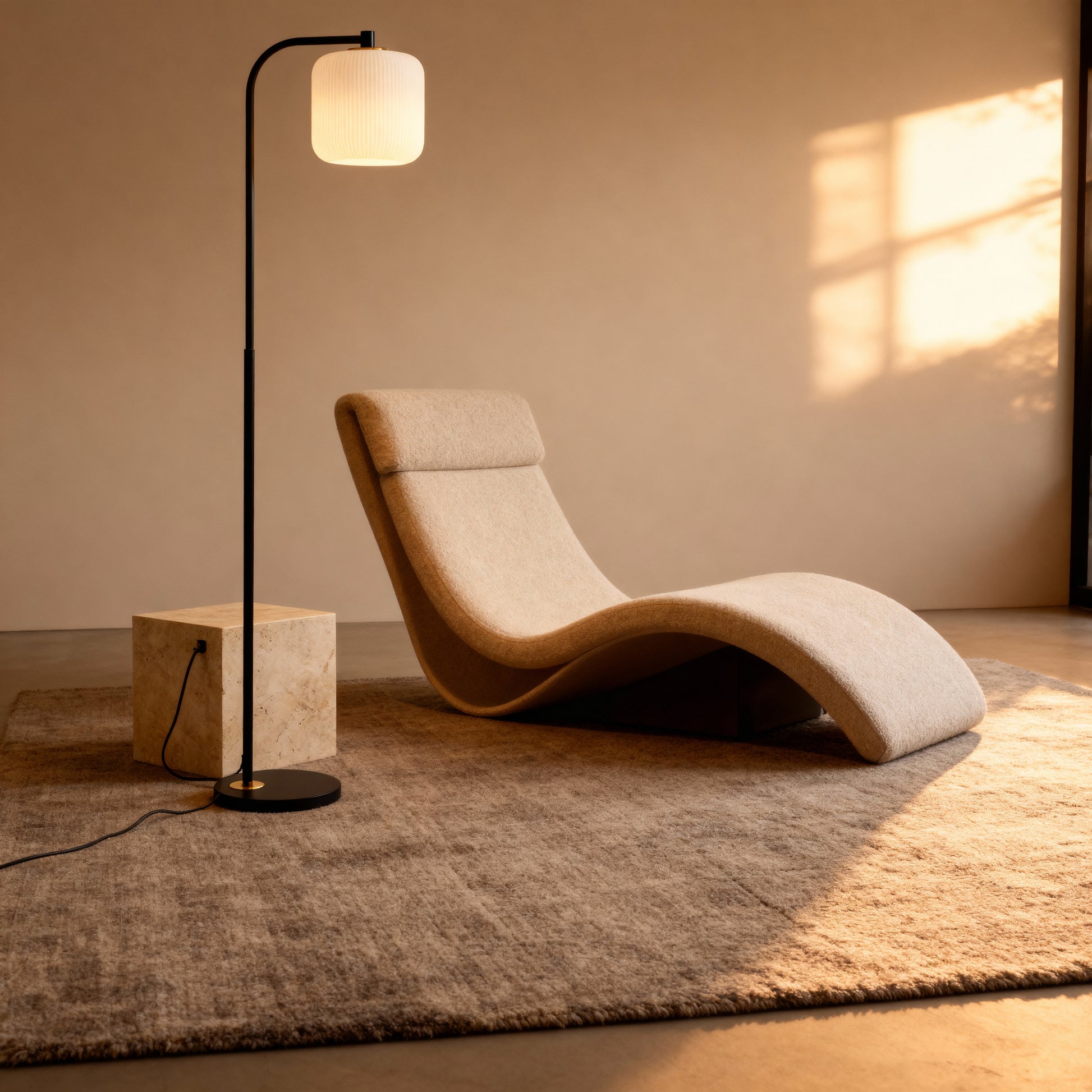 A slender arc and pleated shade bring warm, understated character to sofas, chairs, and bedsides.
